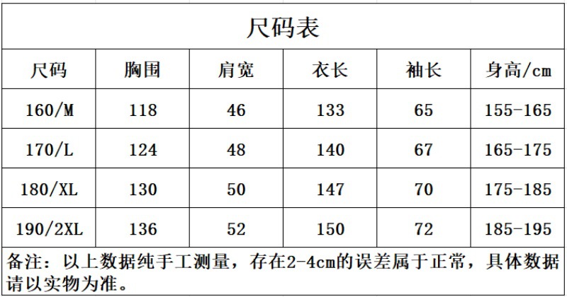 150(S); 160cm(M); 170cm(L); 180cm(XL); 190cm(2XL)