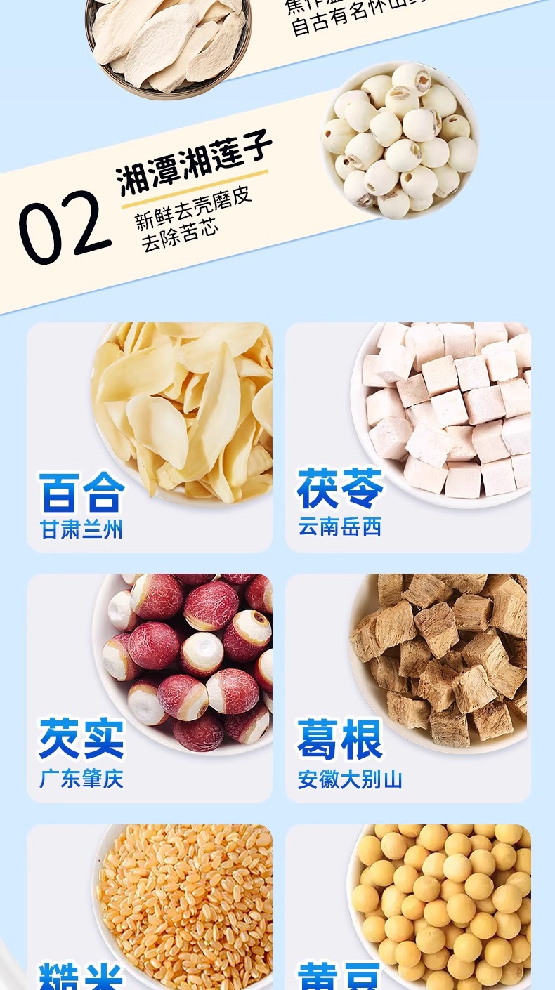 Коричневый рис, миндаль, ямс, лилия, корень кудзу, пория, семена лотоса, соя, гурдон, мальтодекстрин, мальтодекстрин.
