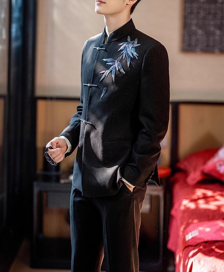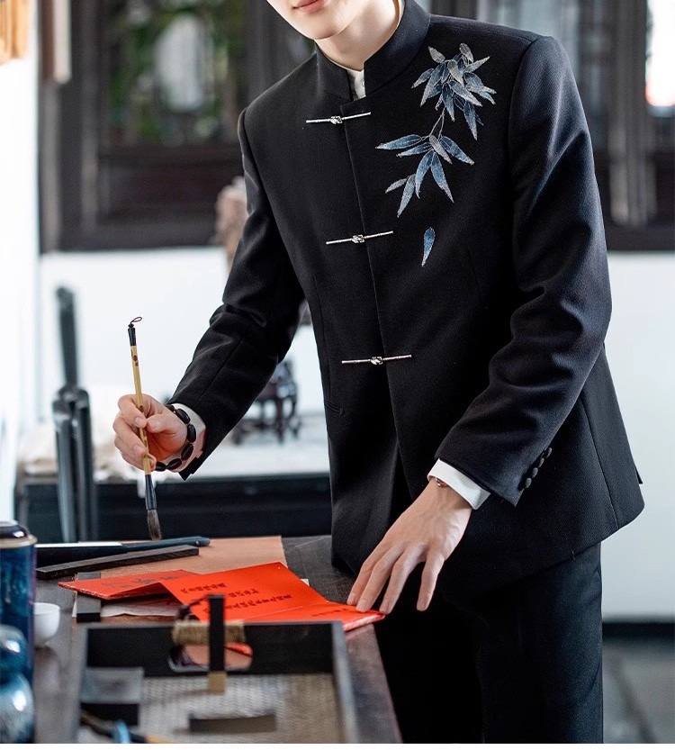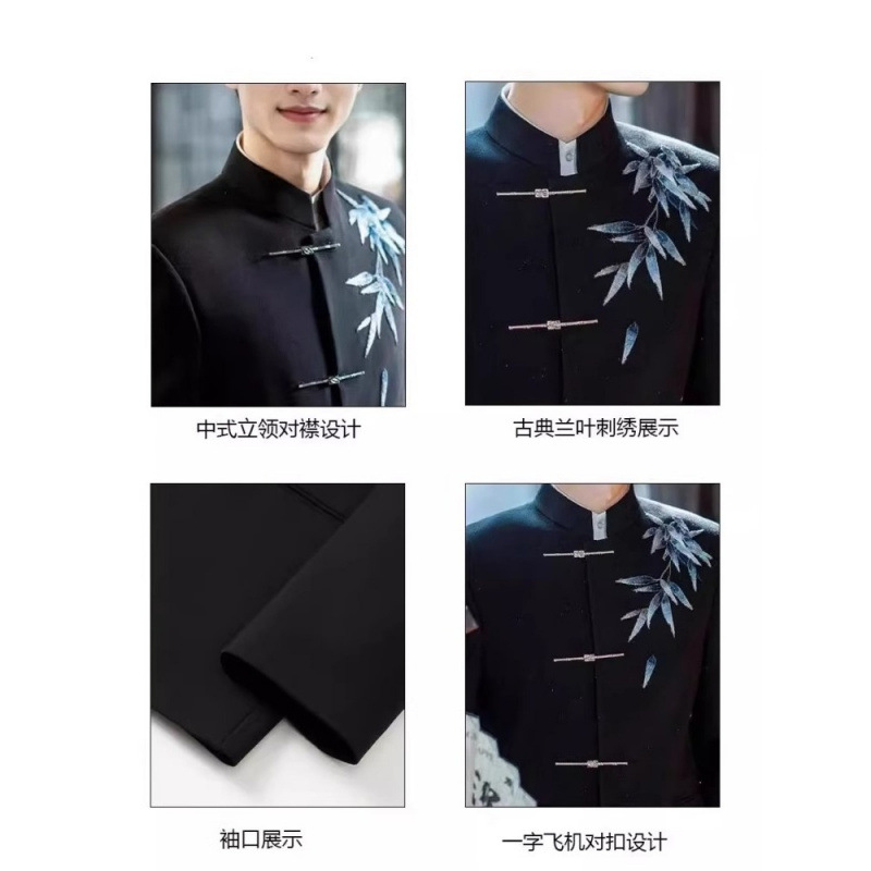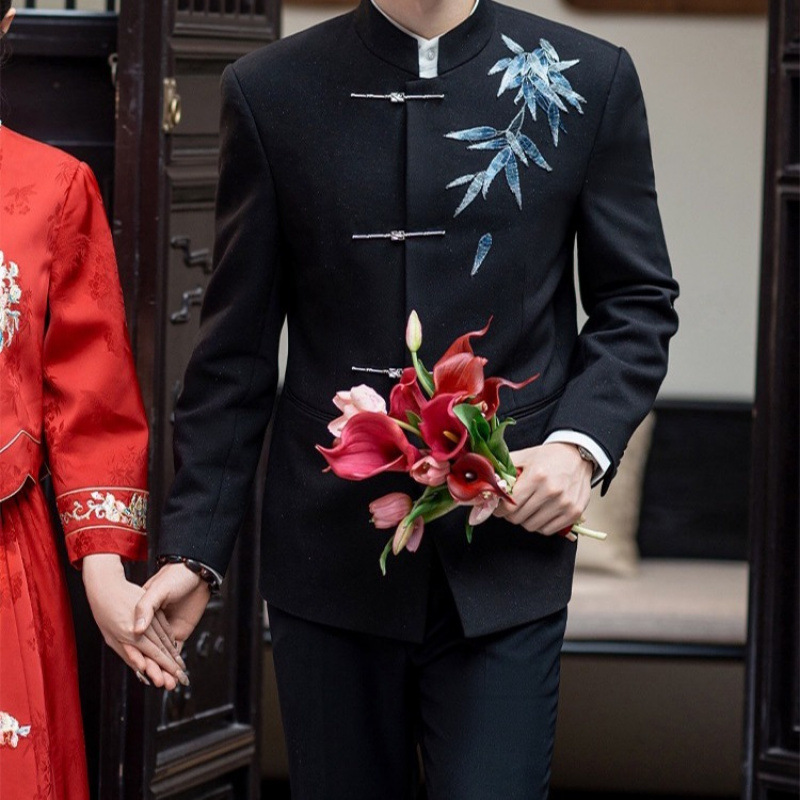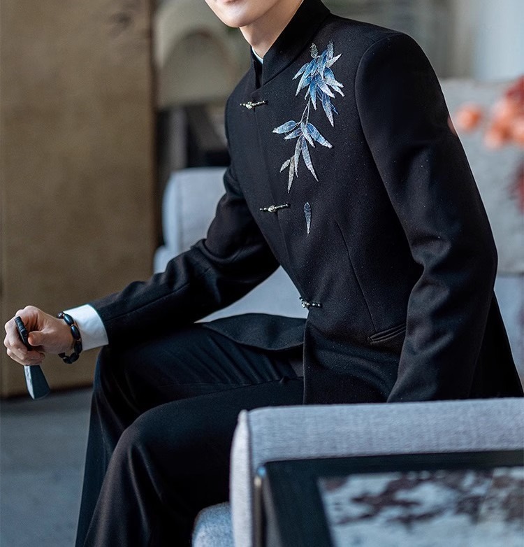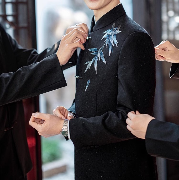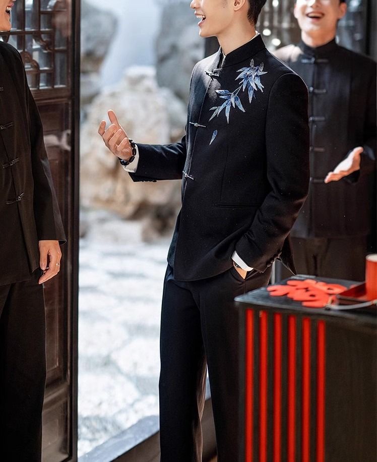 Мужской черный пиджак в китайском стиле с воротником-стойкой и бамбуковой вышивкой для помолвки и свадьбы.