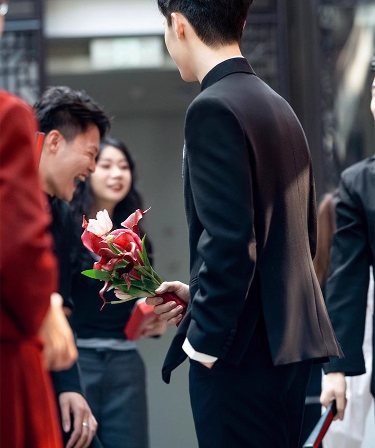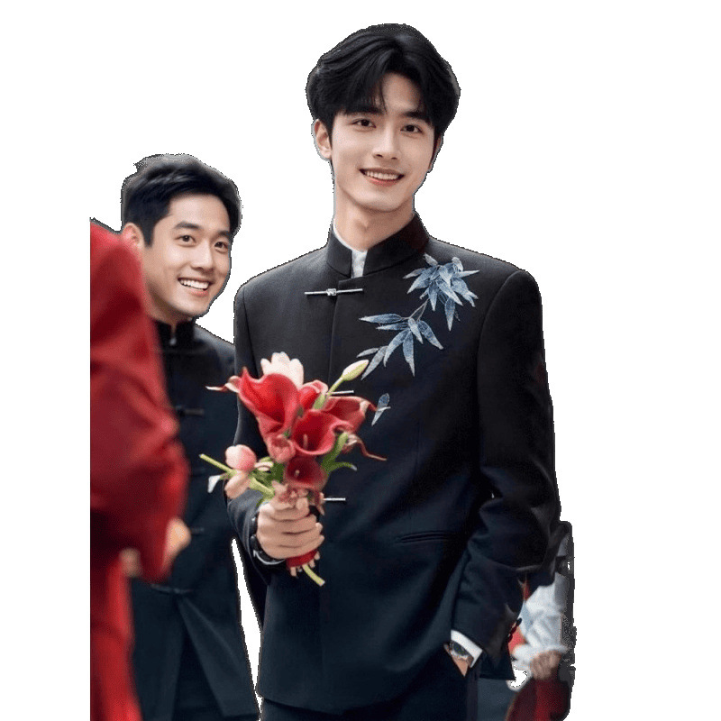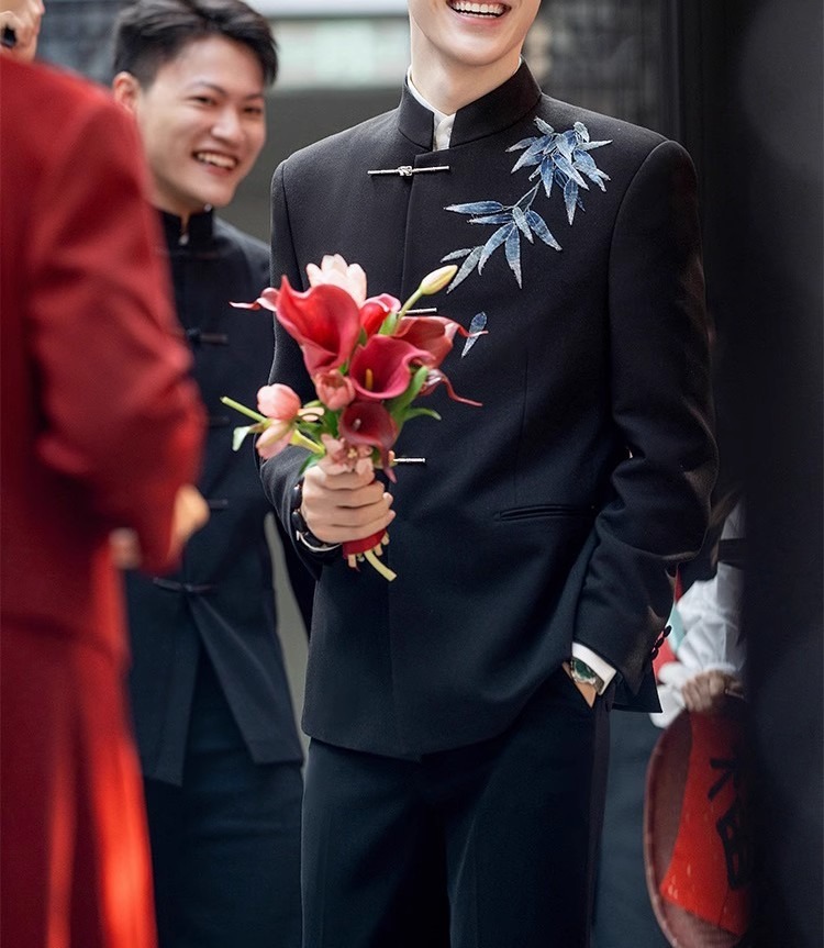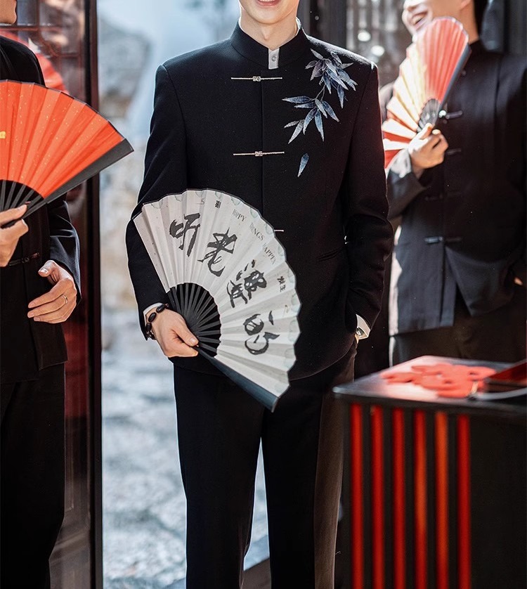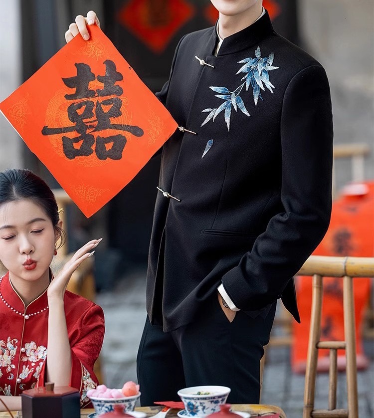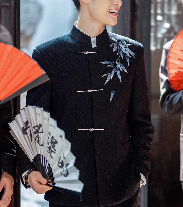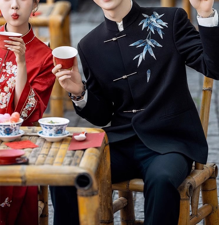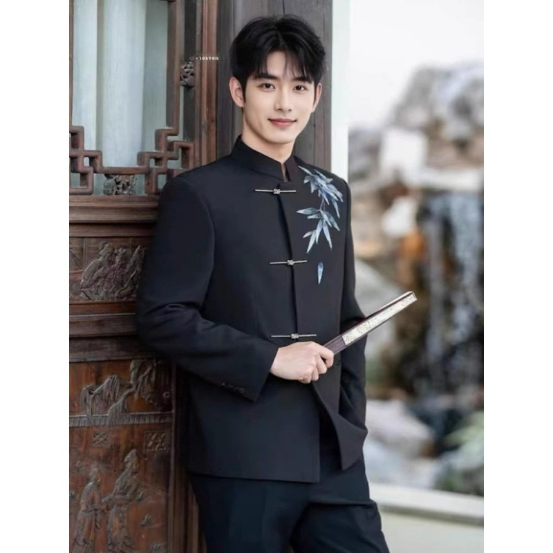 Мужской черный пиджак в китайском стиле с воротником-стойкой и бамбуковой вышивкой для помолвки и свадьбы.