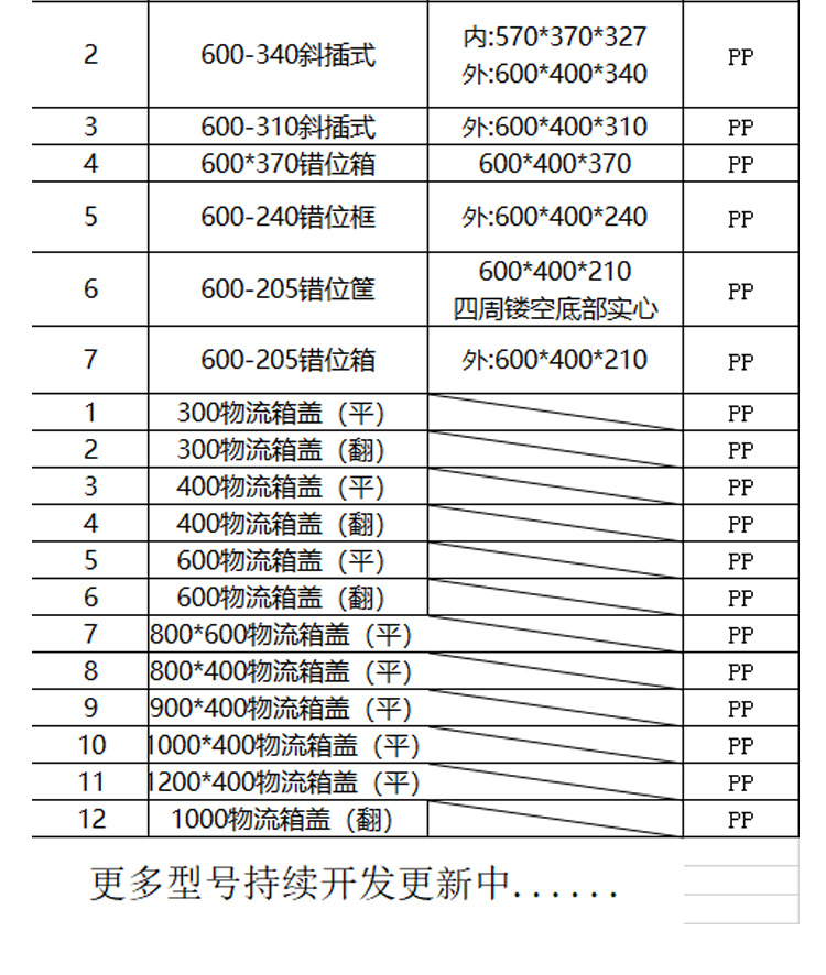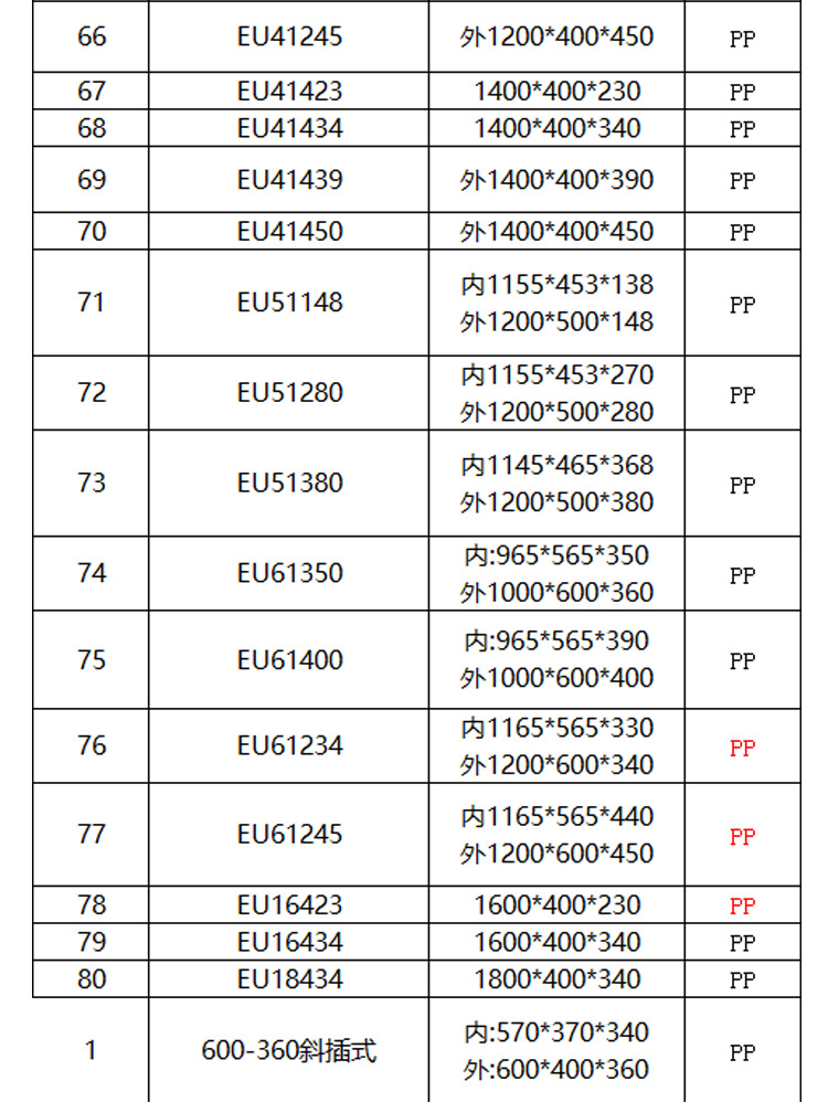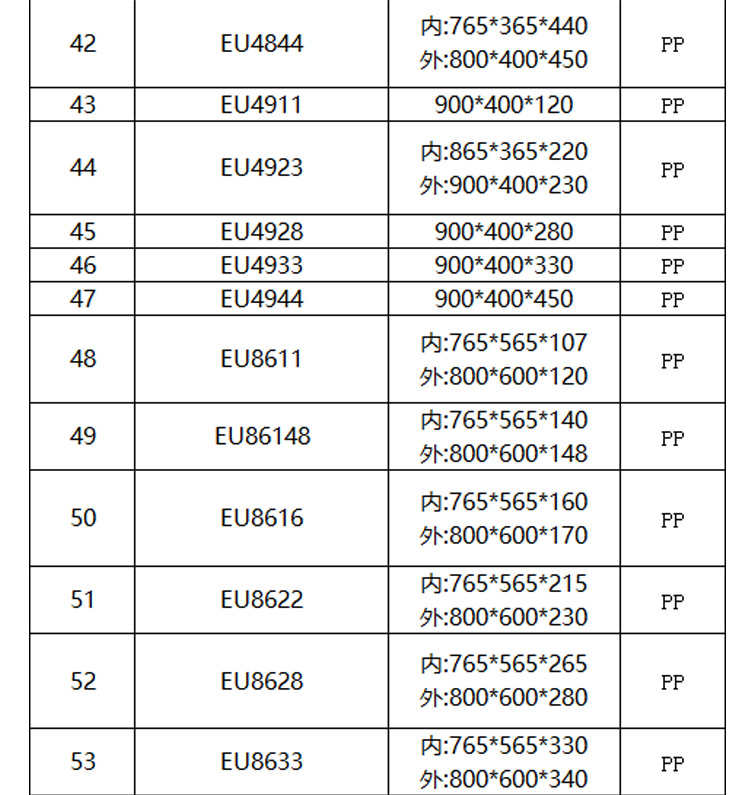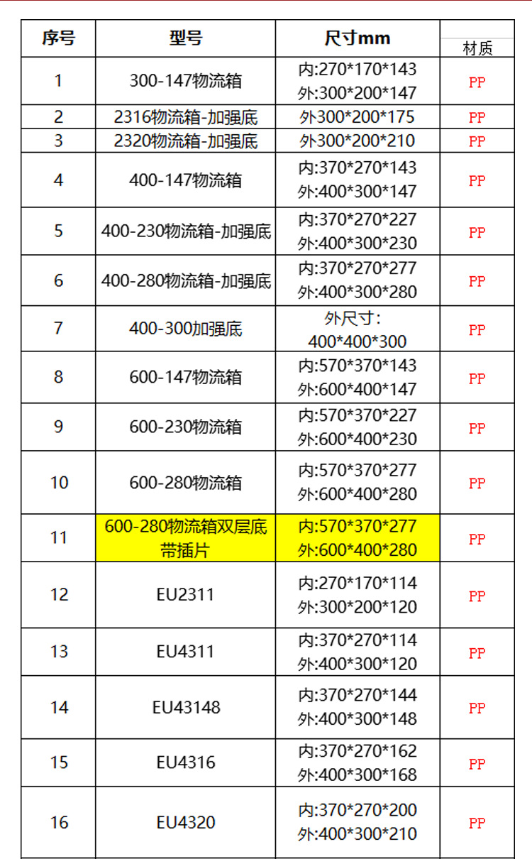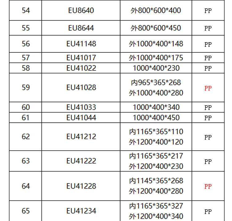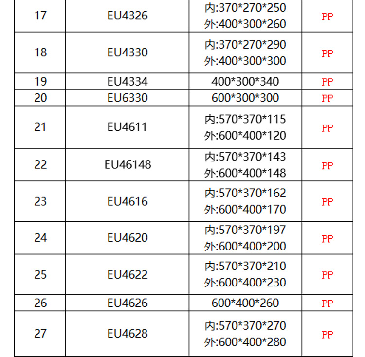 300-147 Логистическая коробка Внутри: 270*170*143 Снаружи: 300*200*147; 2316 Логистический ящик — усиленное дно Снаружи 300*200*175; 2320 Логистический ящик — усиленное дно Снаружи 300*200*210; 400-147 Логистический бокс Внутри: 370*270*143 Снаружи: 400*300*147; 400-230 логистический короб с усиленным дном Внутри: 370*270*227 Снаружи: 400*300*230; 400-280 логистический короб с усиленным дном Внутренний: 370*270*277 Внешний: 400*300*280; 400-300 усиленное дно Внешний размер: 400*400*300; 600-147 Логистический бокс Внутри: 570*370*143 Снаружи: 600*400*147; 600-230 логистический бокс Внутри: 570*370*227 Снаружи: 600*400*230"; 600-280 логистический бокс Внутри: 570*370*277 Снаружи: 600*400*280; 600-280 логистический короб с двойным дном и вставками Внутри: 570*370*277 Снаружи: 600*400*280; ЕС 2311 Внутри: 270*170*114 Снаружи: 300*200*120; ЕС 4311 Внутренний: 370*270*114 Внешний: 400*300*120; ЕС 43148 Внутри: 370*270*144 Снаружи: 400*300*148; ЕС 4316 Внутренний: 370*270*162 Внешний: 400*300*168; ЕС 4320 Внутренний: 370*270*200 Внешний: 400*300*210; ЕС 4326 Внутренний: 370*270*250 Внешний: 400*300*260; ЕС 4330 Внутри: 370*270*290 Снаружи: 400*300*300; EU4334 400*300*340; EU6330 600*300*300; ЕС 4611 Внутри: 570*370*115 Снаружи: 600*400*120; ЕС 46148 Внутри: 570*370*143 Снаружи: 600*400*148; ЕС 4616 Внутри: 570*370*162 Снаружи: 600*400*170; ЕС 4620 Внутри: 570*370*197 Снаружи: 600*400*200; ЕС 4622 Внутри: 570*370*210 Снаружи: 600*400*230; EU4626 600*400*260; ЕС 4628 Внутри: 570*370*270 Снаружи: 600*400*280; ЕС 4630 Внутри: 570*370*290 Снаружи: 600*400*300; ЕС 4633 Внутри: 570*370*327 Снаружи: 600*400*340; EU4633 двойной угловой короб с двойным дном Внутри: 570*370*327 Снаружи: 600*400*340; ЕС 4635 Внутри: 570*370*340 Снаружи: 600*400*360; EU4640 600*400*400; EU4644 600*400*450; 6540 600*500*400; EU6630 600*600*300; EU6636 600*600*360; ЕС 4811 Внутри: 765*365*165 Снаружи: 800*400*120; ЕС 48148 Внутри: 765*365*140 Снаружи: 800*400*148; ЕС 4816 Внутри: 765*365*165 Снаружи: 800*400*175; ЕС 4822 Внутри: 765*365*217 Снаружи: 800*400*230; ЕС 4828 Внутри: 765*365*270 Снаружи: 800*400*280; ЕС 4833 Внутри: 765*365*327 Снаружи: 800*400*340; ЕС 4844 Внутри: 765*365*440 Снаружи: 800*400*450; EU4911 900*400*120; ЕС 4923 Внутри: 865*365*220 Снаружи: 900*400*230; EU4928 900*400*280; EU4933 900*400*330; EU4944 900*400*450; ЕС 8611 Внутри: 765*565*107 Снаружи: 800*600*120; ЕС 86148 Внутри: 765*565*140 Снаружи: 800*600*148; ЕС 8616 Внутри: 765*565*160 Снаружи: 800*600*170; ЕС 8622 Внутри: 765*565*215 Снаружи: 800*600*230; ЕС 8628 Внутри: 765*565*265 Снаружи: 800*600*280; ЕС 8633 Внутри: 765*565*330 Снаружи: 800*600*340; ЕС 8640 Снаружи 800*600*400; ЕС 8644 Снаружи 800*600*450; ЕС 41148 Снаружи 1000*400*148; ЕС 41017 Снаружи 1000*400*175; EU41022 1000*400*230; ЕС 41028 Внутри 965*365*268 Снаружи 1000*400*280; EU41033 1000*400*340; EU41044 1000*400*450; ЕС 41212 Внутри 1165*365*110 Снаружи 1200*400*120; ЕС 41222 Внутри 1165*365*217 Снаружи 1200*400*230; ЕС 41228 Внутри 1145*365*268 Снаружи 1200*400*280; ЕС 41234 Внутри 1165*365*327 Снаружи 1200*400*340; ЕС 41245 Снаружи 1200*400*450; EU41423 1400*400*230; EU41434 1400*400*340; ЕС 41439 Снаружи 1400*400*390; ЕС 41450 Снаружи 1400*400*450; ЕС 51148 Внутри 1155*453*138 Снаружи 1200*500*148; ЕС 51280 Внутри 1155*453*270 Снаружи 1200*500*280; ЕС 51380 Внутри 1145*465*368 Снаружи 1200*500*380; ЕС 61350 Внутри: 965*565*350 Снаружи 1000*600*360; ЕС 61400 Внутри: 965*565*390 Снаружи 1000*600*400; ЕС 61234 Внутри 1165*565*330 Снаружи 1200*600*340; ЕС 61245 Внутри 1165*565*440 Снаружи 1200*600*450; EU16423 1600*400*230; EU16434 1600*400*340; EU18434 1800*400*340; 600-360 наклонный модульный тип Внутри: 570*370*340 Снаружи: 600*400*360; 600-340 наклонный модульный тип Внутри: 570*370*327 Снаружи: 600*400*340; 600-310 наклонный модульный тип Снаружи: 600*400*310; 600*370 неровная коробка 600*400*370; 600-240 смещённая рамка Снаружи: 600*400*240; 600-205 неровная корзина "600*400*210 полый по краям и с цельным дном"; 600-205: Несоответствие коробки Снаружи: 600*400*210; 300 крышка логистического ящика (плоская); 300 крышка логистического ящика (перевернуть); 400 крышка логистического ящика (плоская); 400 крышка логистического ящика (переворот); Крышка логистического ящика 600 (плоская); Крышка логистического ящика 600 (перевернутая); Крышка логистического ящика 800*600 (плоская); Крышка логистического 