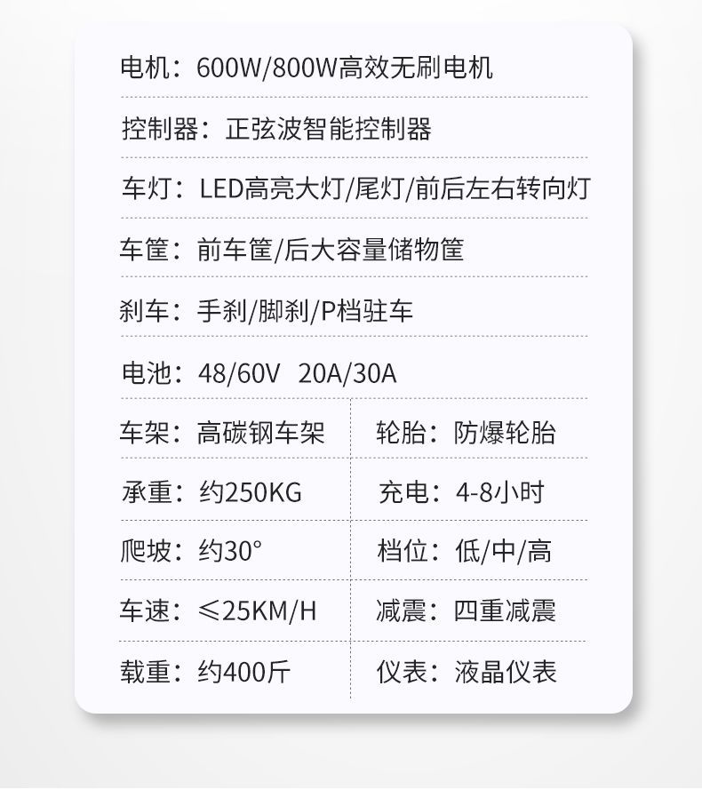 600-ваттный, 48-вольтовый автомобильный литиевый аккумулятор, запас хода примерно 100 миль (18 миль в час на низкоскоростном транспортном средстве).; 1200 Вт, 60 В автомобильный литий-ионный аккумулятор, запас хода примерно 180 миль (при низкой скорости 18 миль/ч).; Аккумулятор Chaowei 48В 12А мощностью 1000 Вт+, запас хода примерно 40 миль.; 1000 Вт+ Chaowei 48В 20А, запас хода примерно 70 миль.; Аккумулятор Chaowei 48В 22А мощностью 1000 Вт+, запас хода примерно 80 миль.; 120-ваттный свинцово-кислотный аккумулятор Chaowei на 60 вольт, запас хода 110 миль; 1200 Вт Chaowei Graphene 60 В, запас хода 120 миль; 600-ваттный свинцово-кислотный аккумулятор Chaowei на 60 вольт, запас хода 140 миль; 100 Вт Супермощный Графен 60 В, Запас хода 128 миль; 1000 Вт+ литиевая батарея 48В25А, около 40 километров; 1000 Вт+ литиевая батарея 60В25А, около 55 километров; Мотор 1000 Вт + литиевая батарея 60В25А; 【Король подъемов】Сверхмощный свинцово-кислотный аккумулятор 60В 1000Вт, запас хода около 55 километров; 1200-ваттный мотор, литиевая автомобильная батарея 60В 30А; Мотор 1200 Вт + автомобильный литий-ионный аккумулятор 60 В 40 А; Четырехколесный электросамокат, 1000 Вт (базовая модель) — аккумулятор и зарядное устройство в комплект не входят.; Литиевая батарея 1000 Вт, 72 В, 35 А