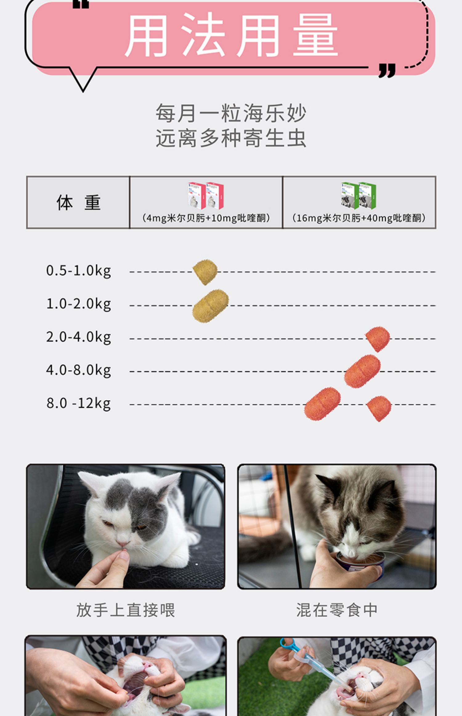 Хилемиао 56 мг (> 2–8 кг); Хилемиао 14 мг (> 0,5–2 кг); Котенок (Дапао 15 мг 1 таблетка + Хайлемяо 14 мг 1 таблетка); Взрослый кот (Дапет 45 мг 1 таблетка + Хилемиао 56 мг 1 таблетка)