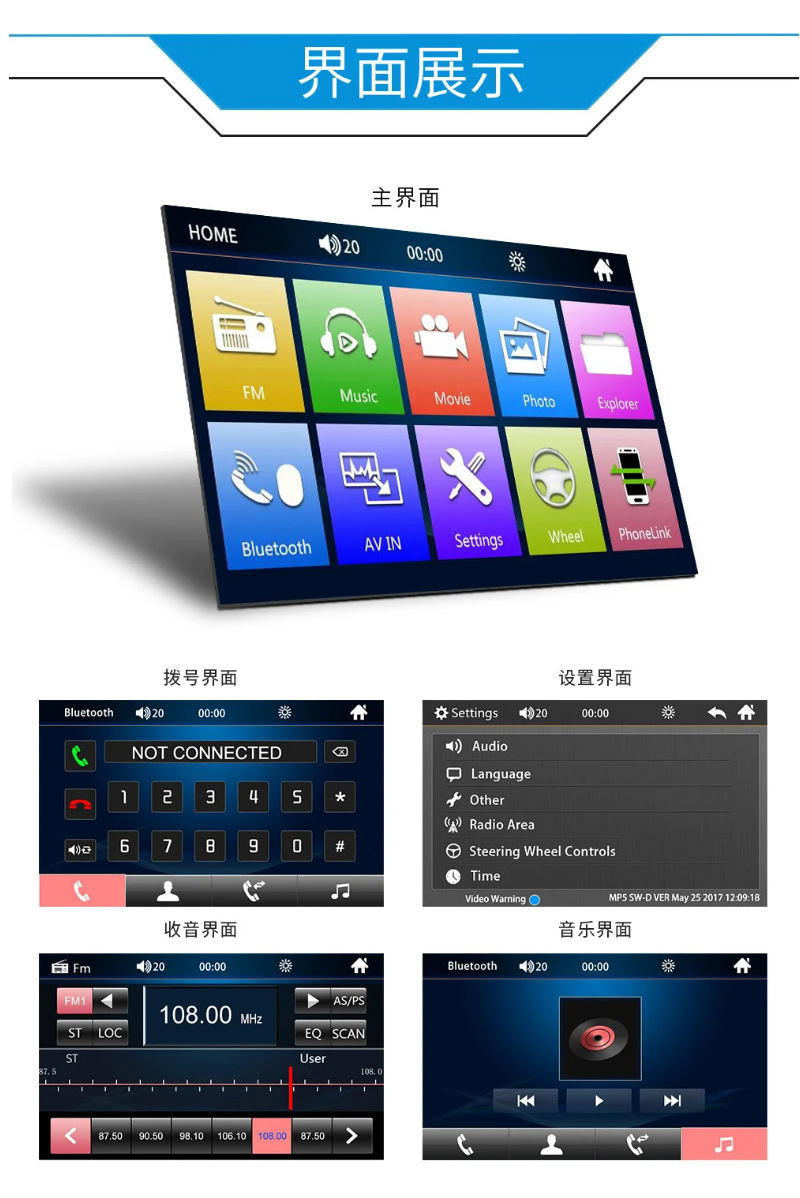 Подключение мобильного телефона, задний вид задним ходом, медиаплеер Bluetooth, FM-радио, изображение заднего вида USB