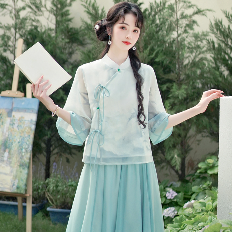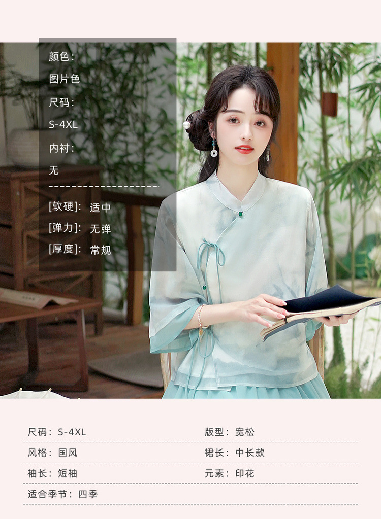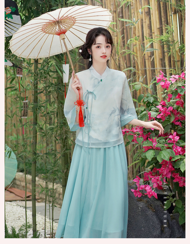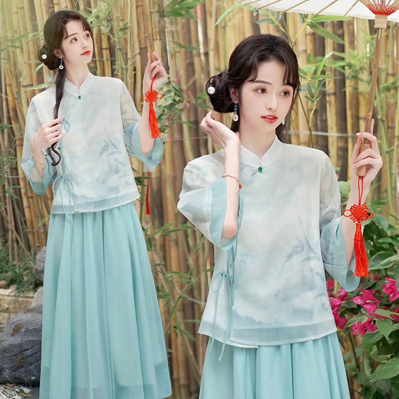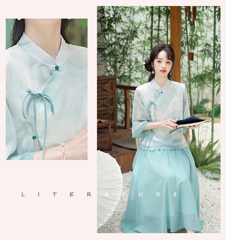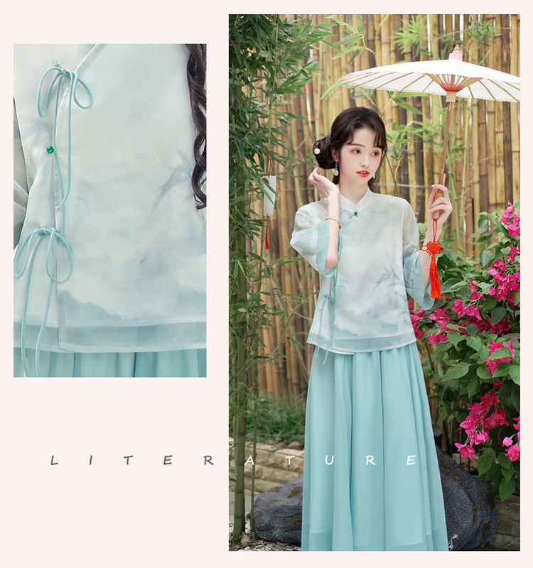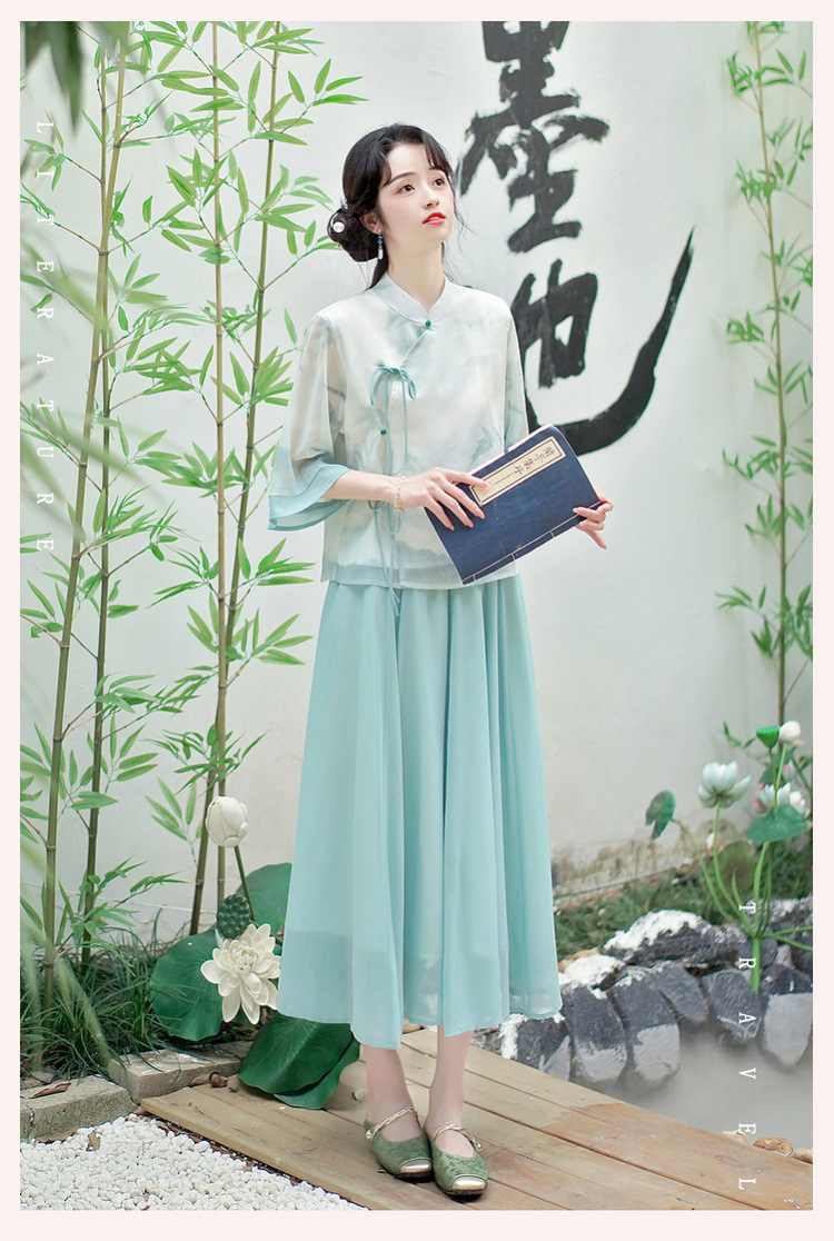 Настоящая фотография оригинальной новой блузки в китайском стиле с рукавами три четверти и художественной юбкой на шнуровке. Костюм Bamboo Leaf Story.