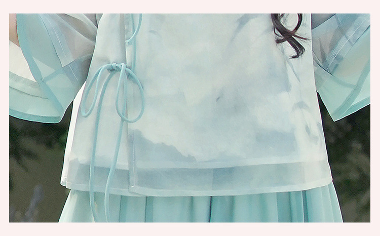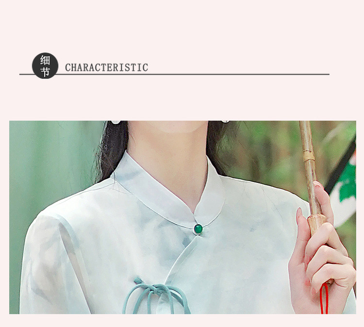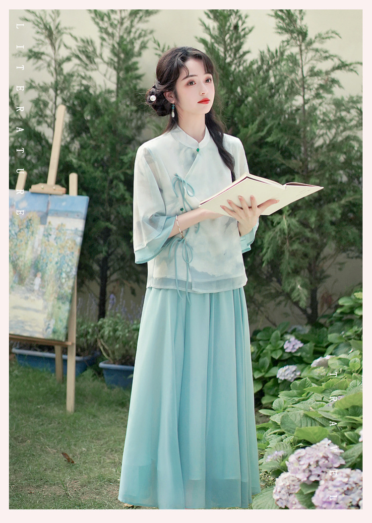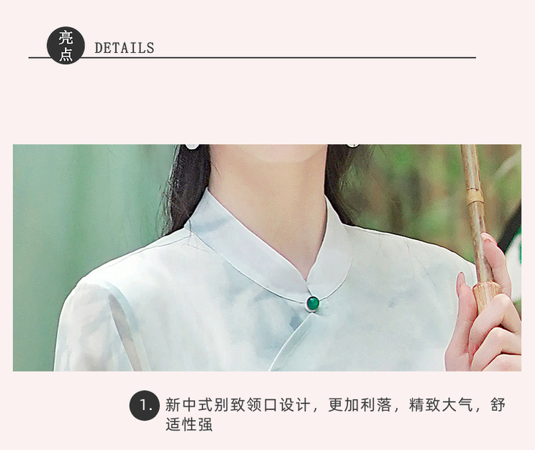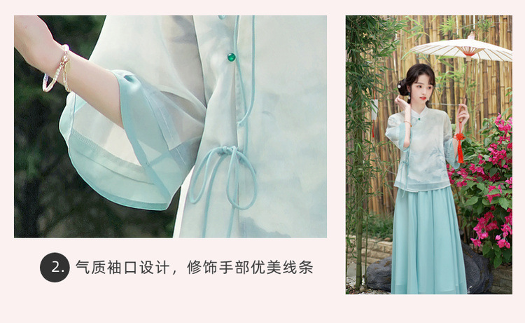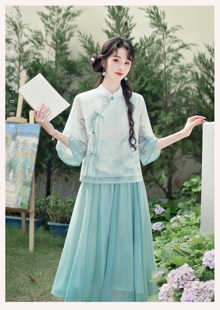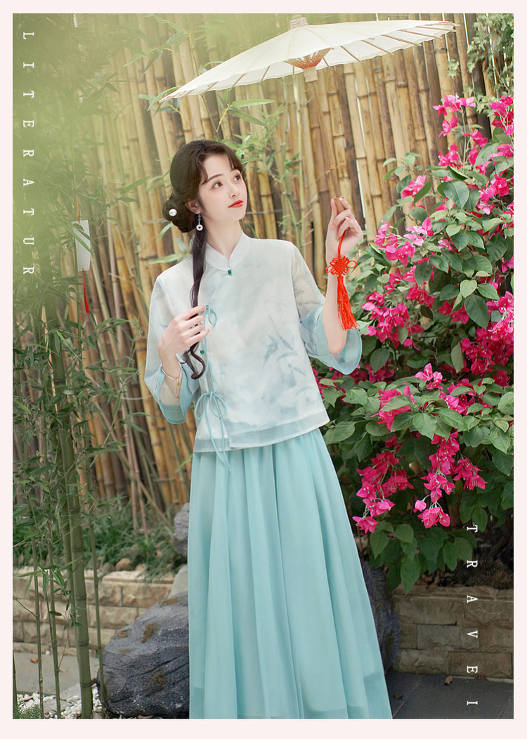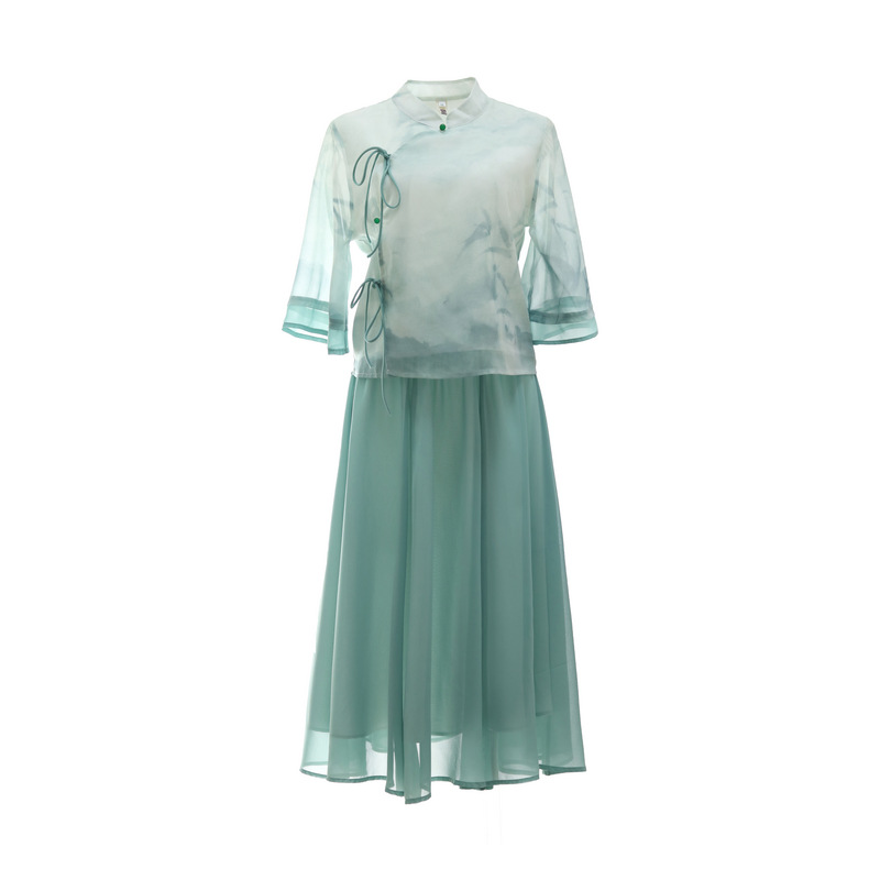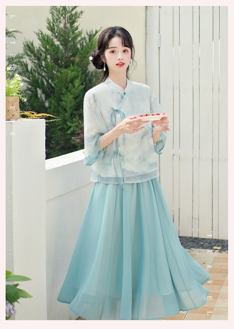 Настоящая фотография оригинальной новой блузки в китайском стиле с рукавами три четверти и художественной юбкой на шнуровке. Костюм Bamboo Leaf Story.
