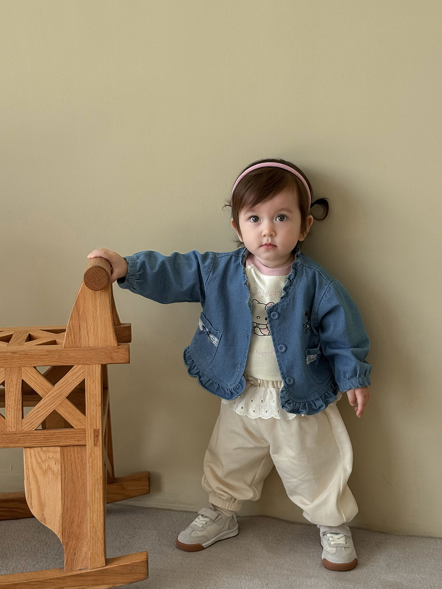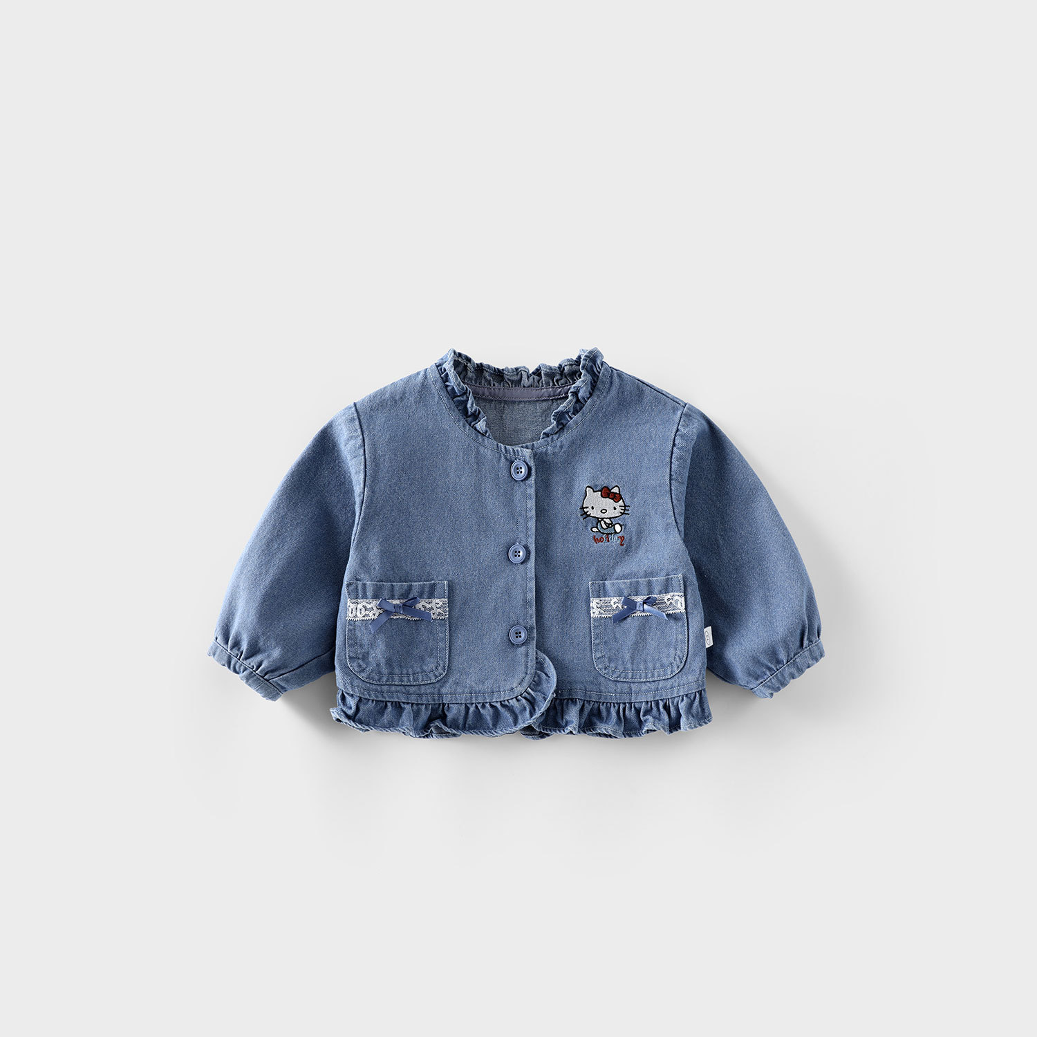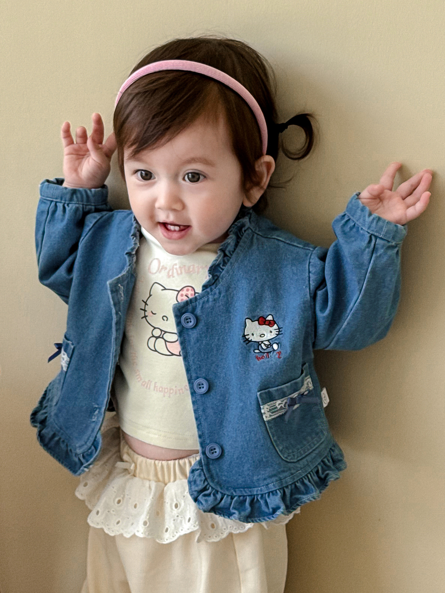 Джинсовая синяя куртка; Розовая футболка с котом; Mi Xing кружевные брюки с застежкой; Предпродажная футболка с розовым котом