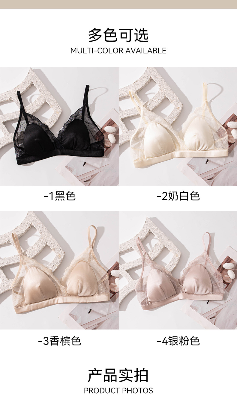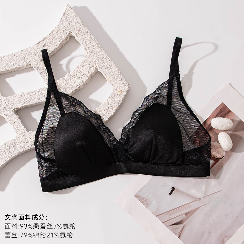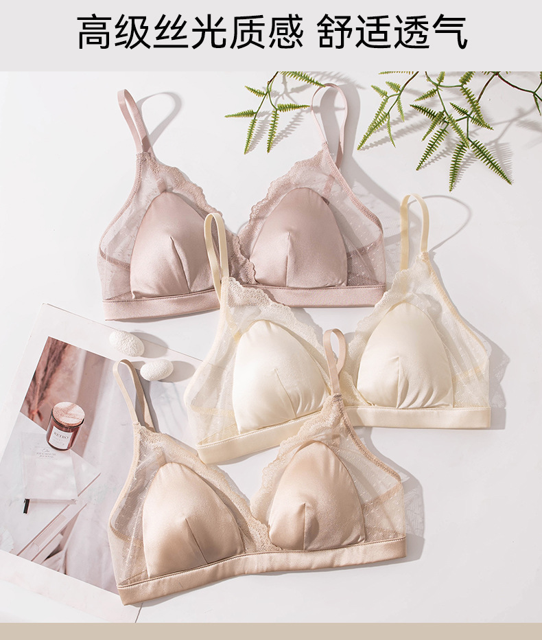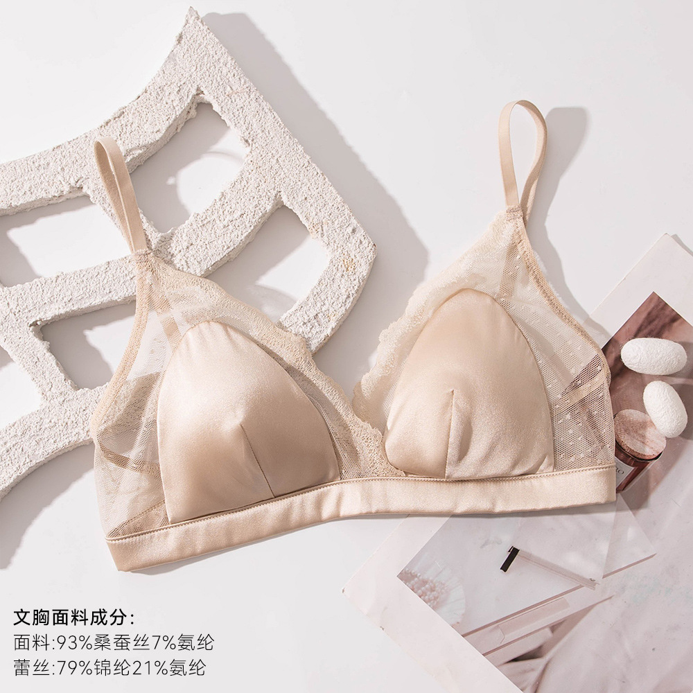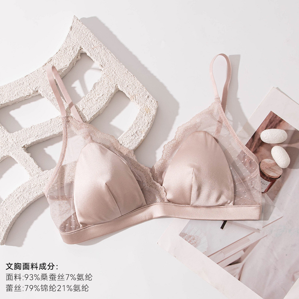 Шелковый глянцевый кружевной бюстгальтер, ультратонкий атласный бюстгальтер без косточек с маленькой грудью, треугольная чашка из шелкового шелка, французский бюстгальтер для нижнего белья