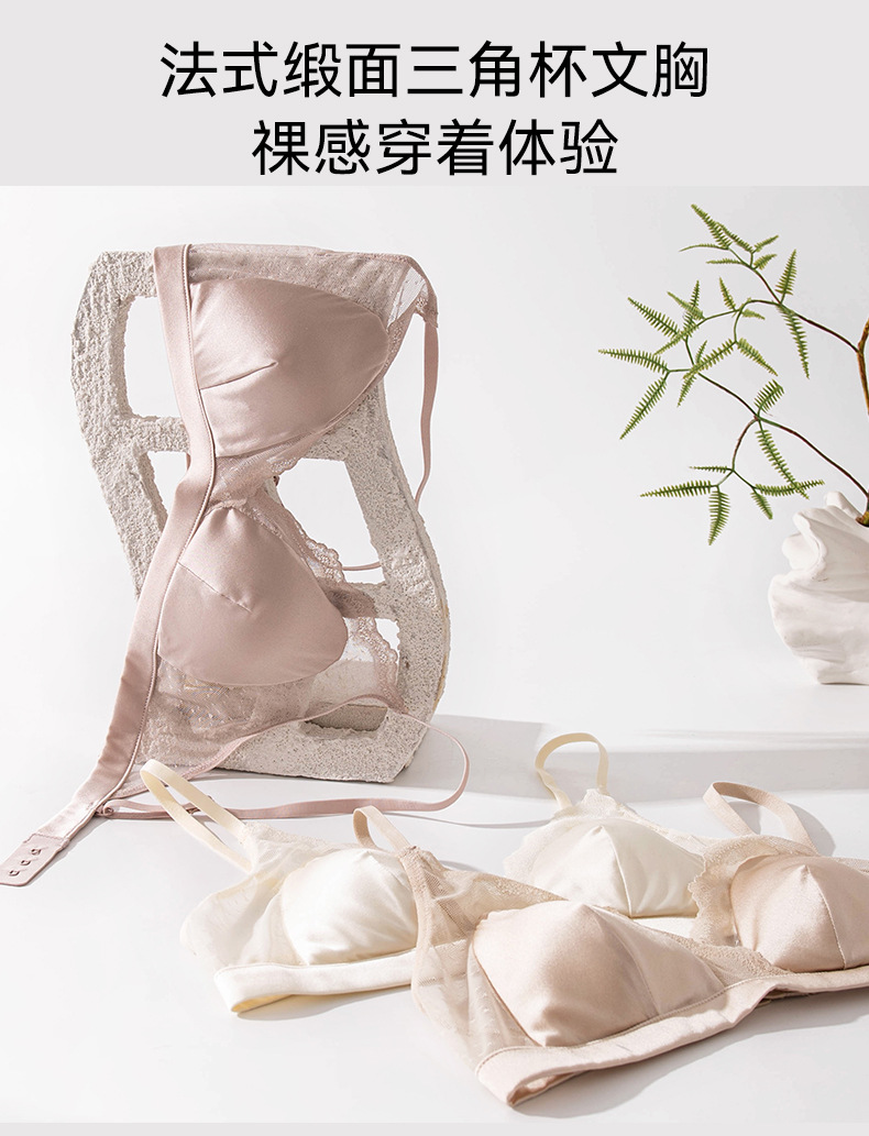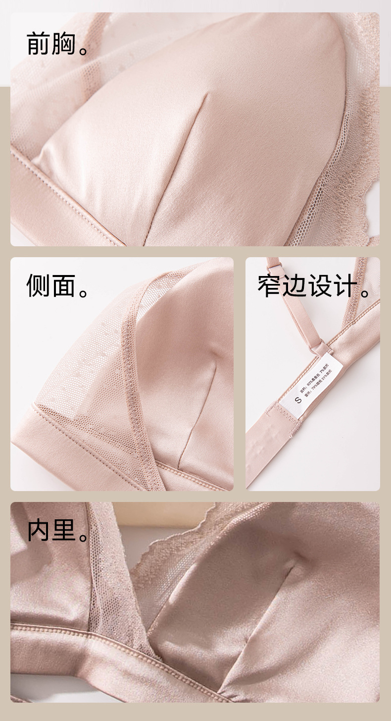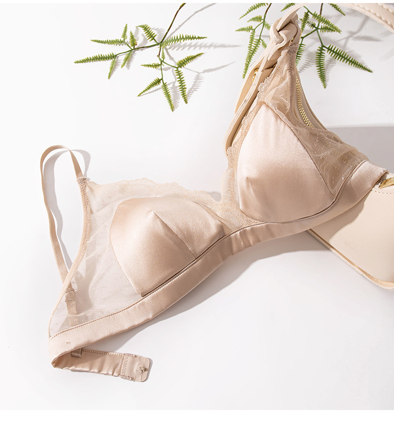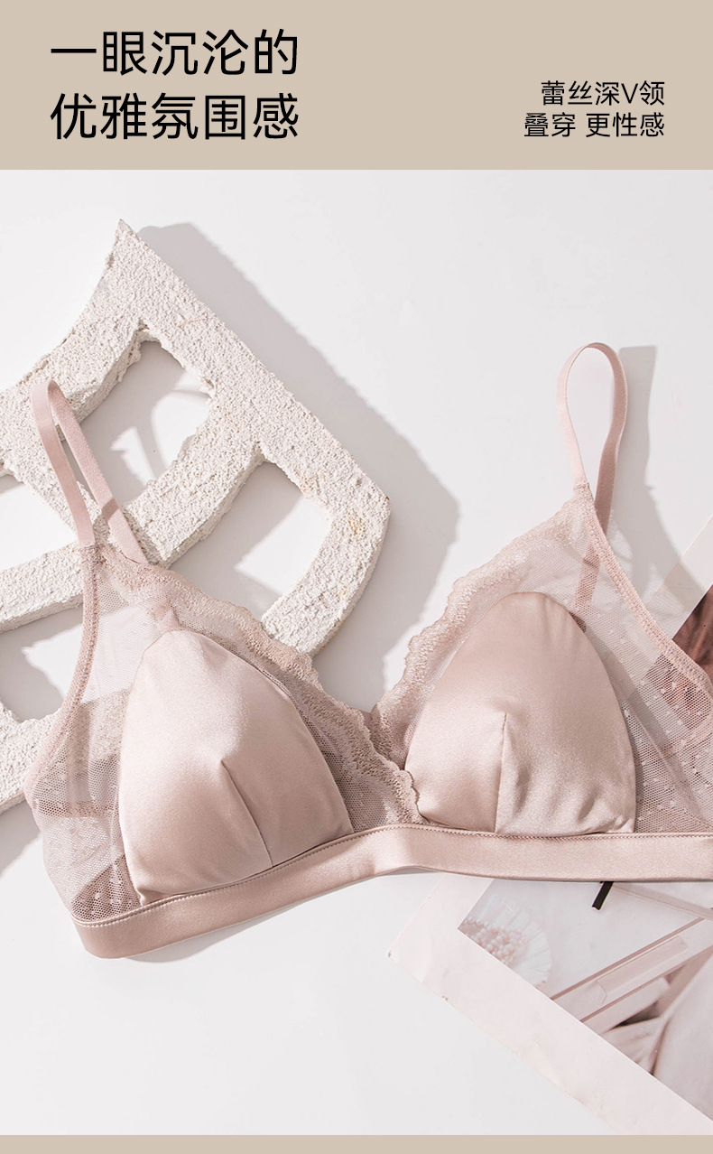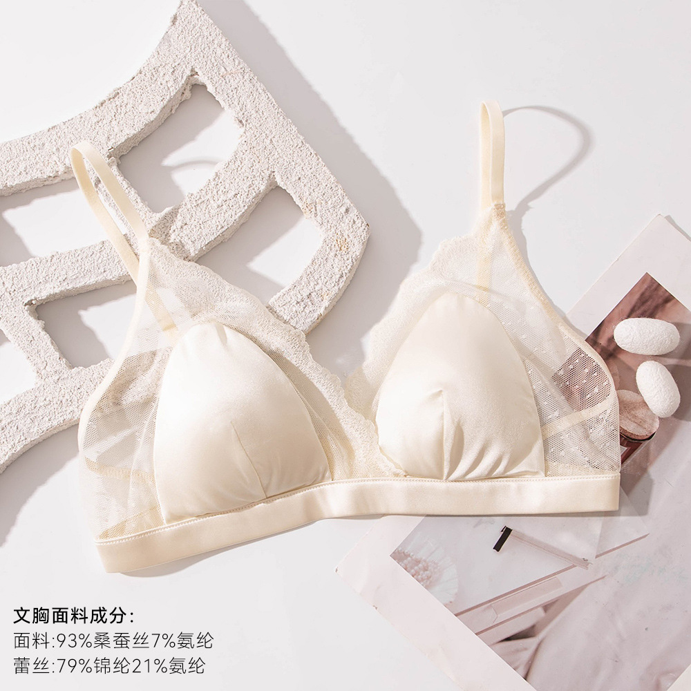 Шелковый глянцевый кружевной бюстгальтер, ультратонкий атласный бюстгальтер без косточек с маленькой грудью, треугольная чашка из шелкового шелка, французский бюстгальтер для нижнего белья