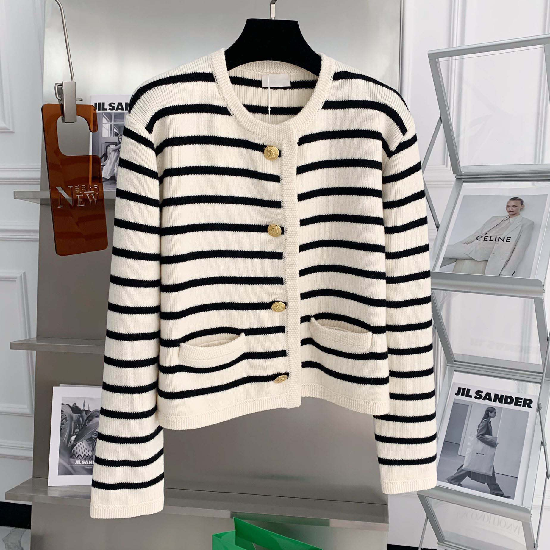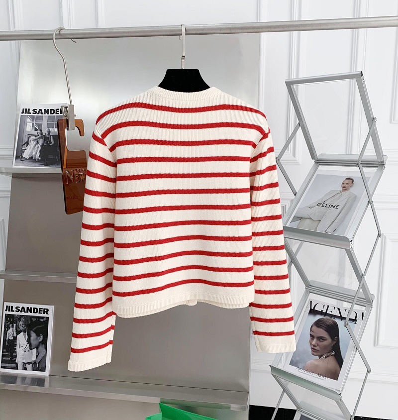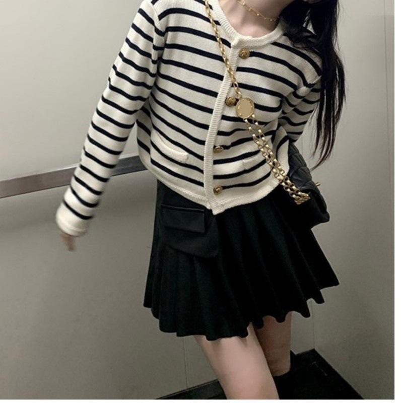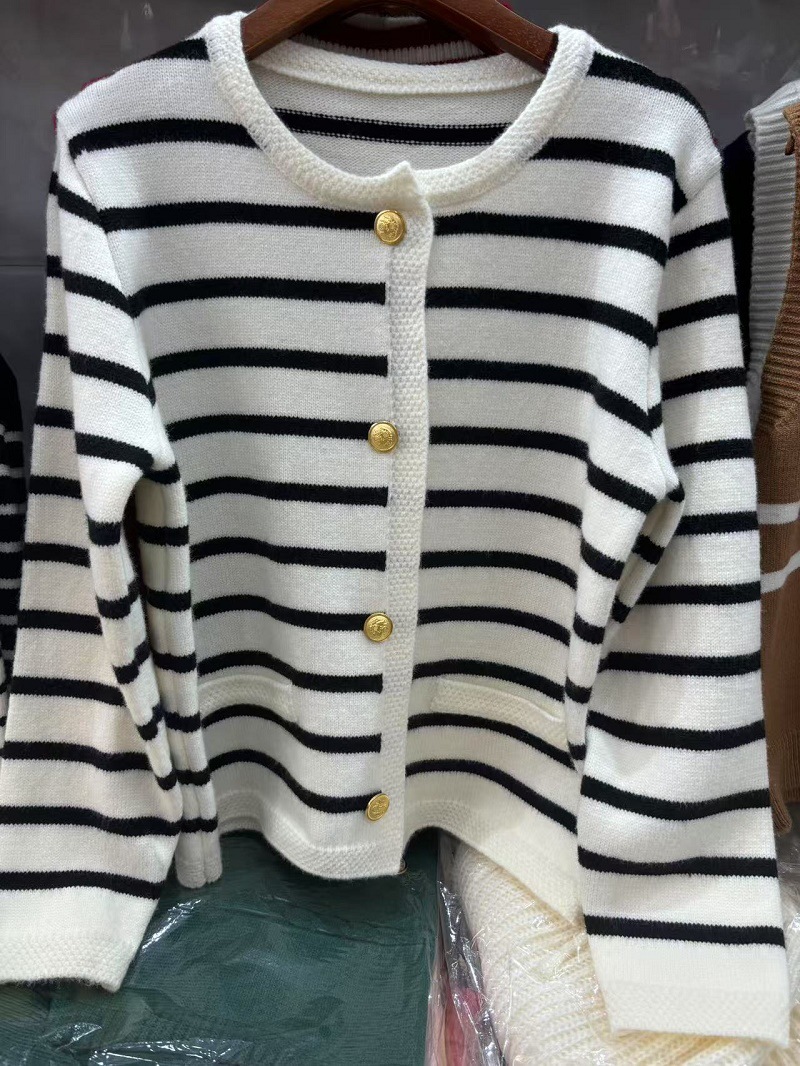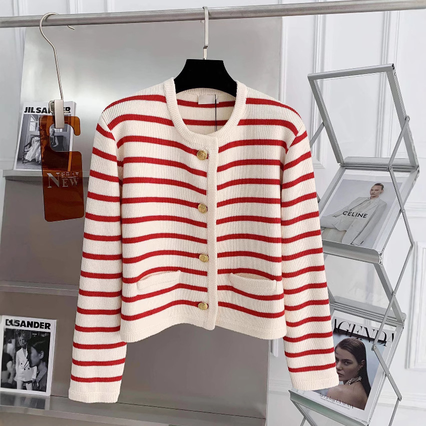 Осенне-зимний французский стиль, золотой пуговицы, контрастный полосатый вязаный кардиган, женский свободный короткий топ с круглым вырезом, свитер, куртка