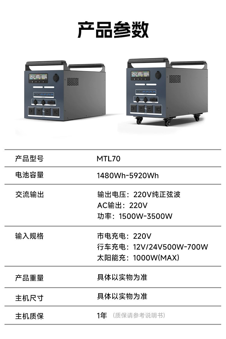 144Wh+200W; 180Wh+300W; 240Wh+300W; 360Wh+300W; 540Wh+300W; 480Wh+400W; 1500 Втч+1200 Вт (без беспроводной зарядки); 2300 Втч+1200 Вт (без беспроводной зарядки); 1500 Втч+1500 Вт (без беспроводной зарядки); 2300 Втч+2000 Вт (без беспроводной зарядки); 3000 Вт+2500 Вт (с беспроводной зарядкой); 4500 Втч+2500 Вт (с беспроводной зарядкой); 6000 Вт+2500 Вт (с беспроводной зарядкой); 3000 Вт+3000 Вт (с беспроводной зарядкой); 4500 Втч+3500 Вт (с беспроводной зарядкой); 6000 Вт+3500 Вт (с беспроводной зарядкой); 9280 Втч+3500 Вт (без беспроводной зарядки, поддерживает параллельно); 9280 Втч+5500 Вт (без беспроводной зарядки, поддерживает параллельно); 2800Wh2200W(UPS+MPPT); 4620Wh2200W(UPS+MPPT); 4620Wh+3000W(UPS+MPPT); 5600Wh+3000W(UPS+MPPT); 9000Wh+3000W(UPS+MPPT); 1500 Вт, 1200 Вт (без беспроводной зарядки) + фотоэлектрическая складная плата мощностью 200 Вт, исследовательская версия электростанции; 3000 Вт, 2500 Вт (с беспроводной зарядкой) + складная фотоэлектрическая плата мощностью 500 Вт, удаленная версия для дорожной станции; 4500 Вт, 2500 Вт (с беспроводной зарядкой) + фотоэлектрическая складная плата мощностью 500 Вт, удаленная версия для дорожной станции