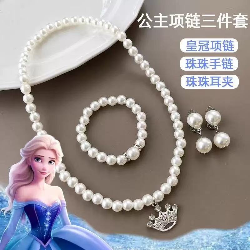 Набор украшений для девочки: браслет, клипсы для ушей, колье, 2025, новые детские украшения, корона принцессы лед и снег, имитация жемчуга