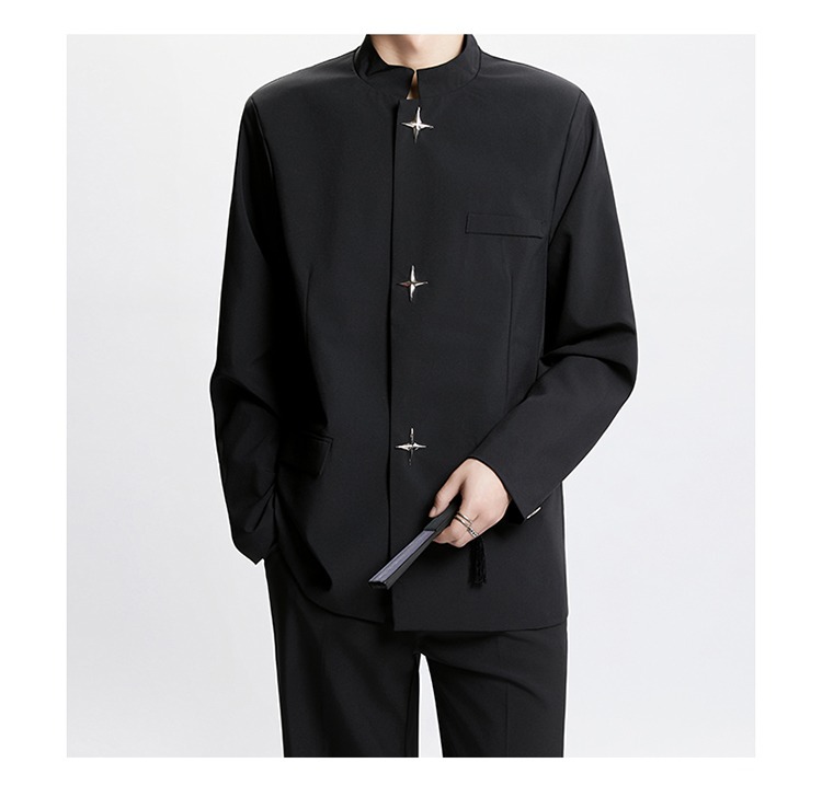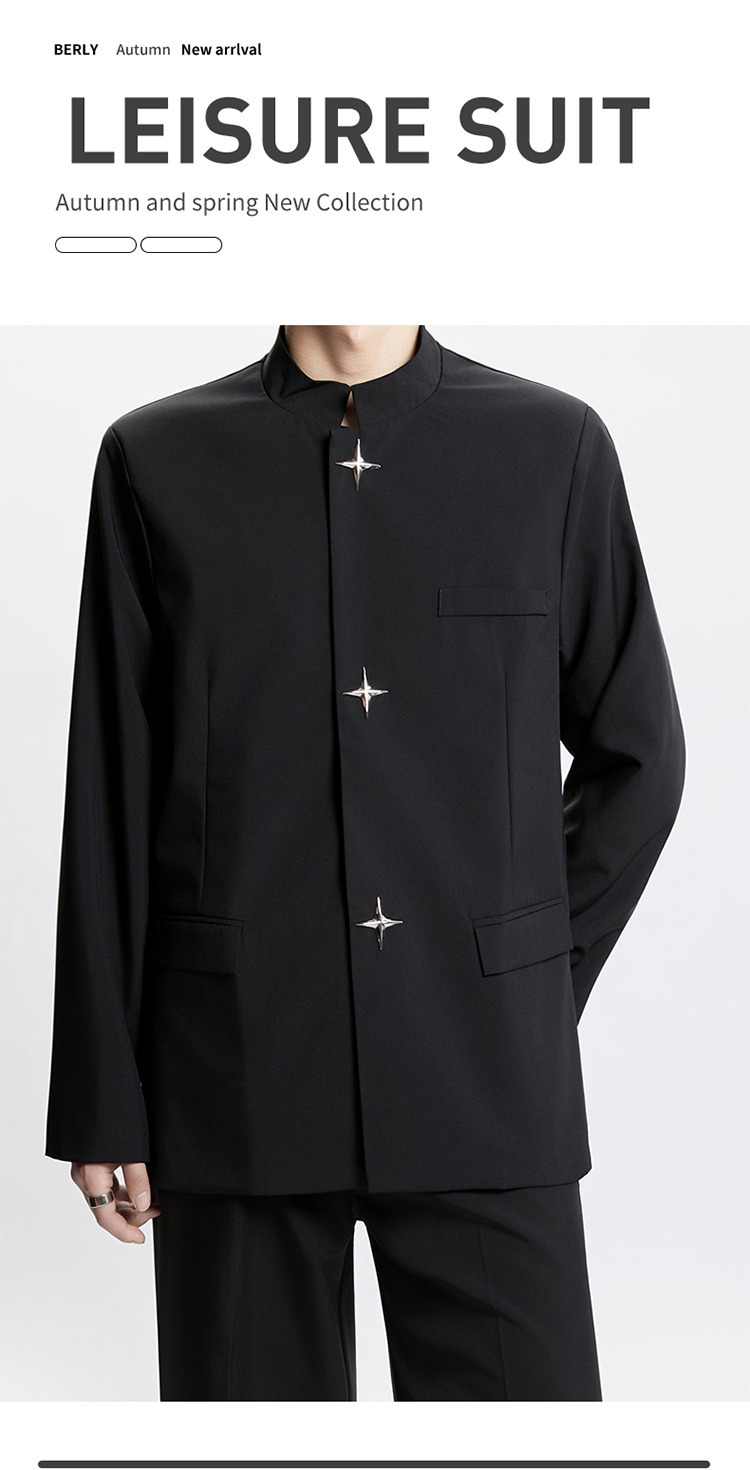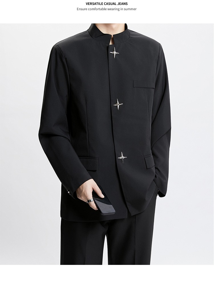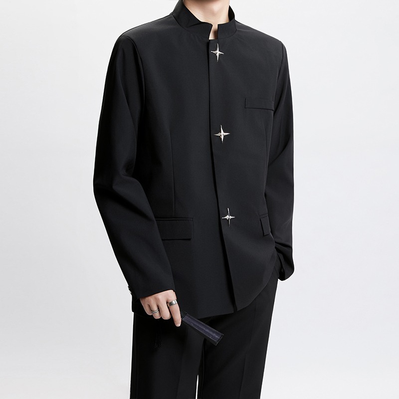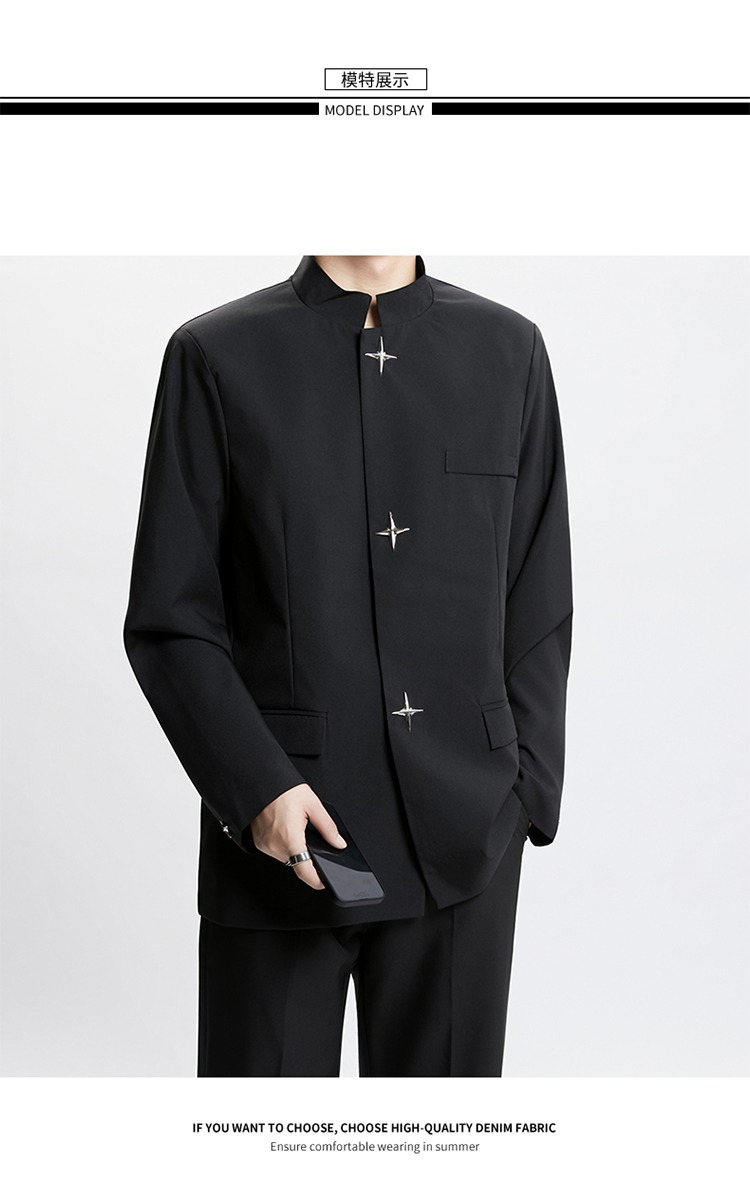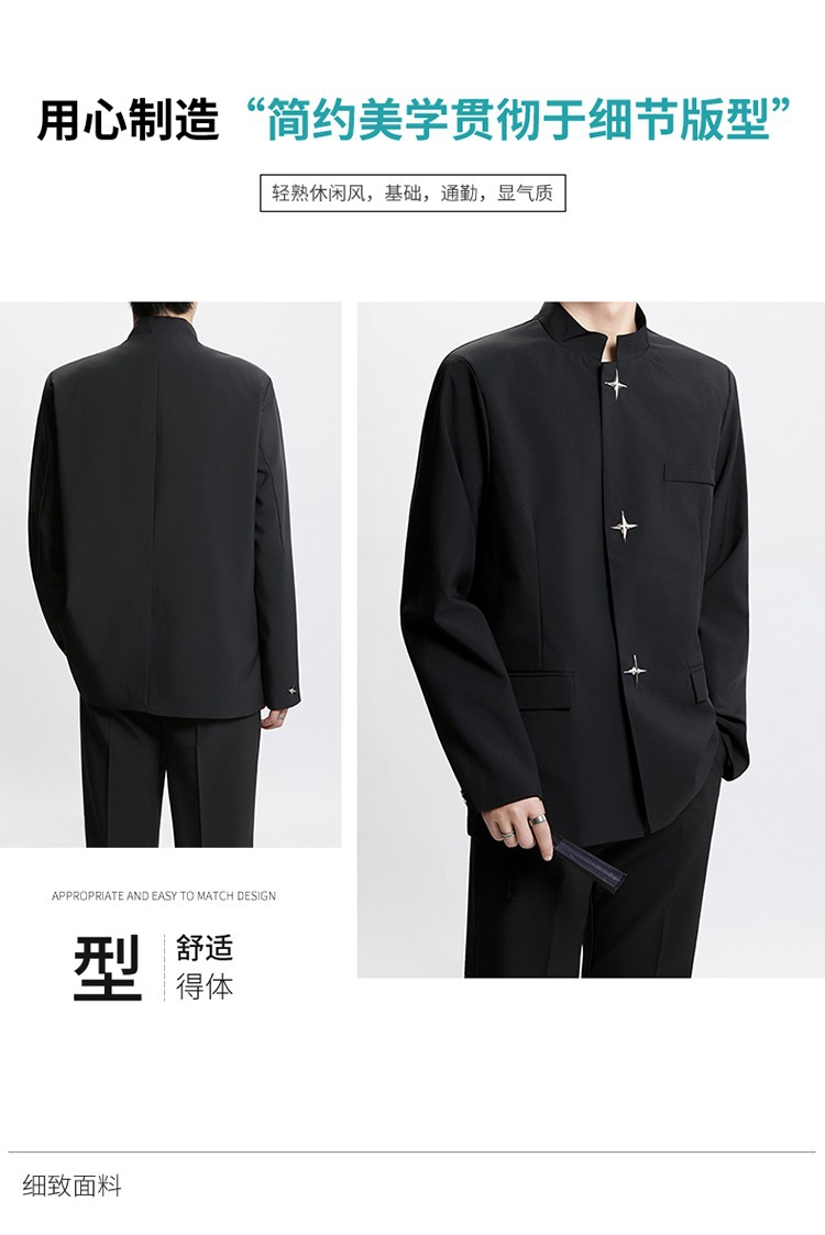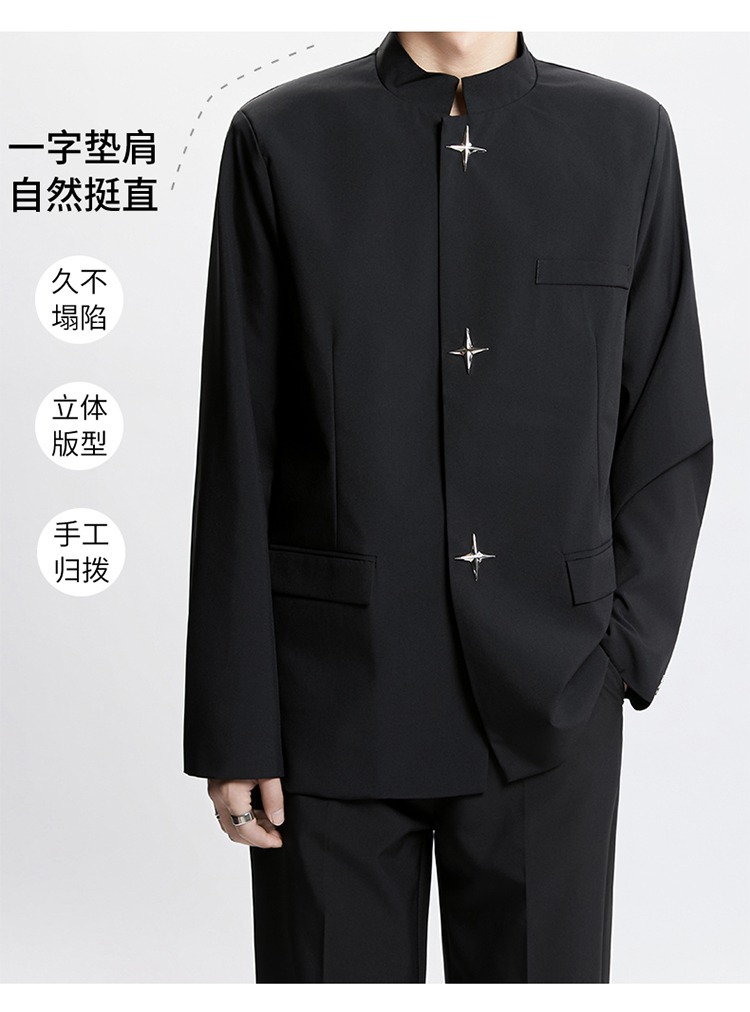 Новый мужской пиджак в китайском стиле с дизайнерским подходом, металлическими пуговицами, мягкими плечами, нишевым высококачественным воротником-стойкой, высококачественным ощущением.