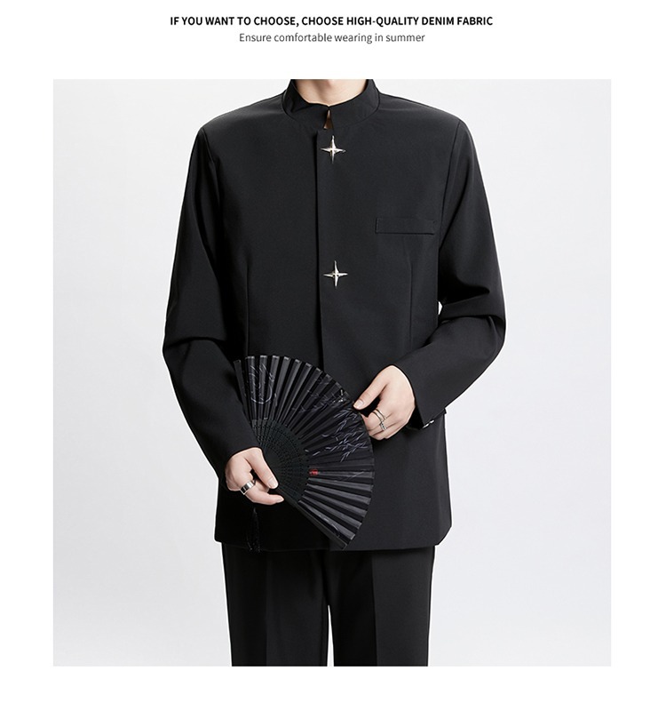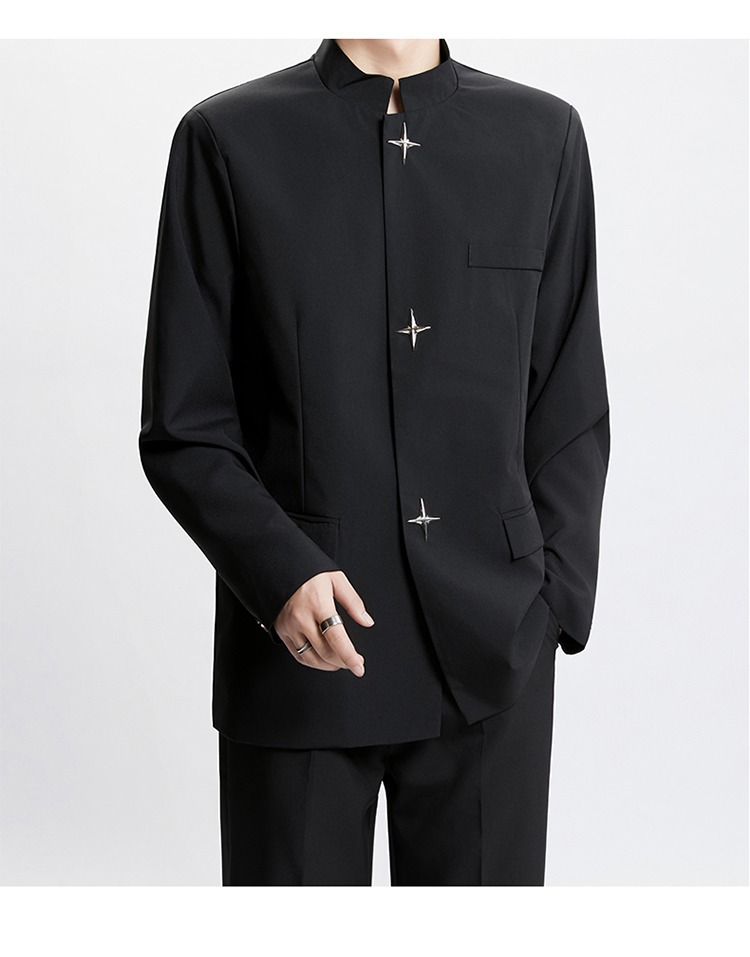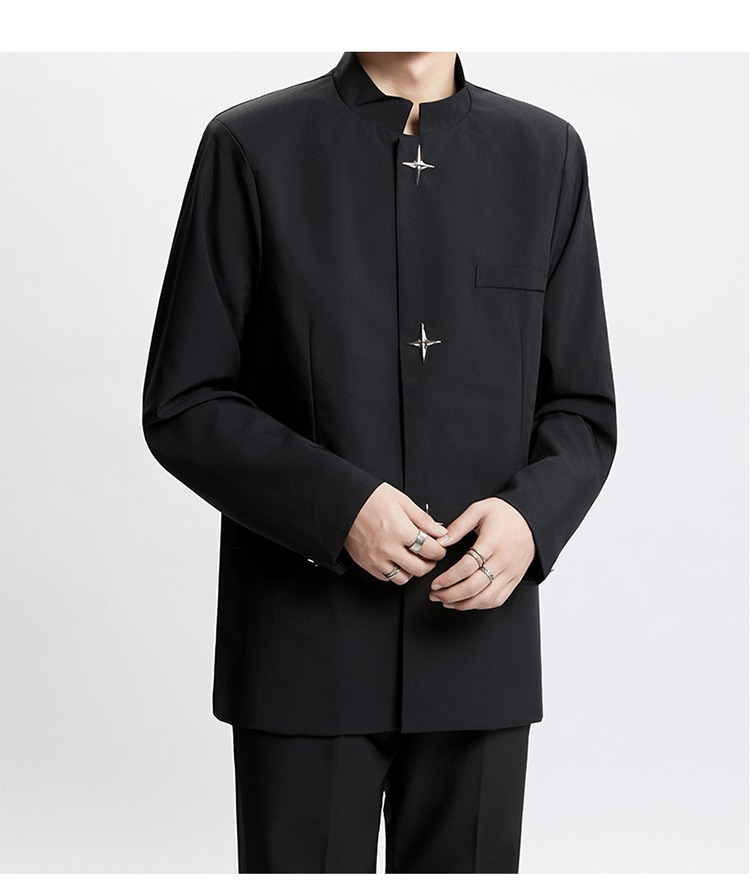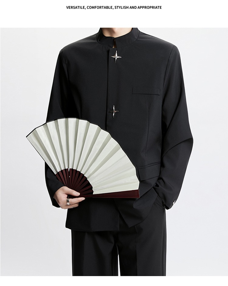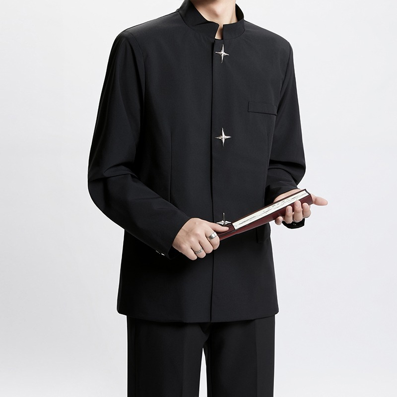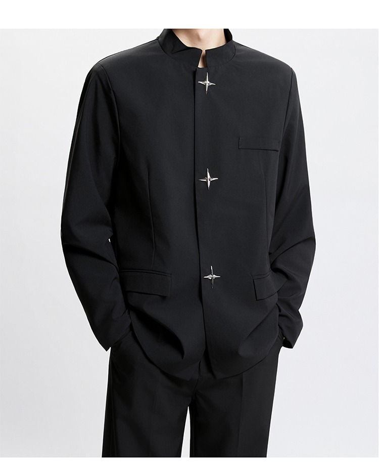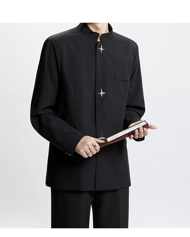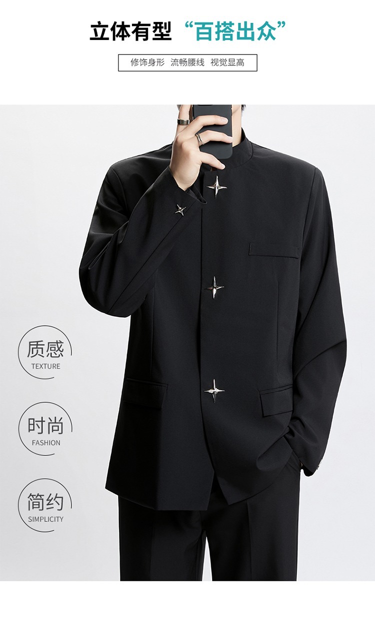 Новый мужской пиджак в китайском стиле с дизайнерским подходом, металлическими пуговицами, мягкими плечами, нишевым высококачественным воротником-стойкой, высококачественным ощущением.