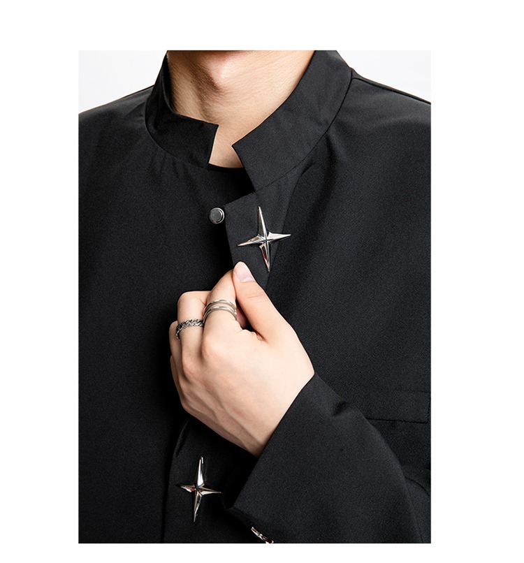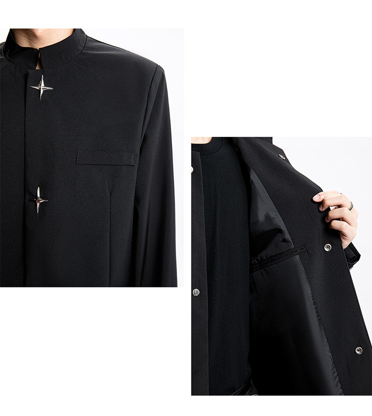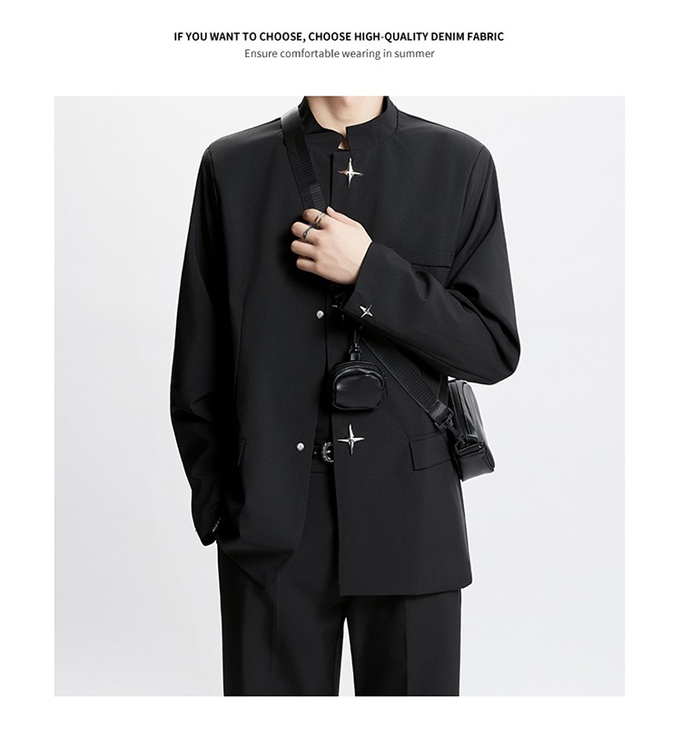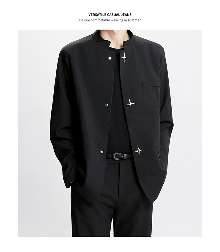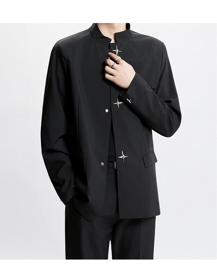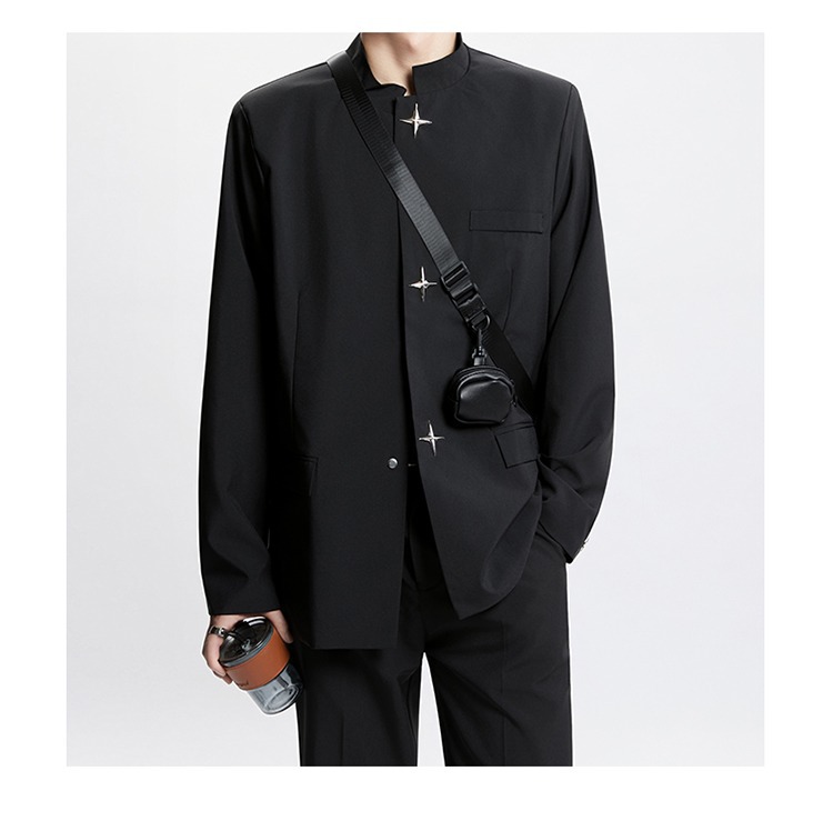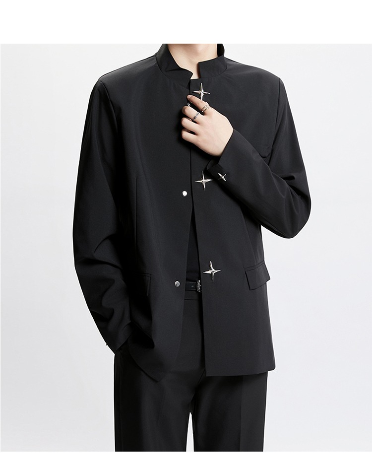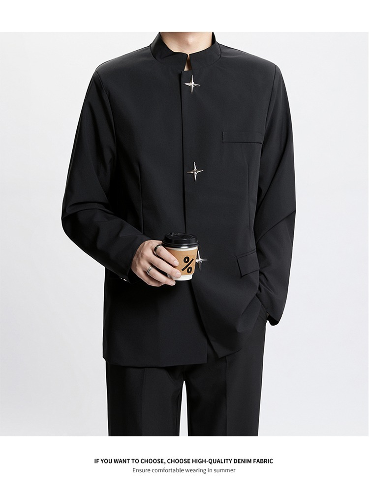 Новый мужской пиджак в китайском стиле с дизайнерским подходом, металлическими пуговицами, мягкими плечами, нишевым высококачественным воротником-стойкой, высококачественным ощущением.