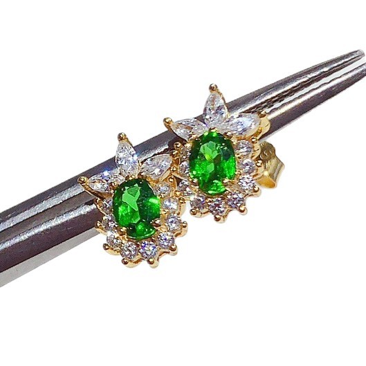 Серьги-пусеты из диопсида, инкрустированные серебром 925 пробы.
