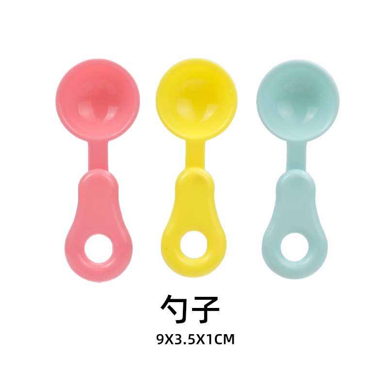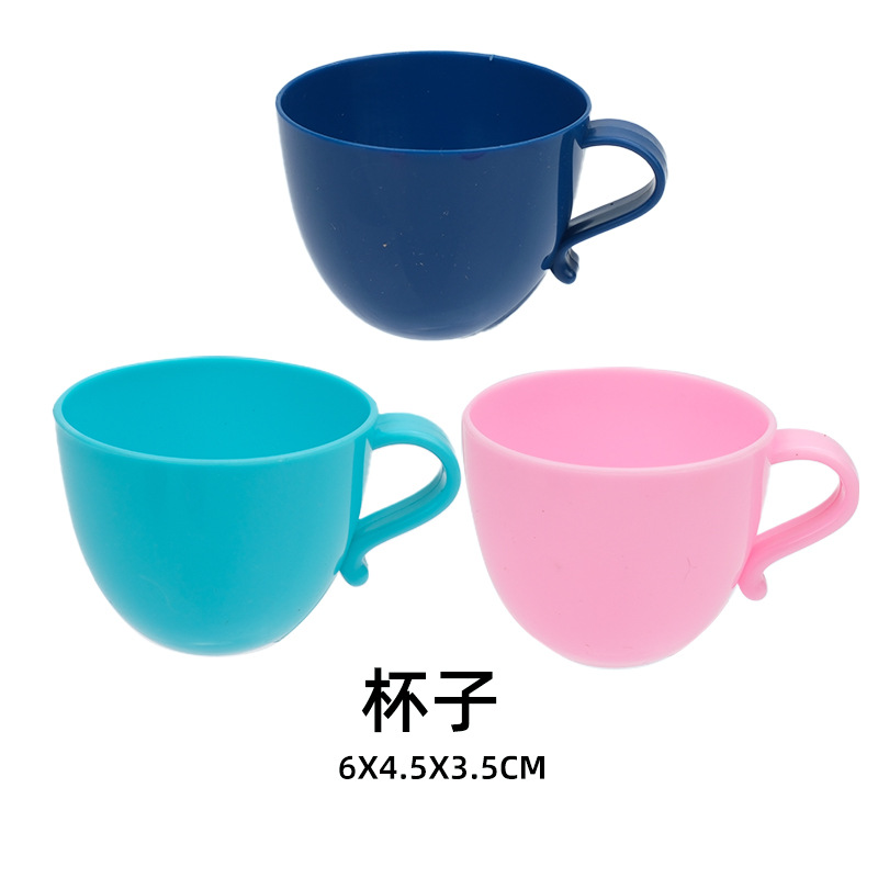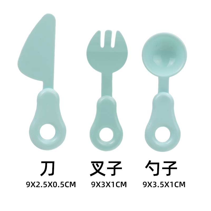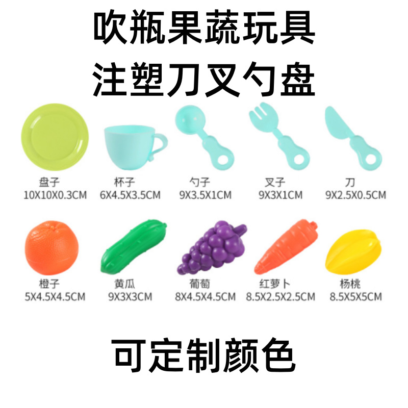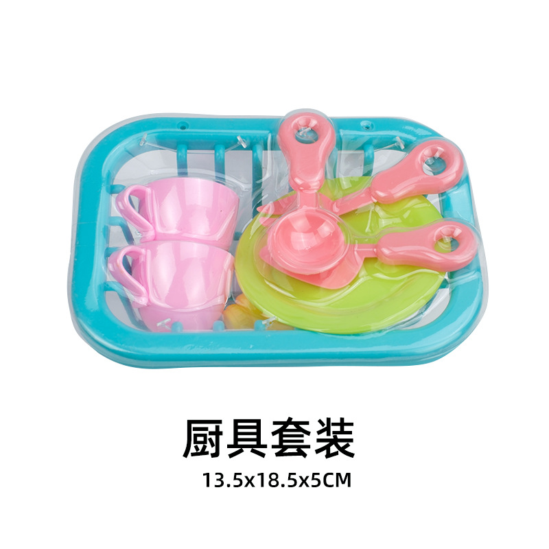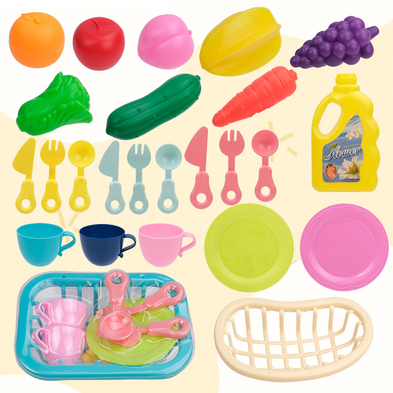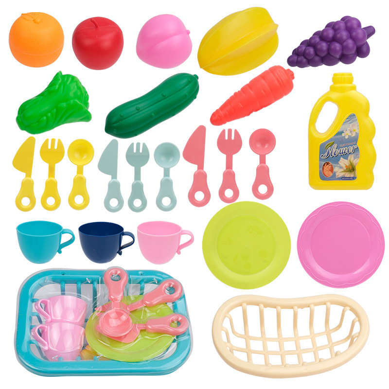 небесно-голубая чашка игрушка; Тёмно-синяя игрушка-чашка; розовая игрушка-чашка; Синий нож, вилка и ложка игрушка; Жёлтый нож, вилка и ложка игрушка; Розовый нож, вилка и ложка игрушка; Игрушка-дренажная корзина; Бутылка игрушки в виде средства для мытья посуды; зеленая игрушка-тарелка; розовая игрушка-тарелка; игрушки в виде винограда; игрушка-огурец; игрушка-морковка; Игрушки в форме звездчатого фрукта; оранжевые игрушки; игрушки из капусты; яблочные игрушки; персиковые игрушки; набор игрушечной посуды