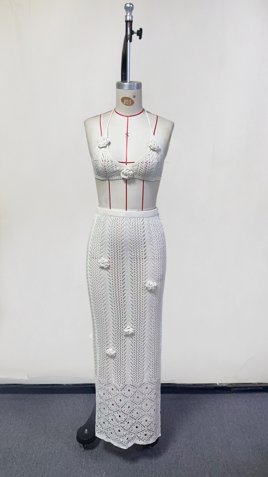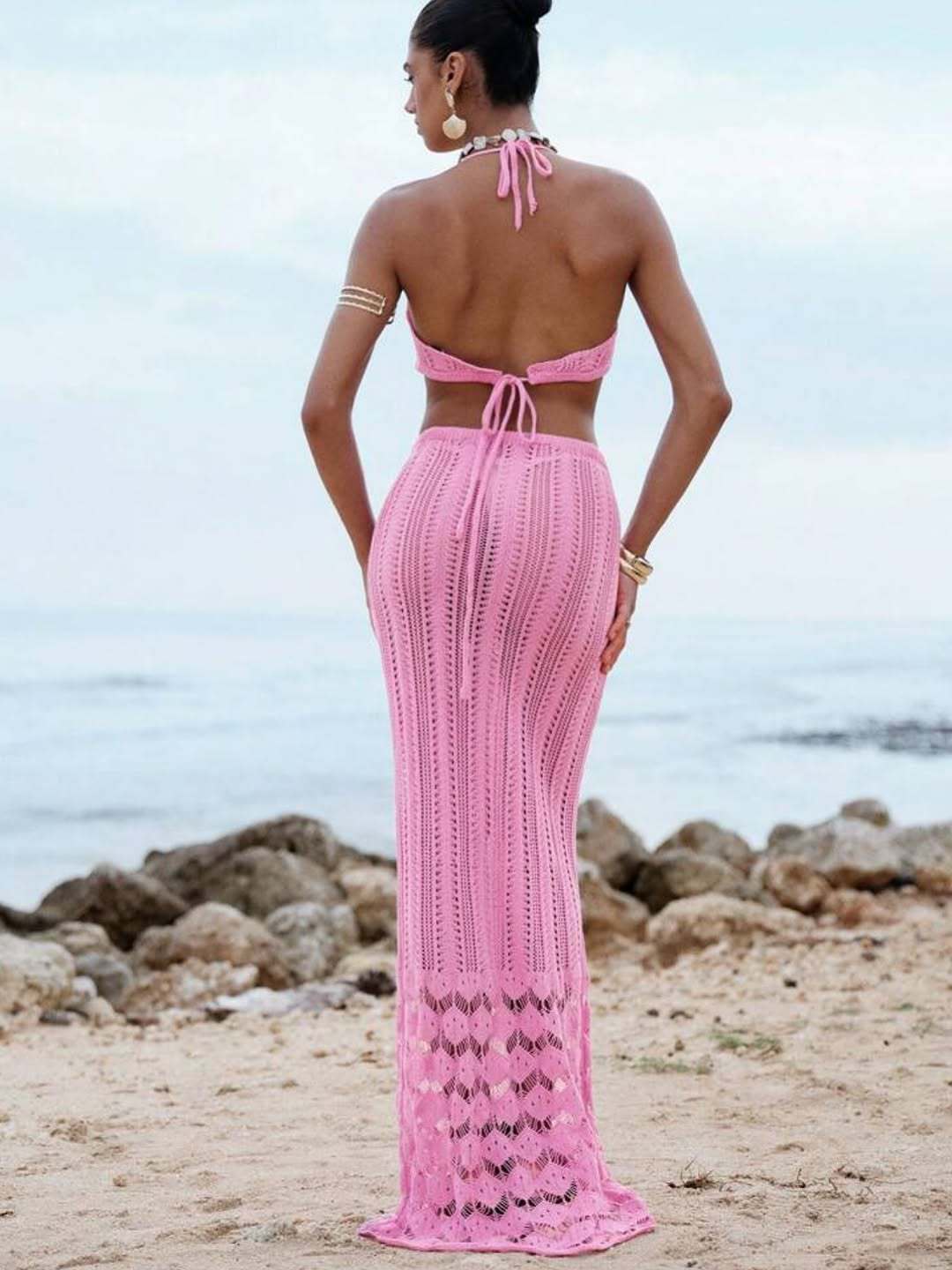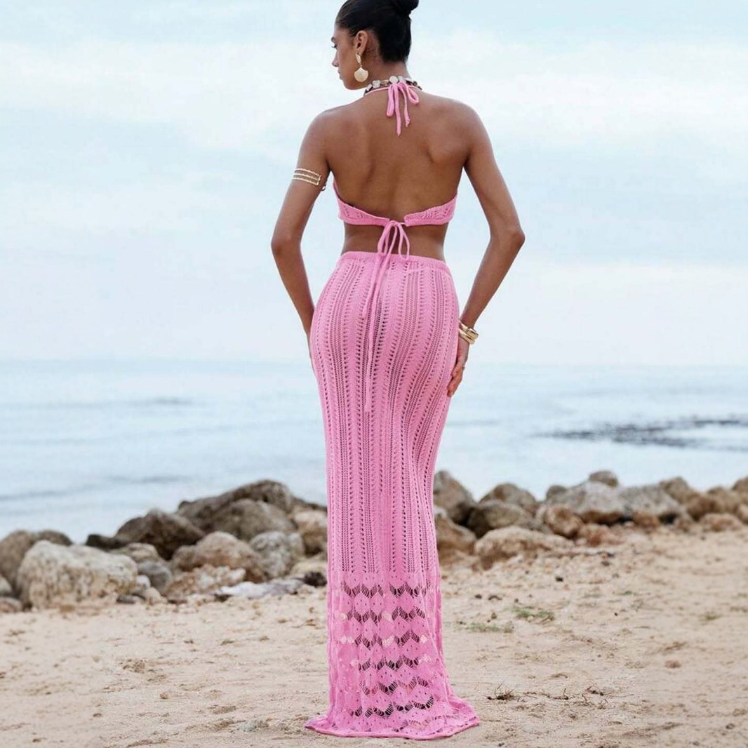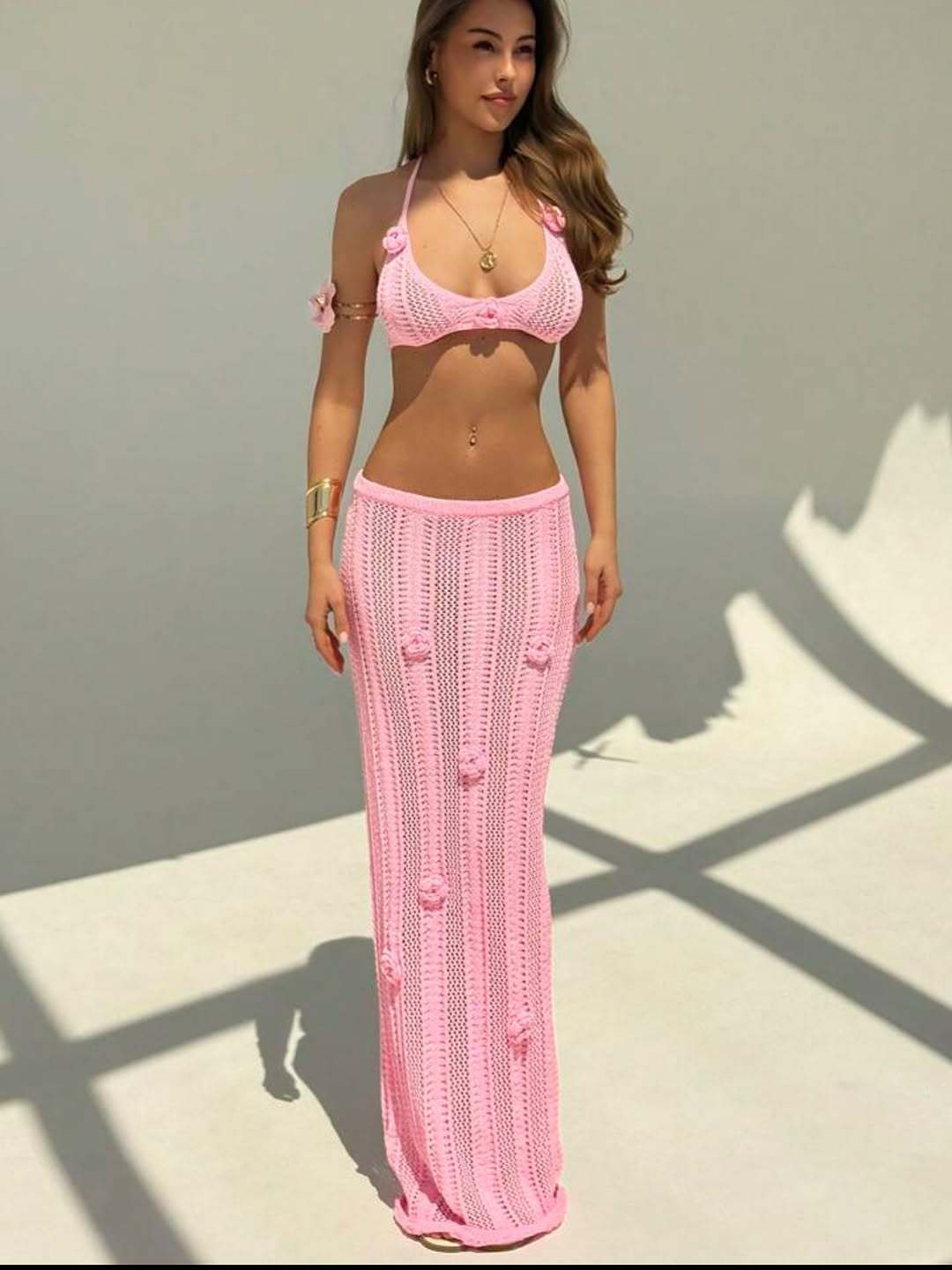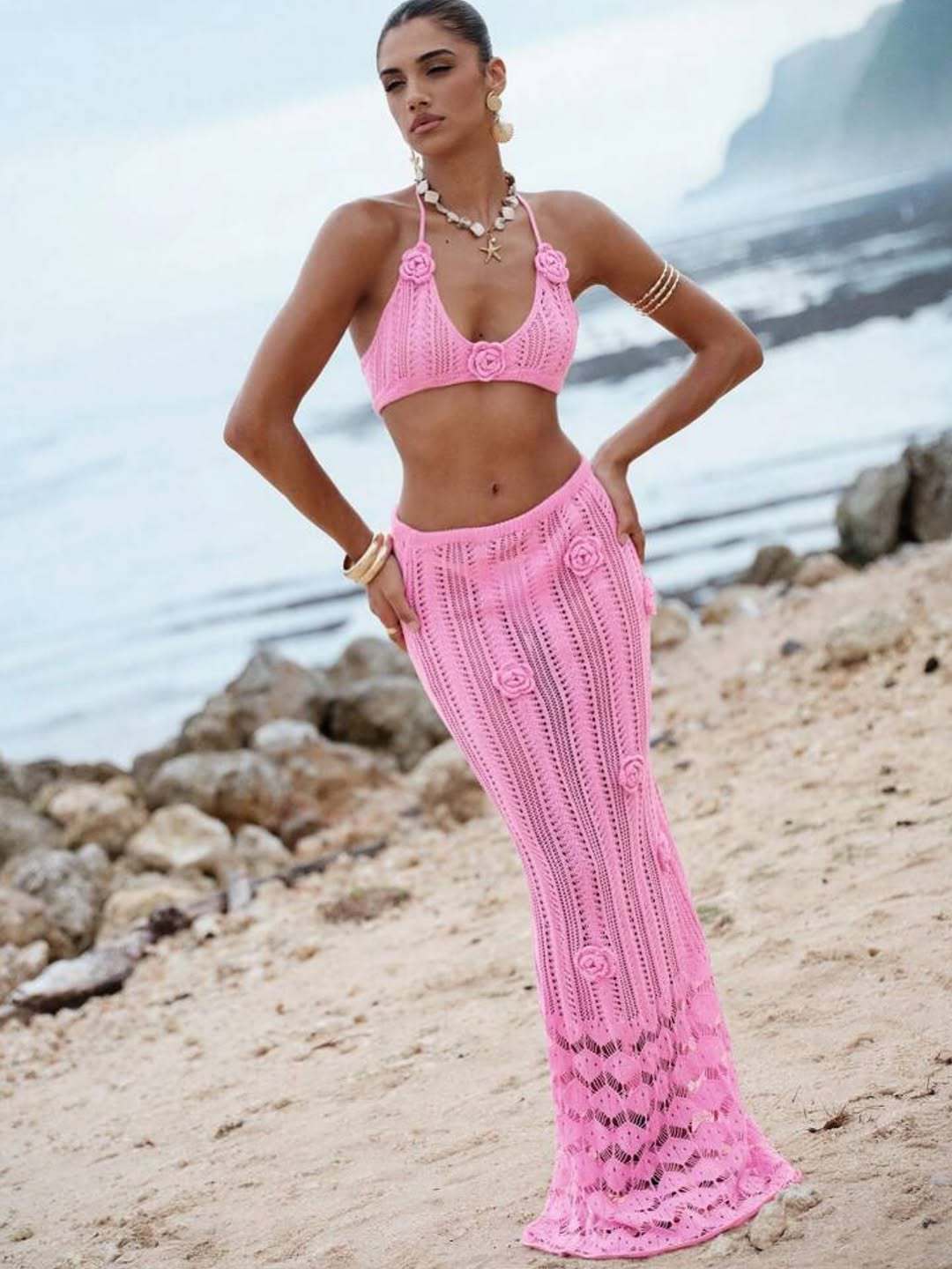 Манга 2025: новый сексуальный купальник с цветочным принтом, талией-корсетом, бретелями-халтером и длинной юбкой, вязаный, для трансграничных европейских и американских рынков.