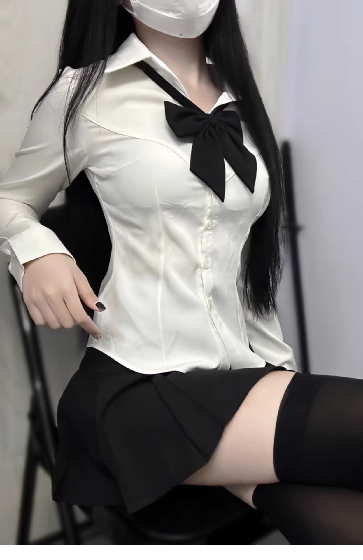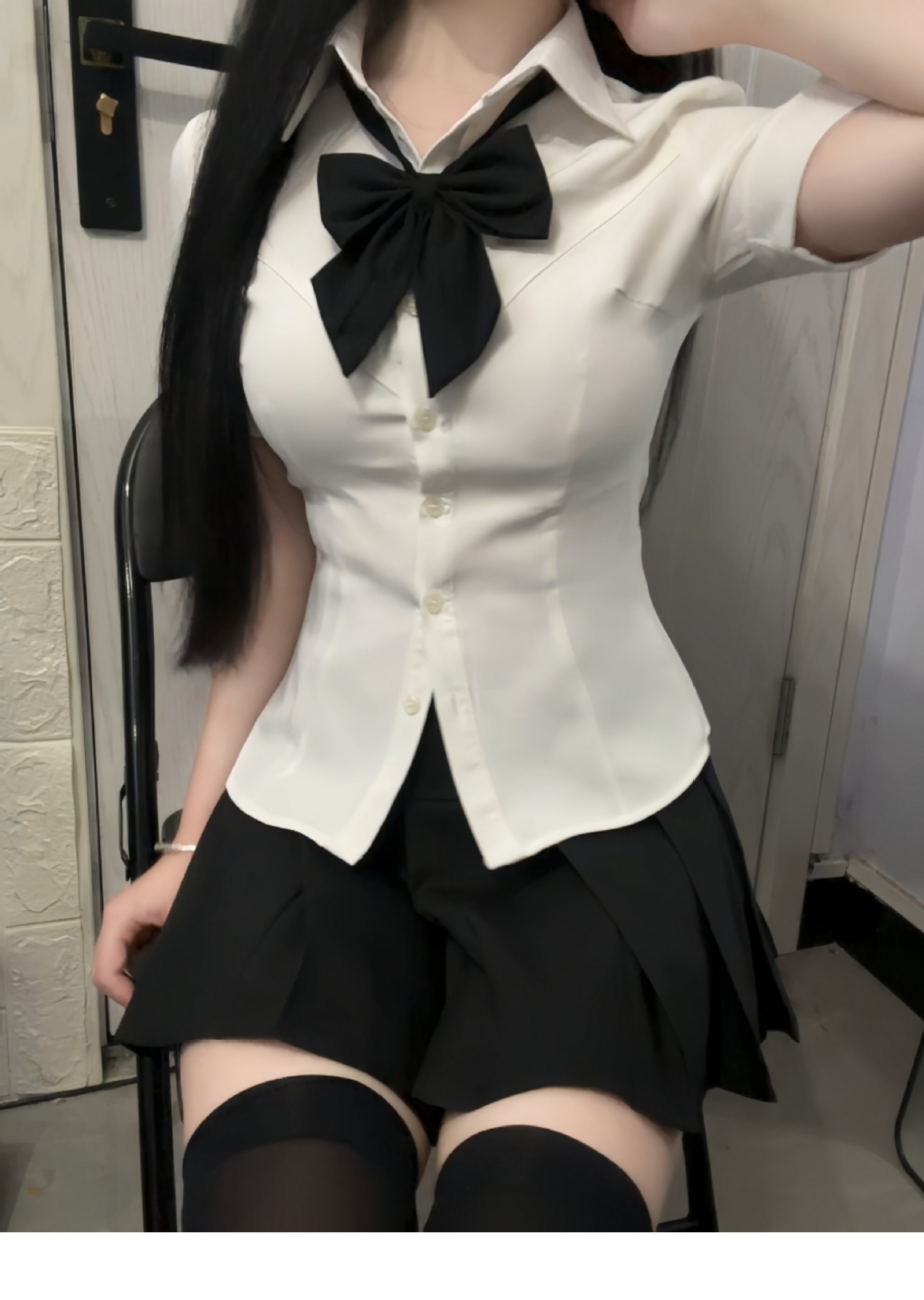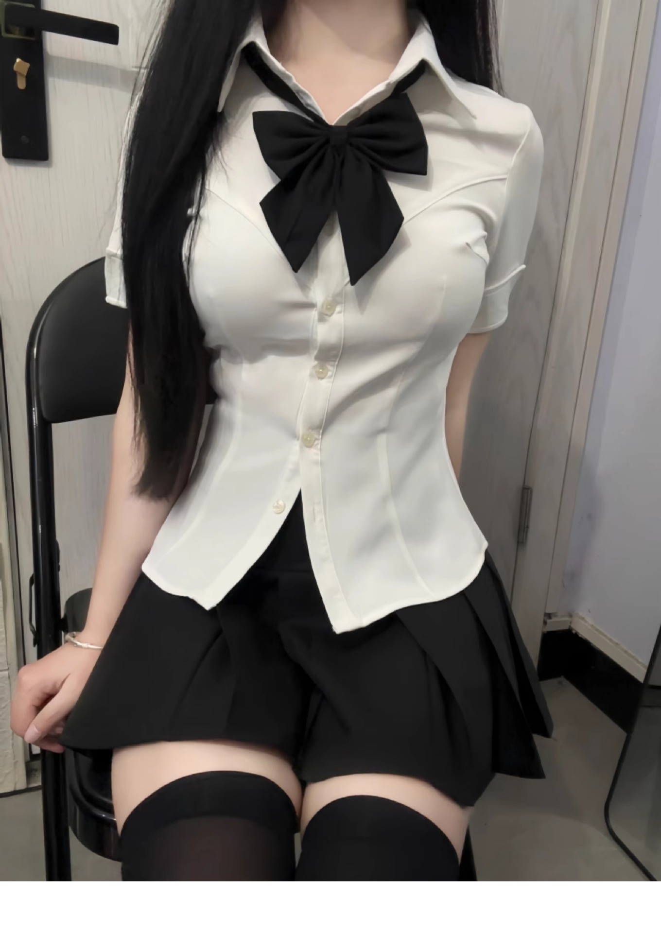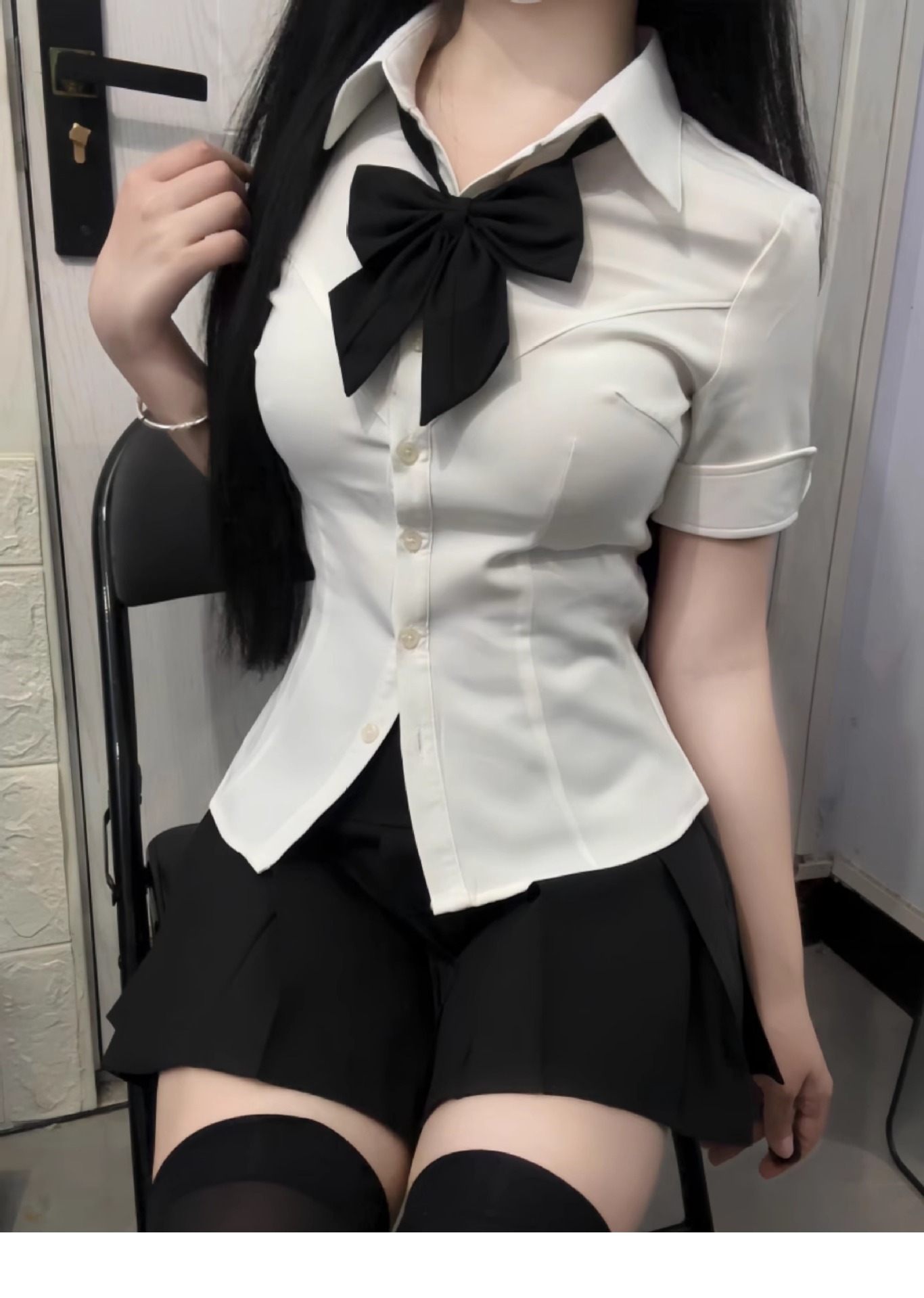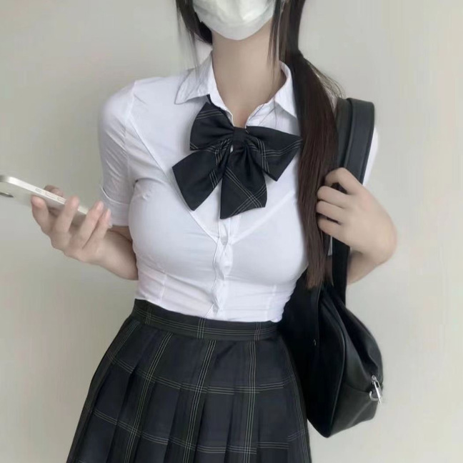 Маленькая рубашка V-образного выреза с коротким рукавом без галстука; Маленькая футболка с короткими рукавами и темно-серым галстуком.; Маленькая V-образная рубашка с короткими рукавами + темно-серый галстук-бабочка + темно-серая клетчатая юбка; Маленькая рубашка V-образного выреза с длинными рукавами без галстука; Маленькая рубашка V-образного выреза с длинными рукавами и темно-серым галстуком.; Маленькая рубашка V-образного выреза с длинными рукавами + темно-серый галстук-бабочка + темно-серая клетчатая юбка