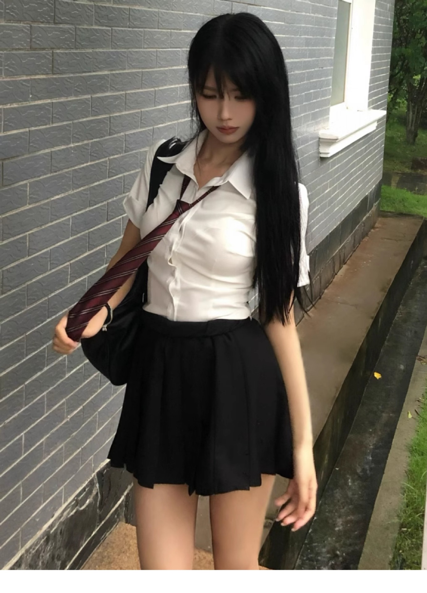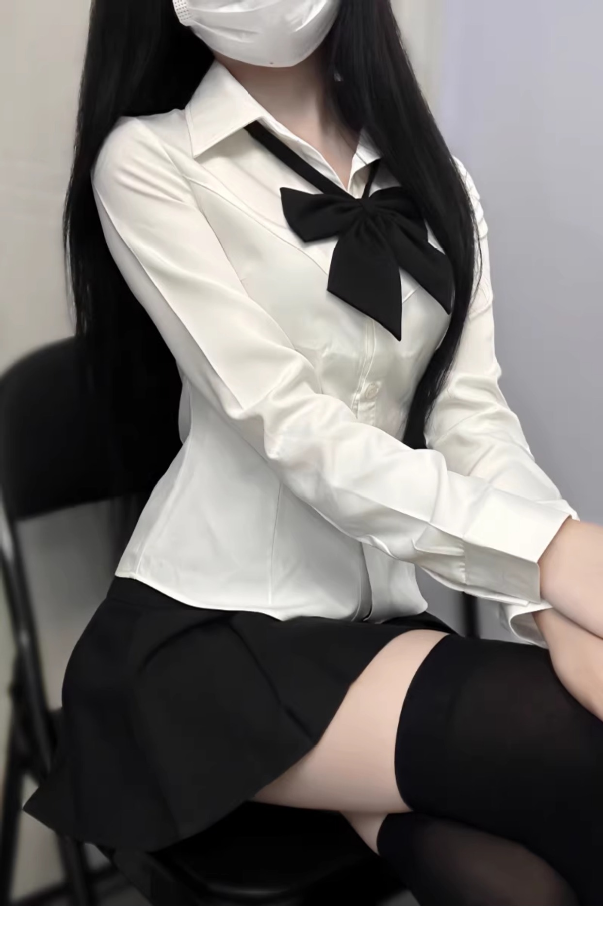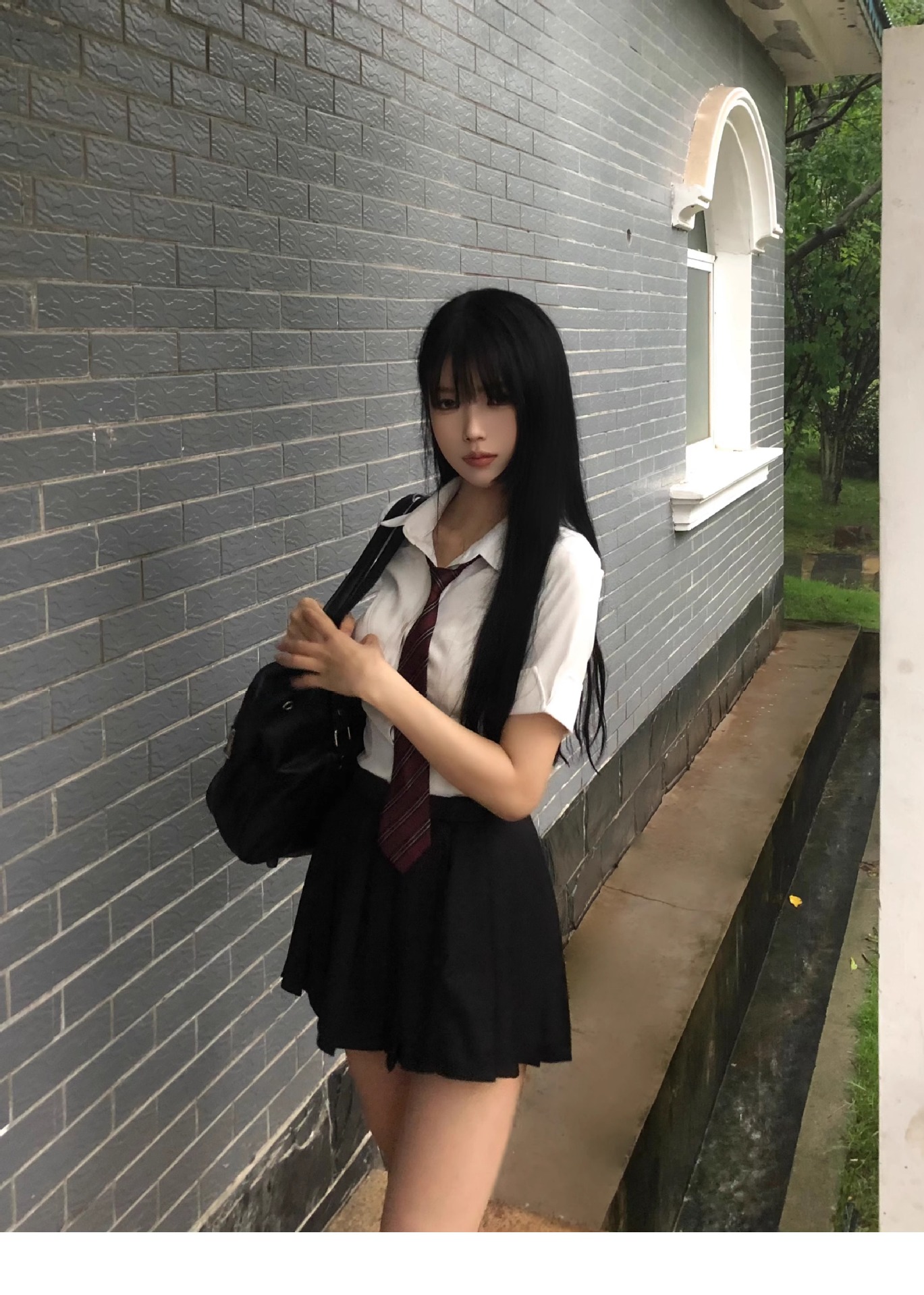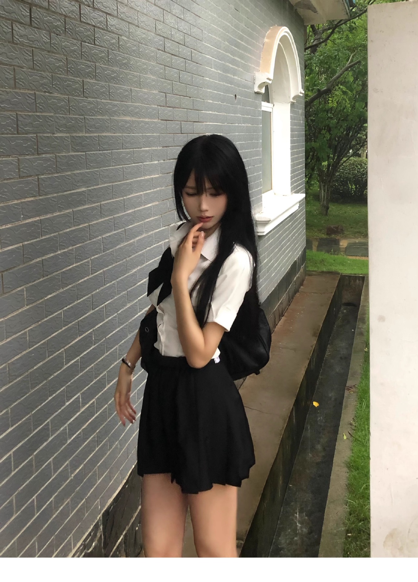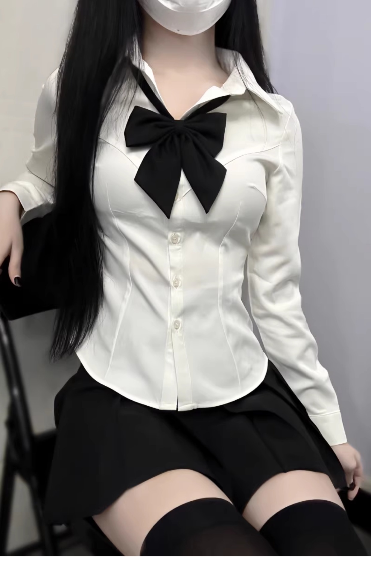Маленькая рубашка V-образного выреза с коротким рукавом без галстука; Маленькая футболка с короткими рукавами и темно-серым галстуком.; Маленькая V-образная рубашка с короткими рукавами + темно-серый галстук-бабочка + темно-серая клетчатая юбка; Маленькая рубашка V-образного выреза с длинными рукавами без галстука; Маленькая рубашка V-образного выреза с длинными рукавами и темно-серым галстуком.; Маленькая рубашка V-образного выреза с длинными рукавами + темно-серый галстук-бабочка + темно-серая клетчатая юбка