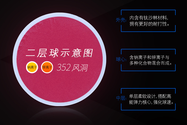 | 外壳 | 含钛沙林材料拥有更好的耐打性 | 球心 | 高弹力橡胶球心更好弹性 | |