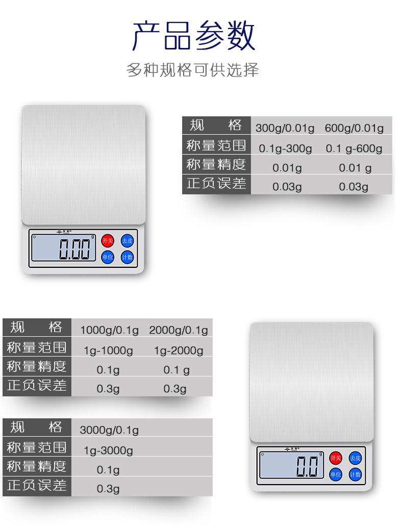 1000 г, точность 0,1 г; 600 г, точность 0,01 г; 2000 г, точность 0,1 г; 3000 г, точность 0,1 г; 300 г, точность 0,01 г