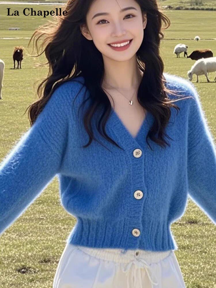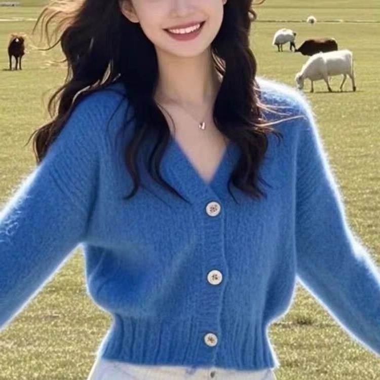 2025 новый осенне-зимний французский стиль, мягкий восковой синий свитер с v-образным вырезом, вязаный кардиган, куртка, женский короткий топ