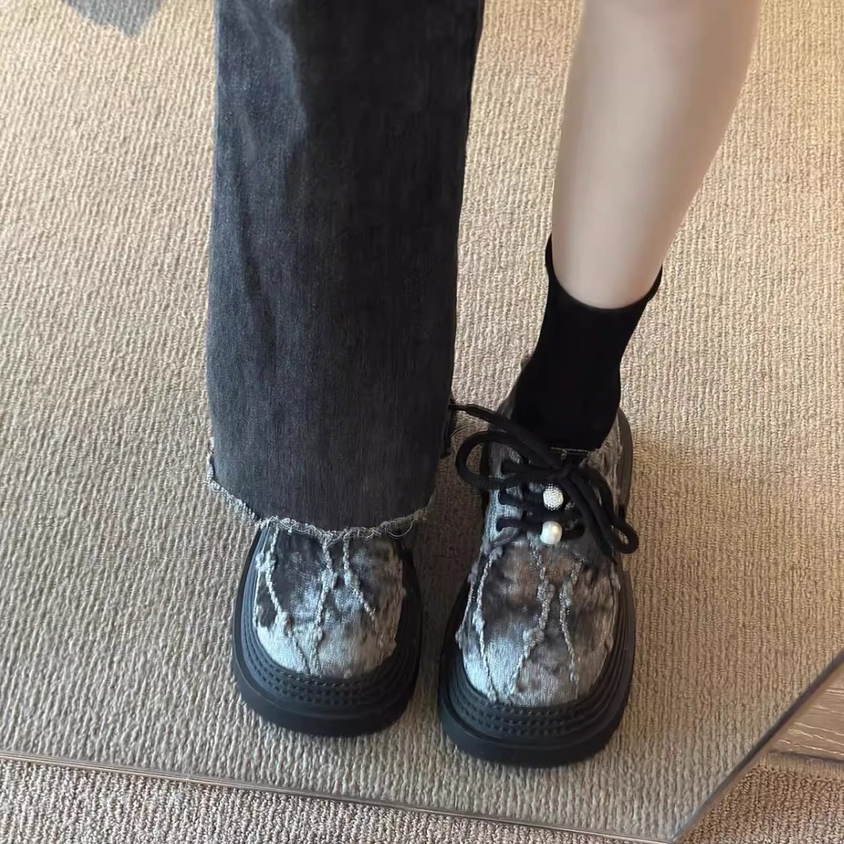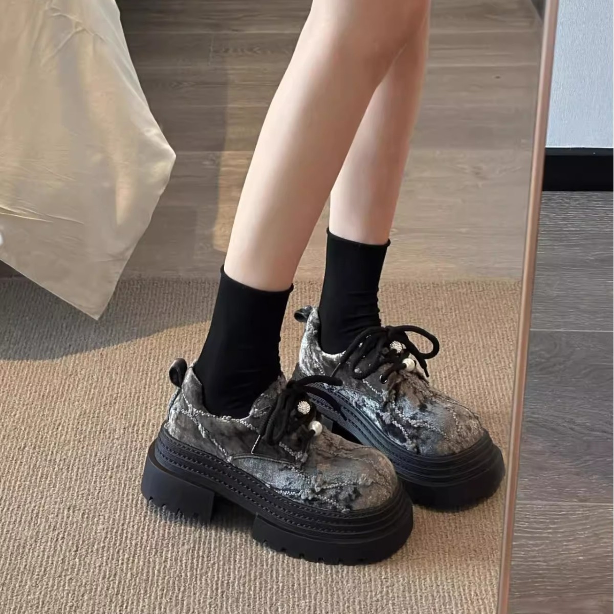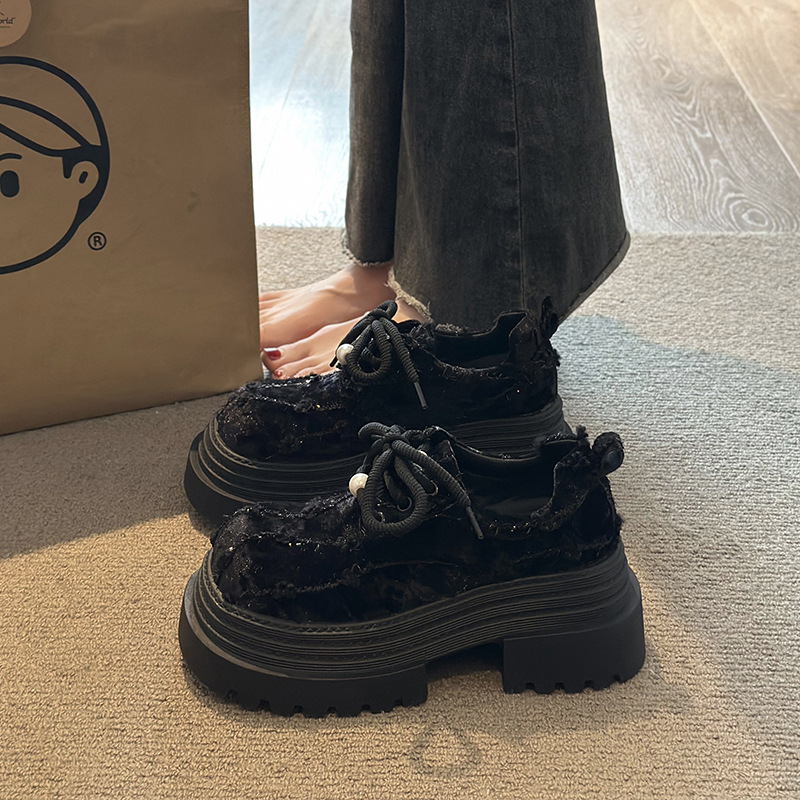 Маленькие кожаные туфли JK в европейском стиле с бархатным жемчугом и шнуровкой на толстой трехслойной подошве для миниатюрных женщин, лоферы высотой 8 см.