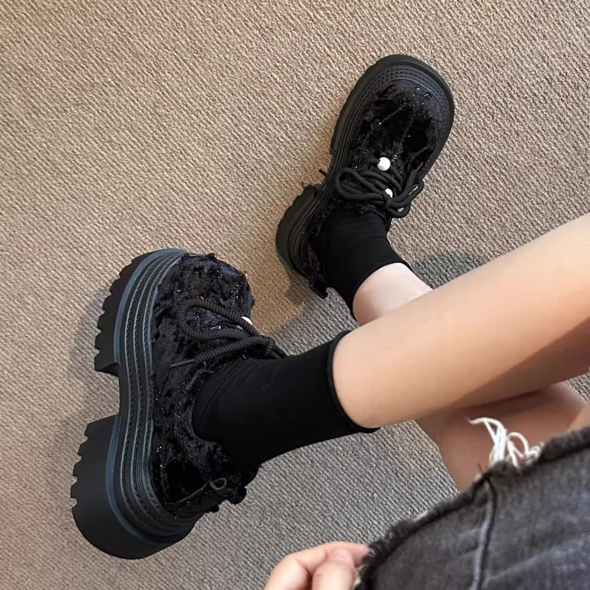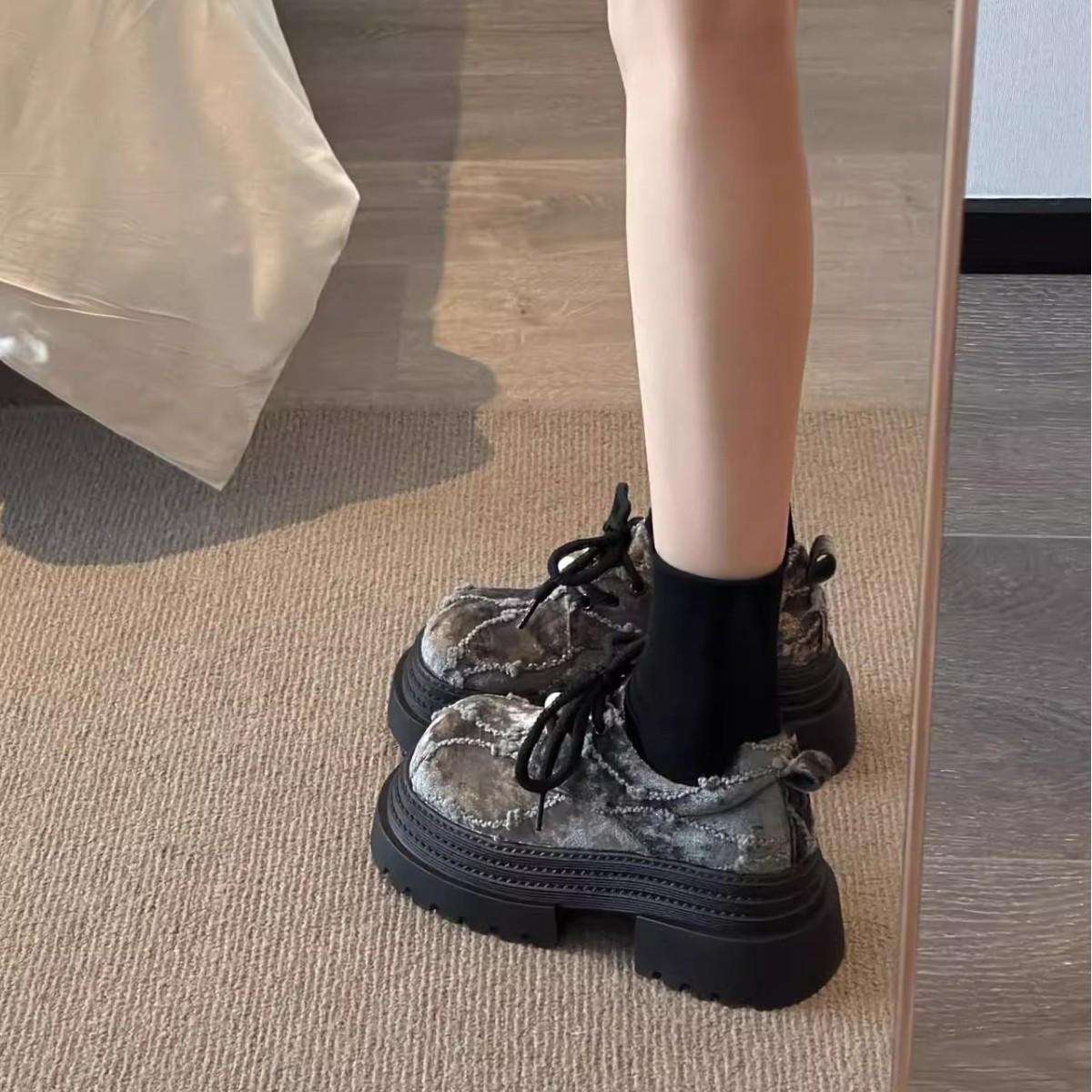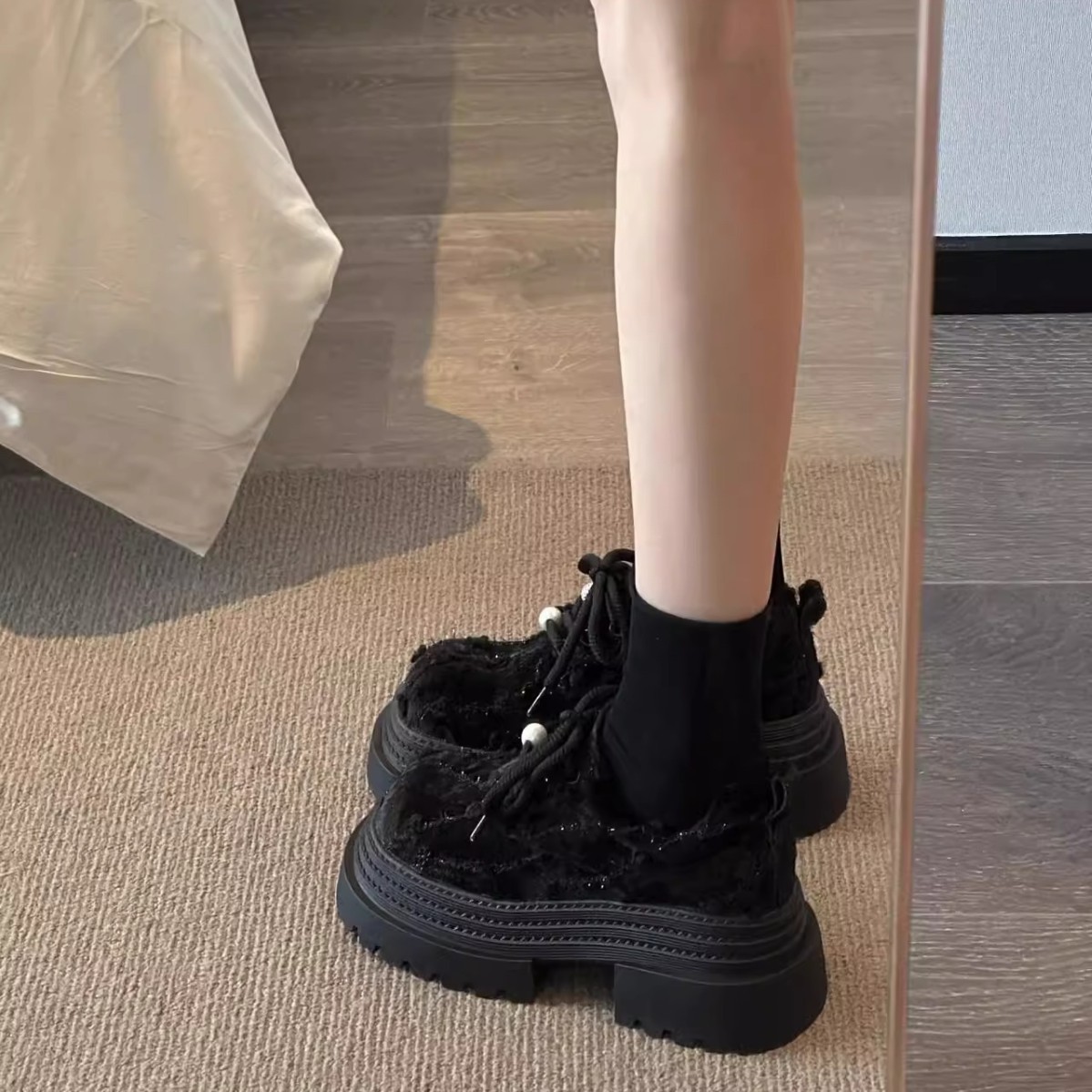 Маленькие кожаные туфли JK в европейском стиле с бархатным жемчугом и шнуровкой на толстой трехслойной подошве для миниатюрных женщин, лоферы высотой 8 см.