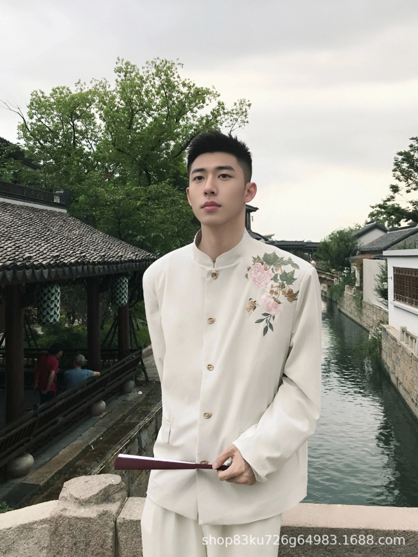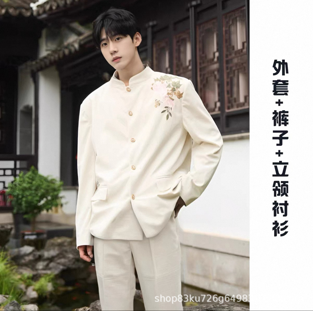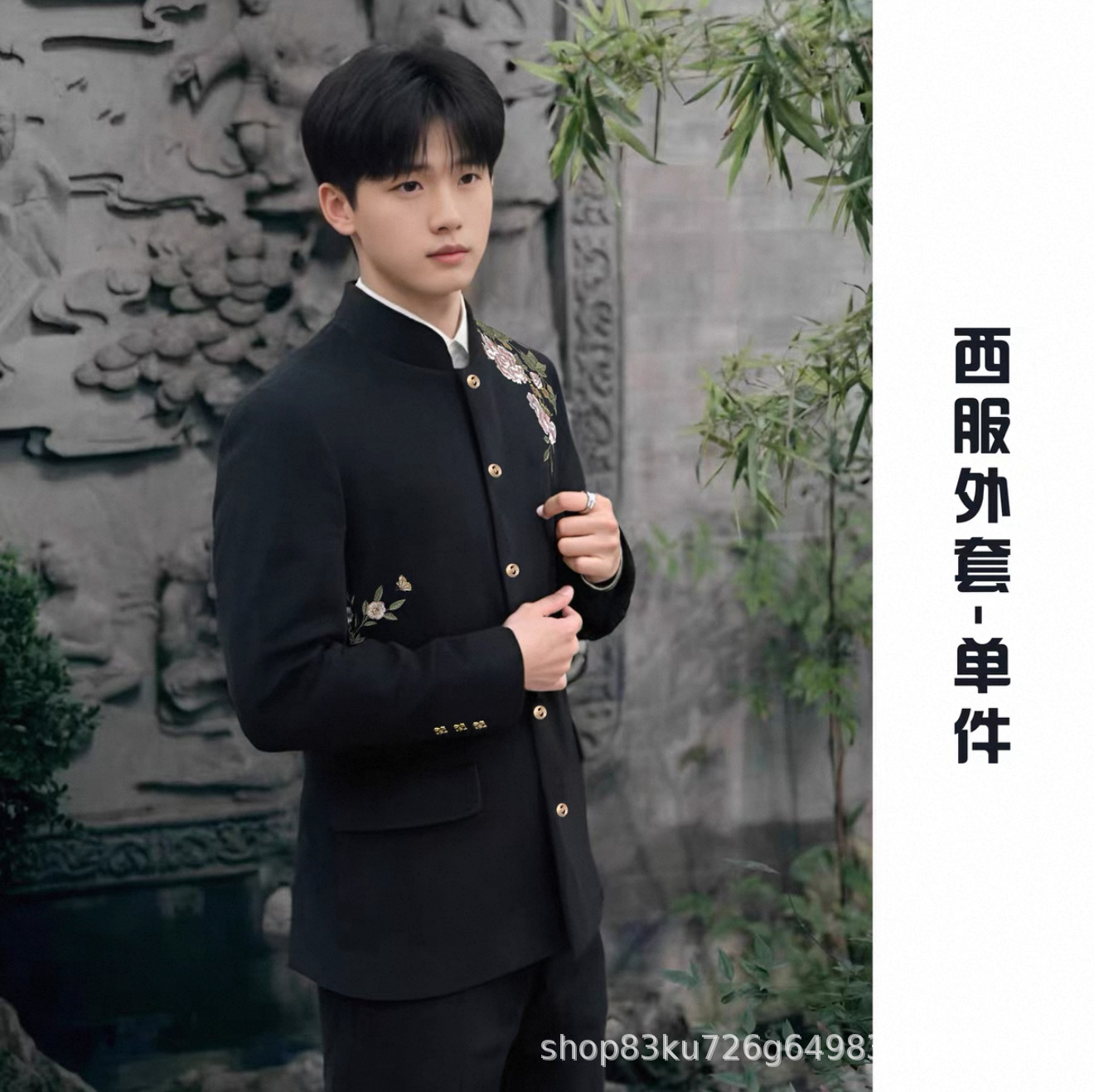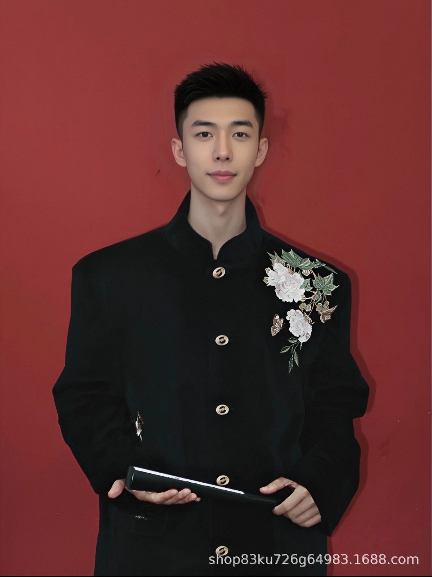 Мужской пиджак в новом китайском стиле Jinfu с воротником-стойкой, с вышивкой бархатными пионами и бабочками, костюм-ципао для помолвки, свадьбы и церемоний.