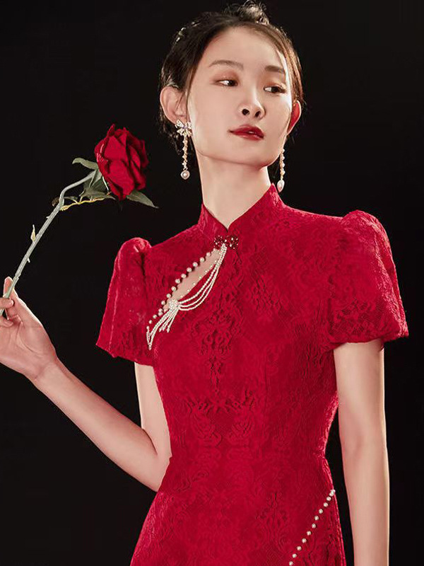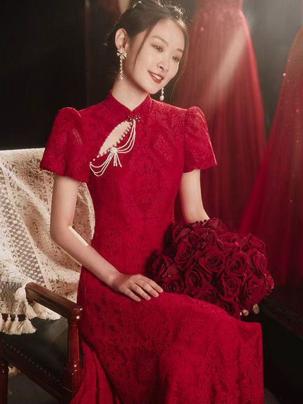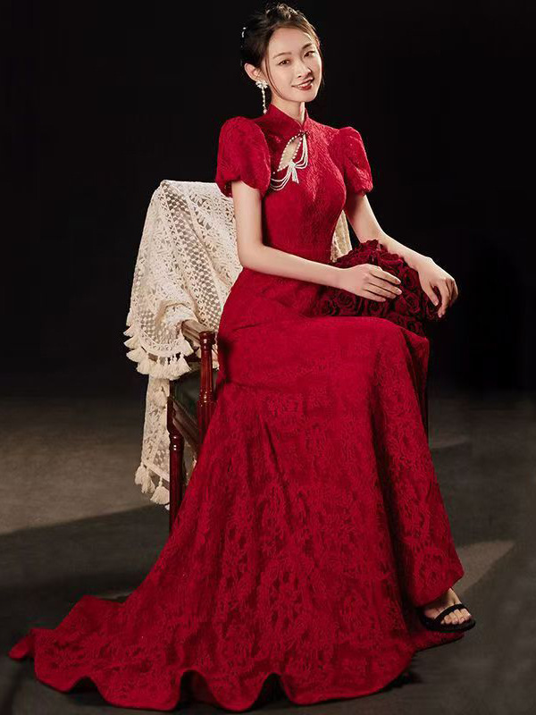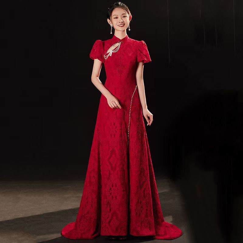 Новое платье-тост в китайском стиле, улучшенный чонсам, миниатюрное бордовое свадебное платье, обручальное платье, кружевное вечернее платье