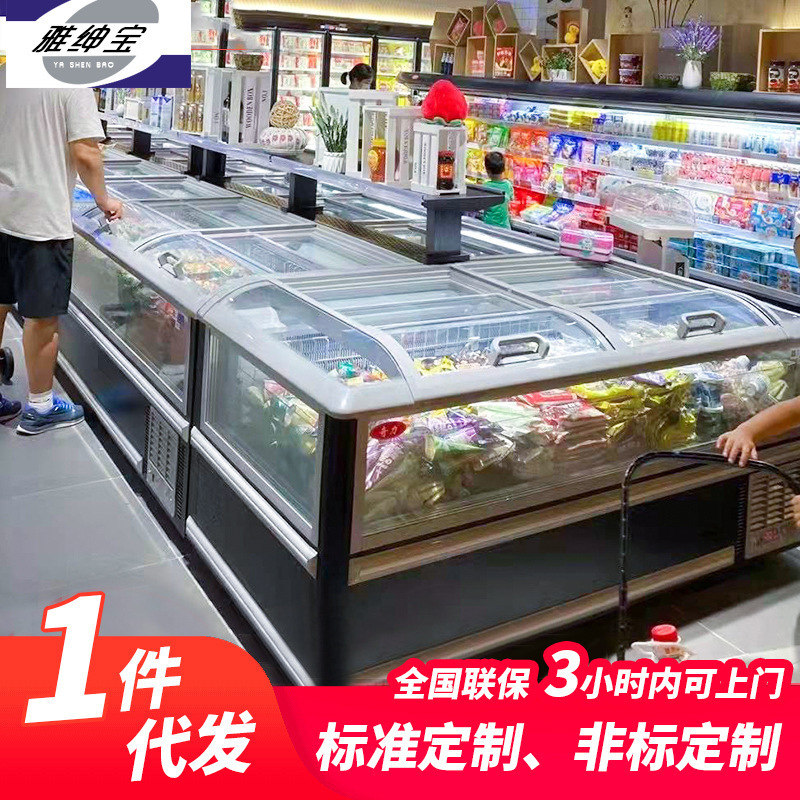Производитель Yasenbao напрямую поставляет комбинированный островной шкаф с видимым окном для коммерческих супермаркетов, предназначенный для заморозки рисовых шариков, пельменей и фрикаделек.