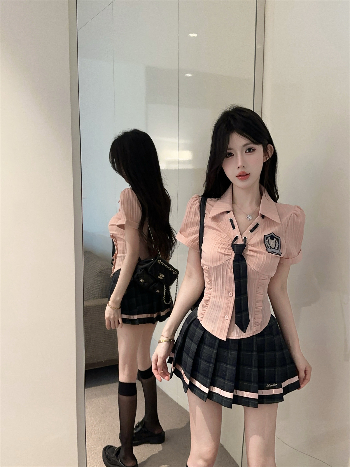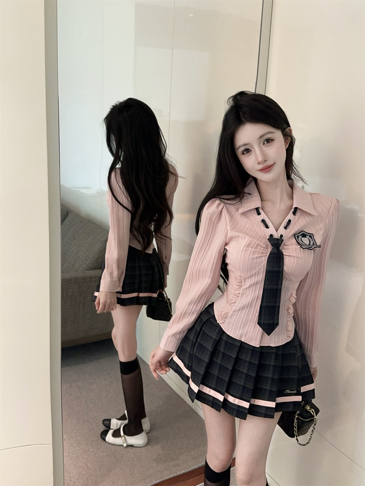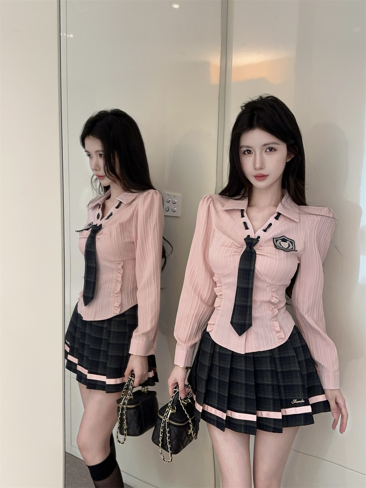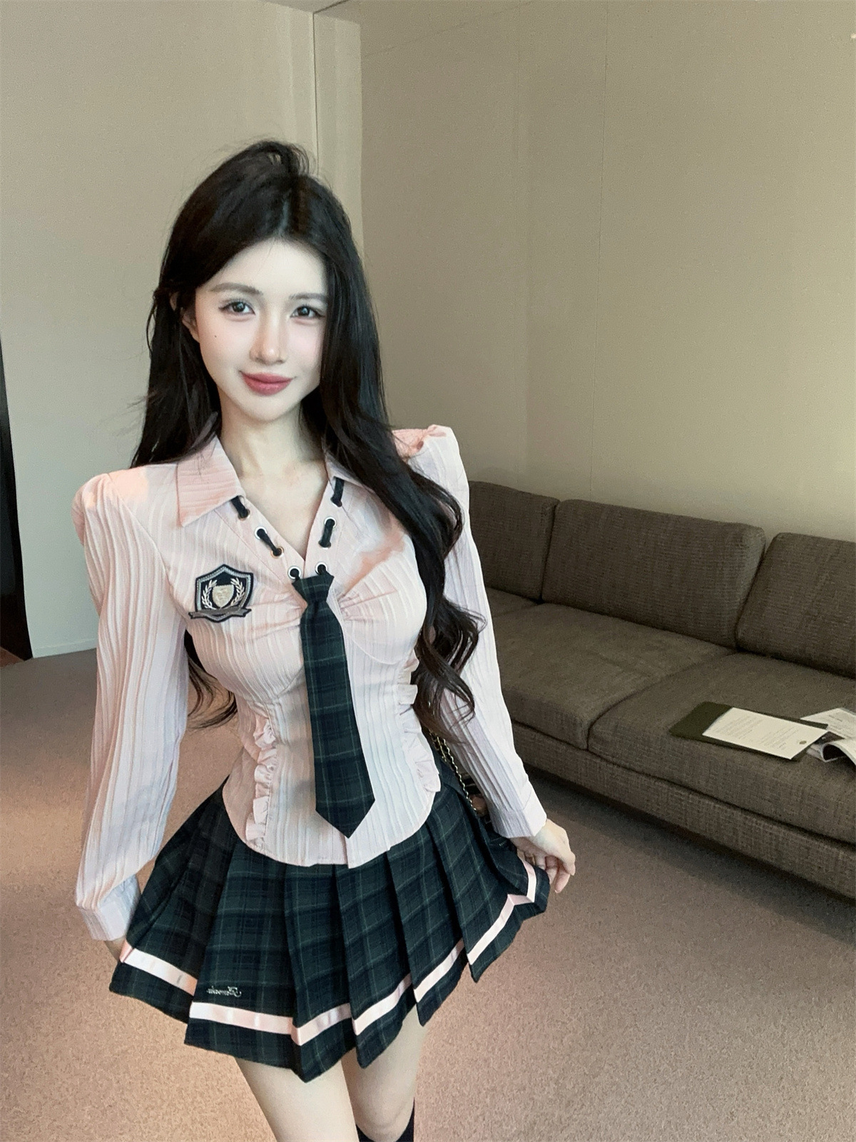 значок галстука на рубашке; клетчатая юбка с высокой талией; Рубашка, галстук, значок + клетчатая юбка с высокой талией.; Рубашка с длинными рукавами, галстуком и именным значком.; Рубашка с длинным рукавом, галстук, значок + юбка в клетку с высокой талией