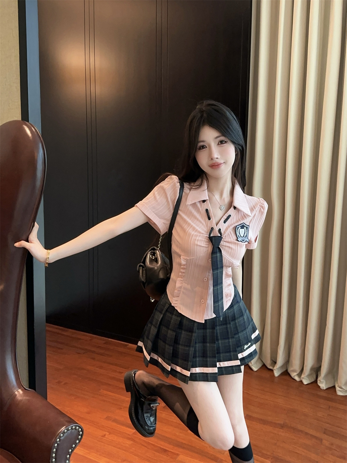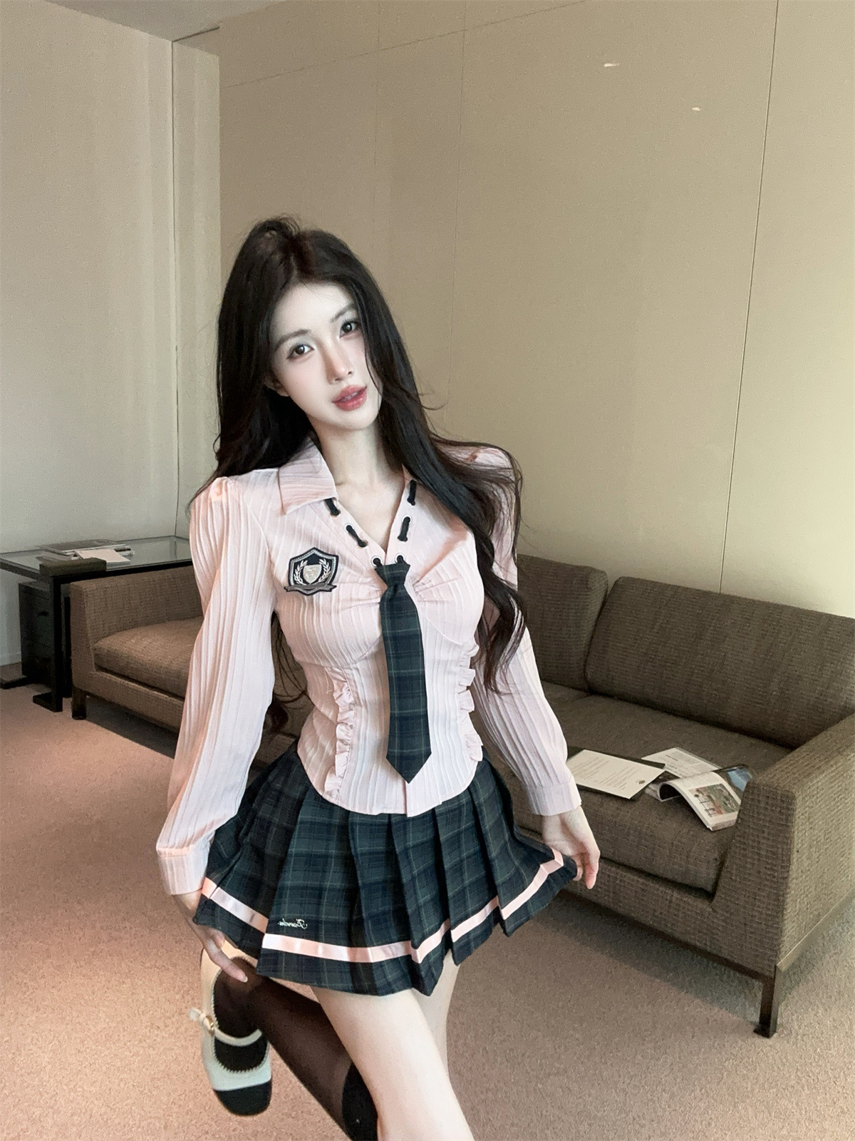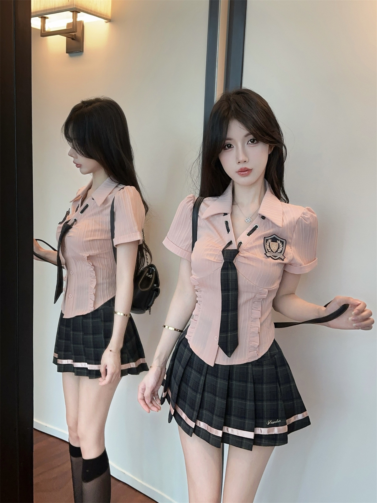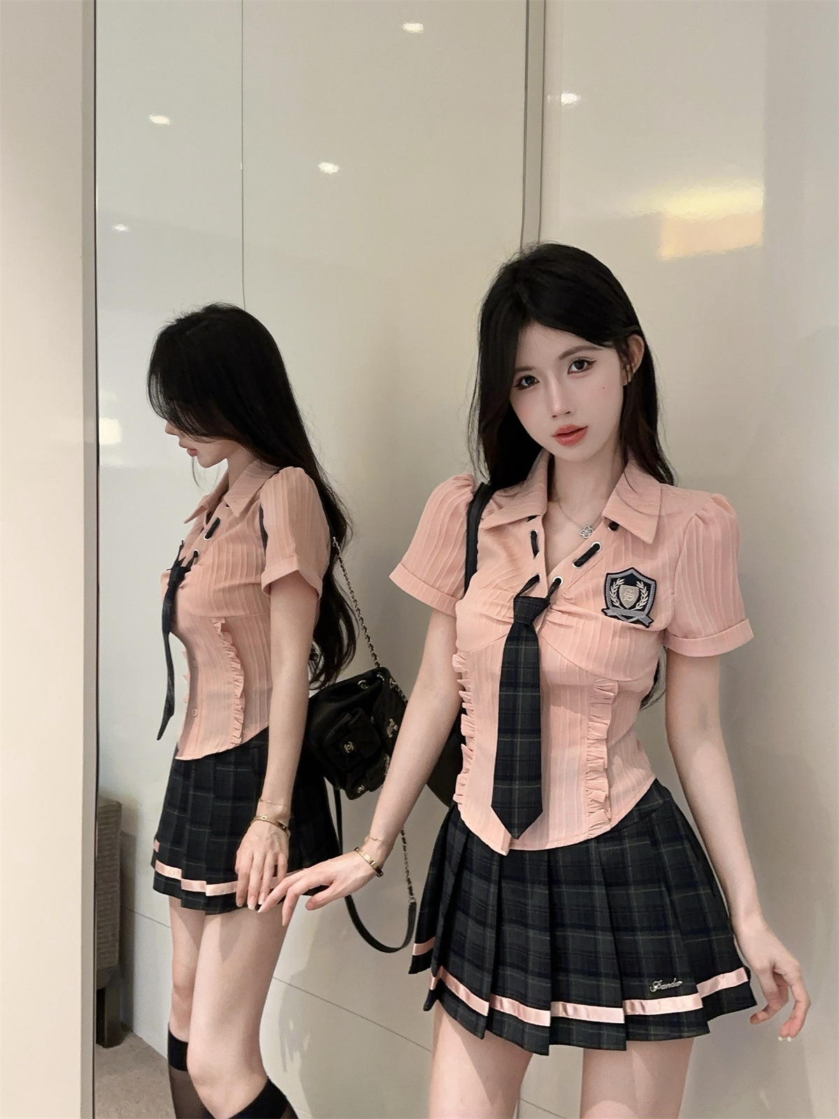 значок галстука на рубашке; клетчатая юбка с высокой талией; Рубашка, галстук, значок + клетчатая юбка с высокой талией.; Рубашка с длинными рукавами, галстуком и именным значком.; Рубашка с длинным рукавом, галстук, значок + юбка в клетку с высокой талией