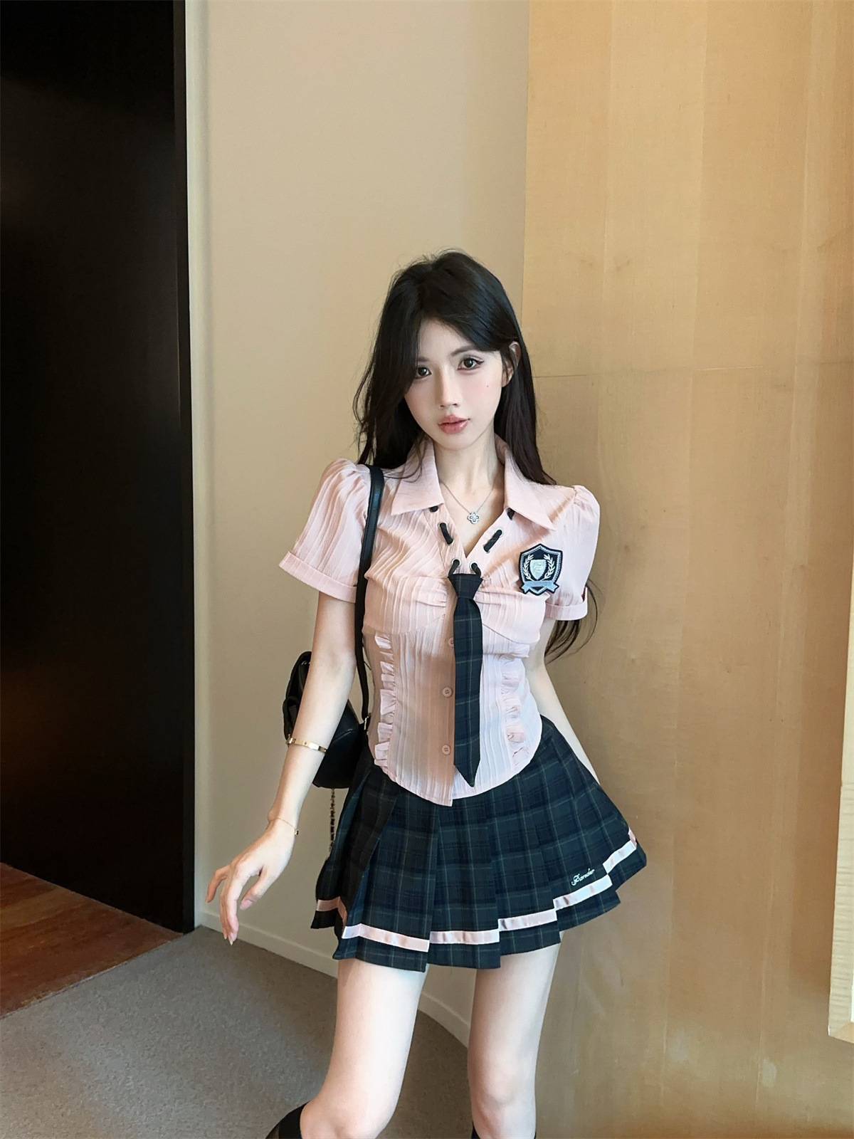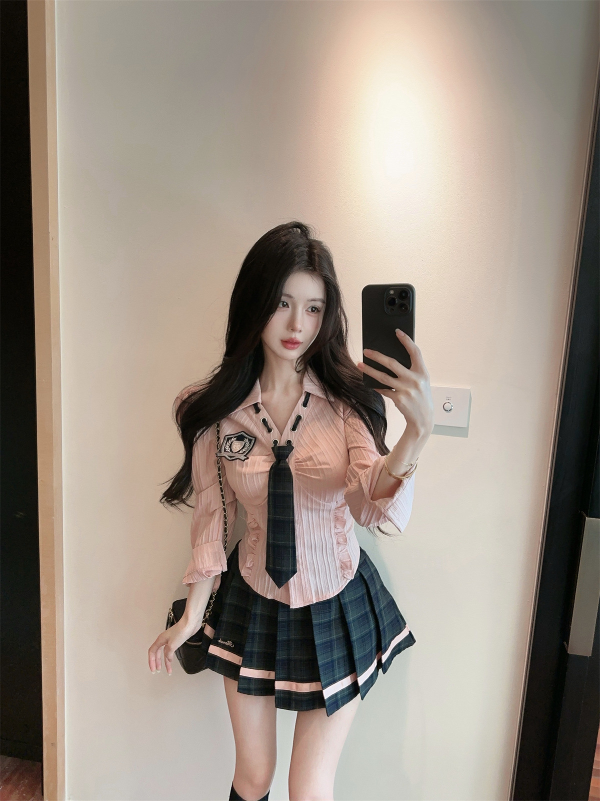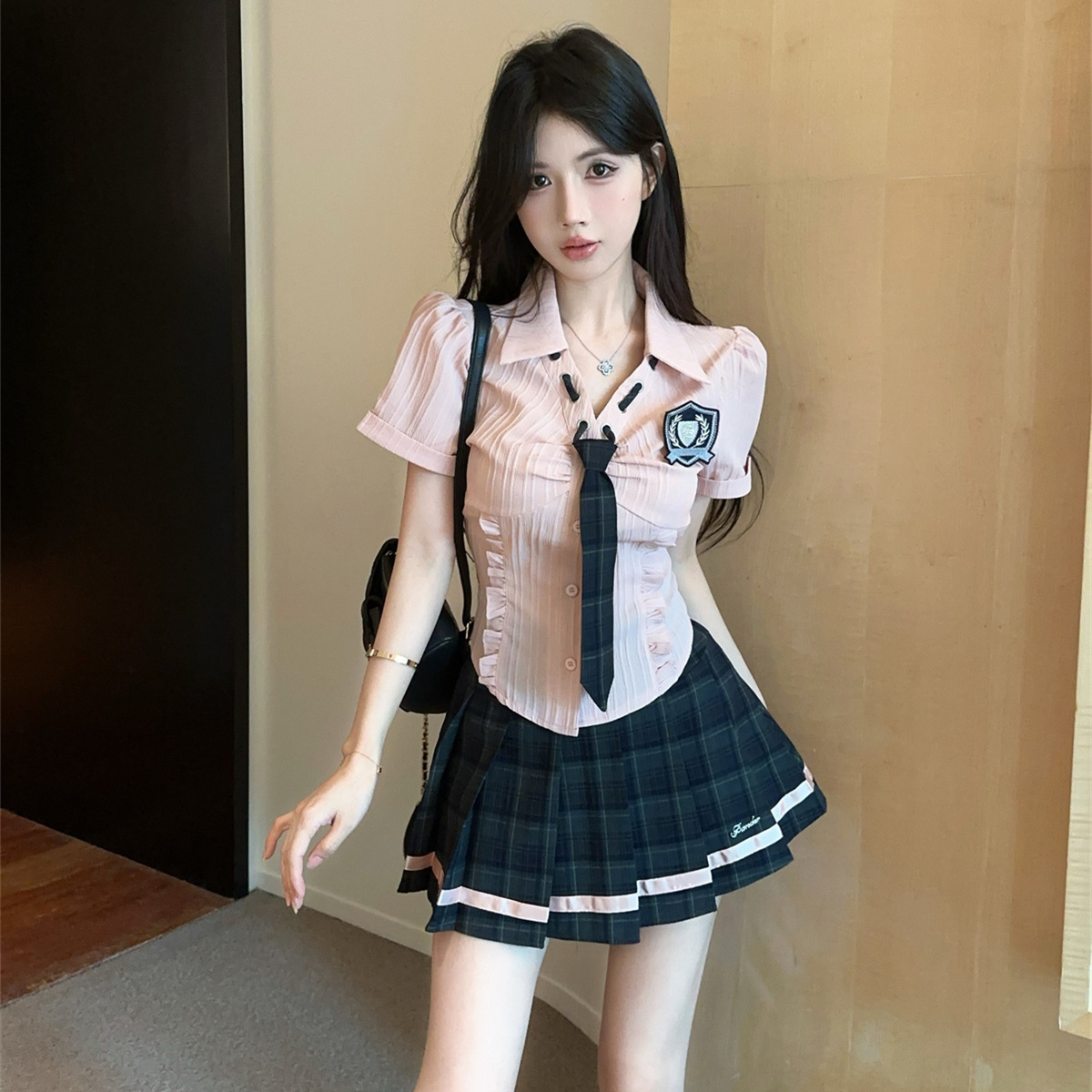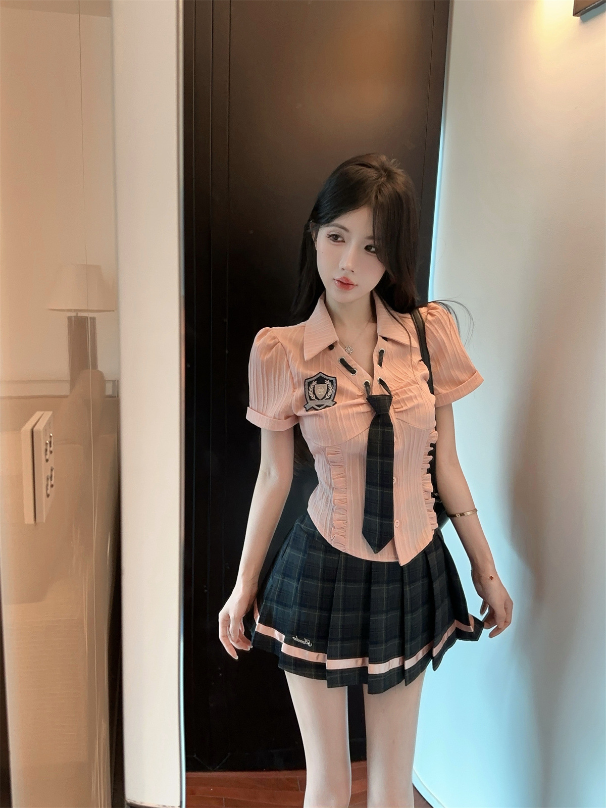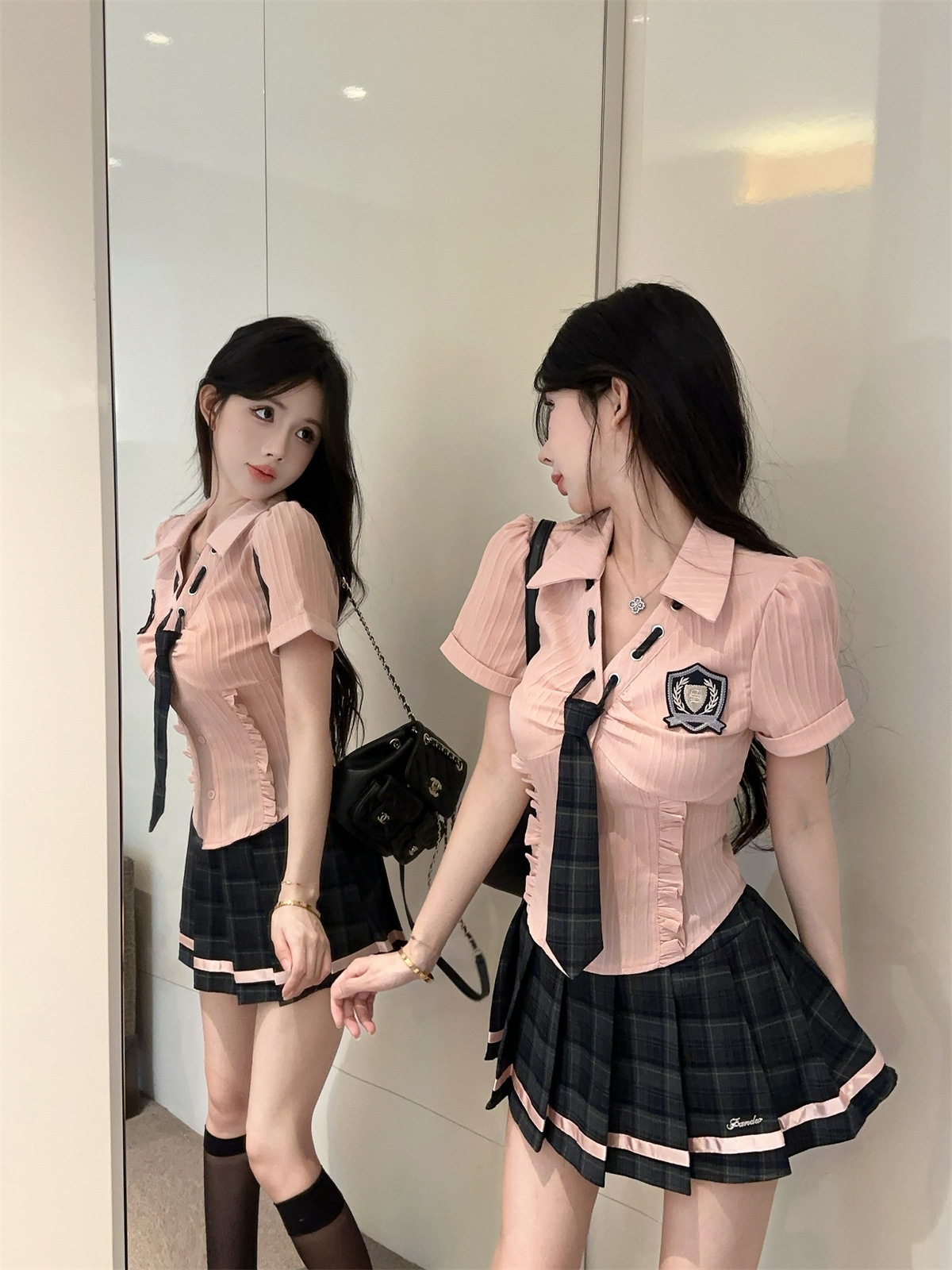 значок галстука на рубашке; клетчатая юбка с высокой талией; Рубашка, галстук, значок + клетчатая юбка с высокой талией.; Рубашка с длинными рукавами, галстуком и именным значком.; Рубашка с длинным рукавом, галстук, значок + юбка в клетку с высокой талией