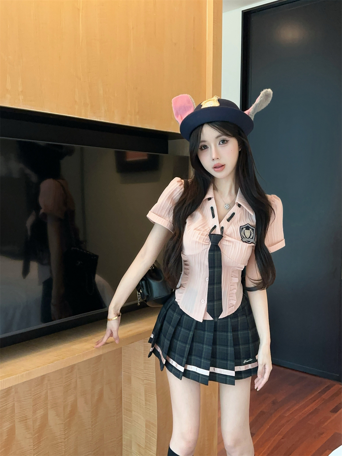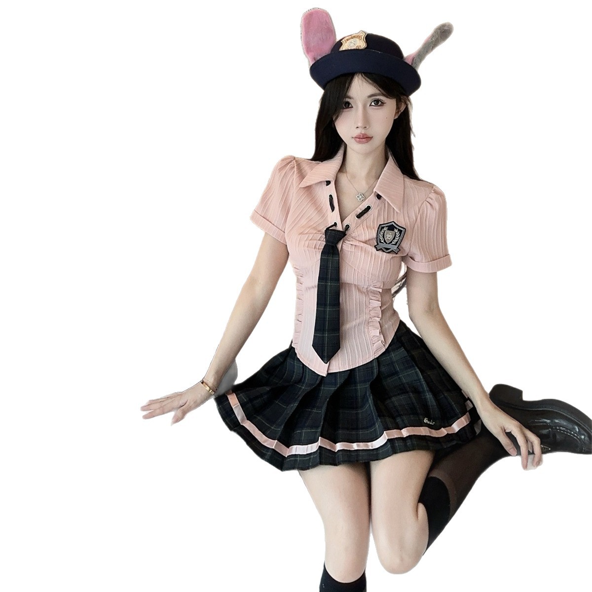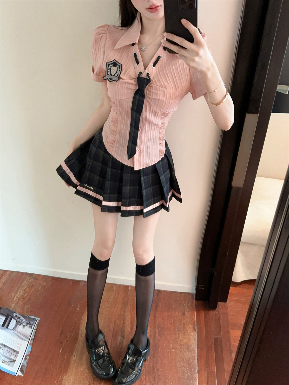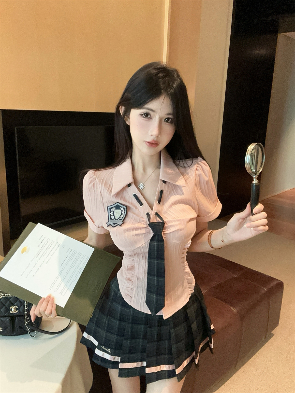 значок галстука на рубашке; клетчатая юбка с высокой талией; Рубашка, галстук, значок + клетчатая юбка с высокой талией.; Рубашка с длинными рукавами, галстуком и именным значком.; Рубашка с длинным рукавом, галстук, значок + юбка в клетку с высокой талией