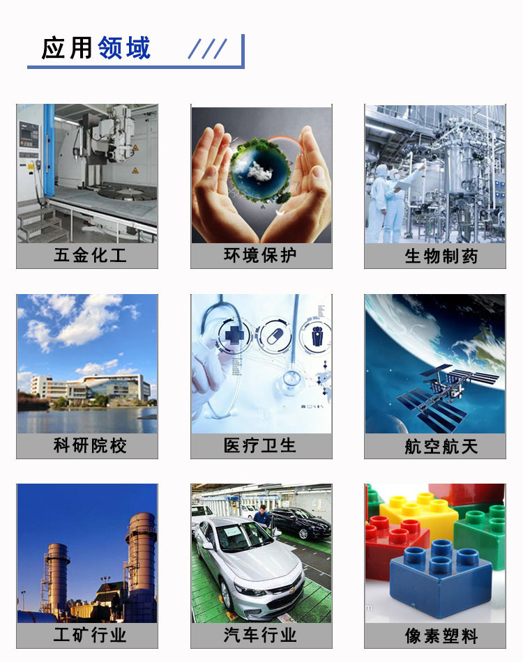 Используется в таких отраслях, как электроника, электроприборы, мобильные телефоны, средства связи, приборы, транспортные средства, пластиковые изделия, металлы, продукты питания, химикаты, строительные материалы, медицина, аэрокосмическая промышленность и т. д. для тестирования.