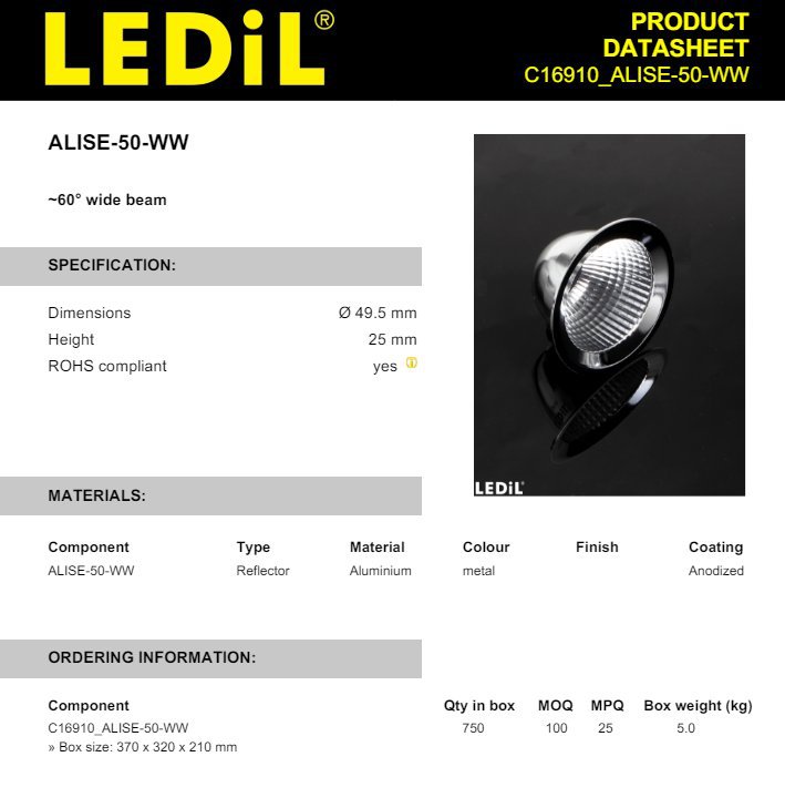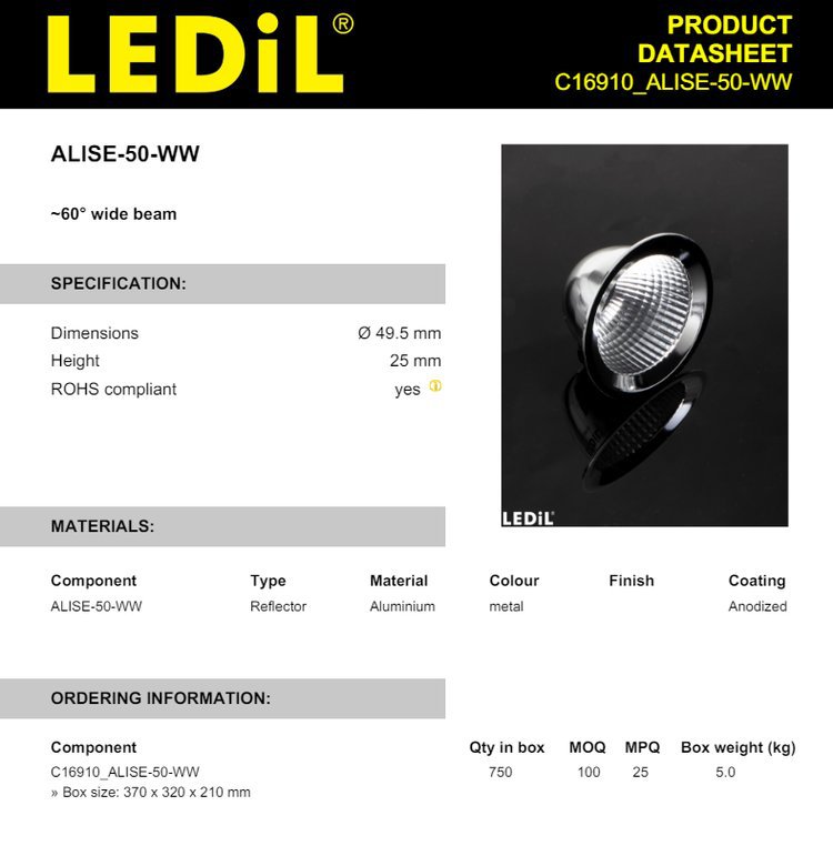 Сменная светодиодная линза-отражатель LEDiL 2025 C16910 ALISE50WW, диаметр 49.5, высота 25, специальная серия.
