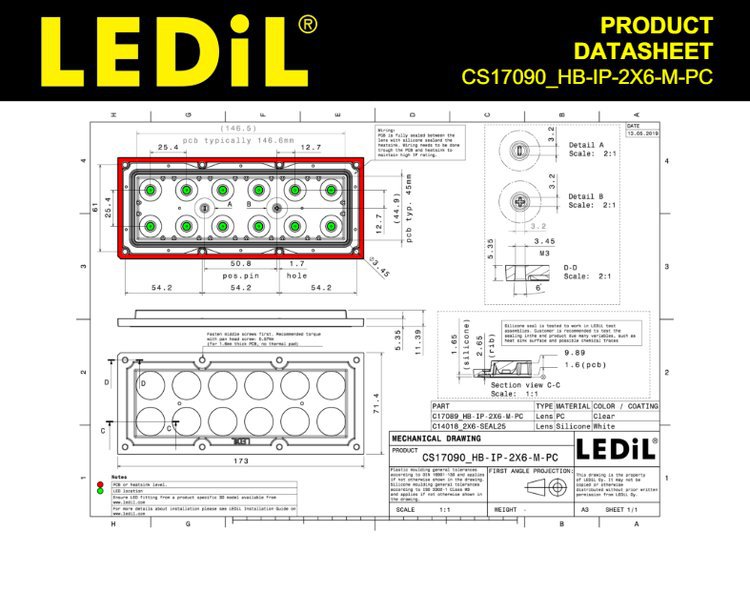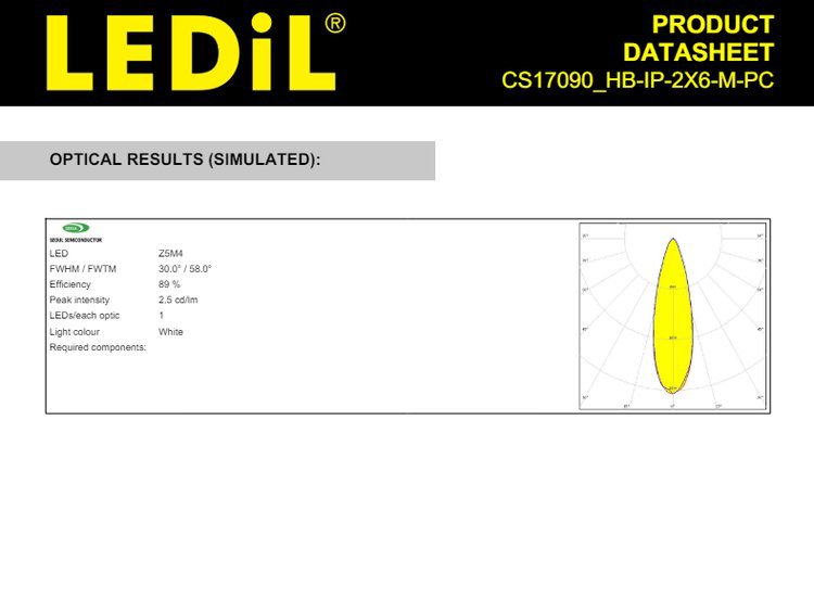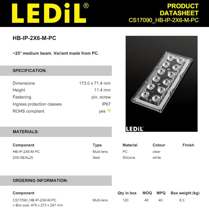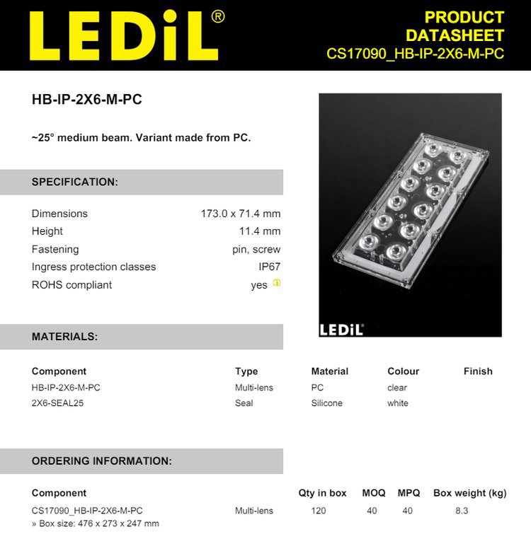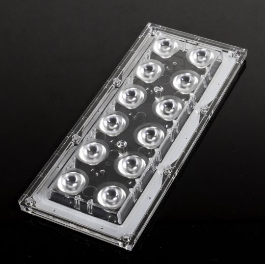 Линза LEDiL 173x71 мм из поликарбоната, изготовленная методом точного литья под давлением, для коммерческого использования в помещении, с высокой светопропускаемостью, экологически чистая, сертифицированная.
