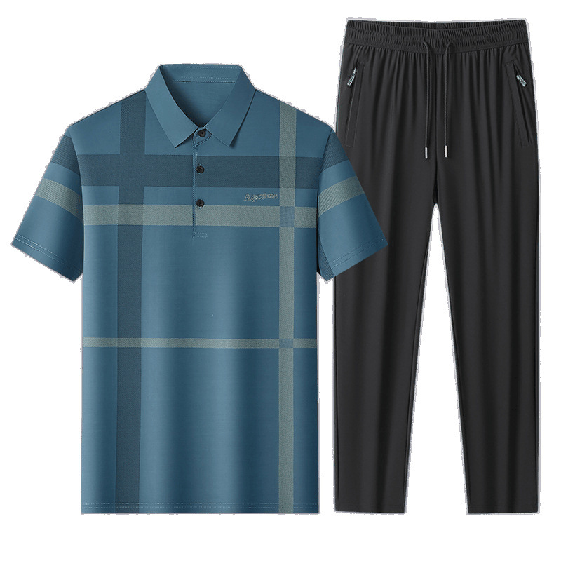 Костюмы для среднего и пожилого возраста, быстросохнущие рубашки-поло с лацканами для папы, брюки с короткими рукавами, летние повседневные костюмы из ледяного шелка из двух частей.
