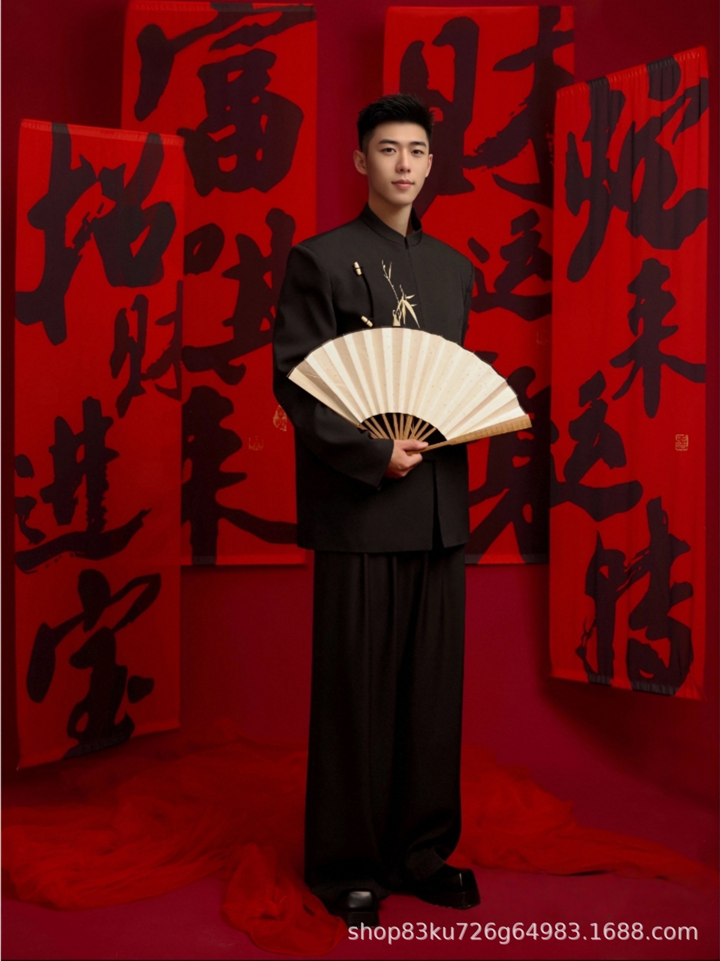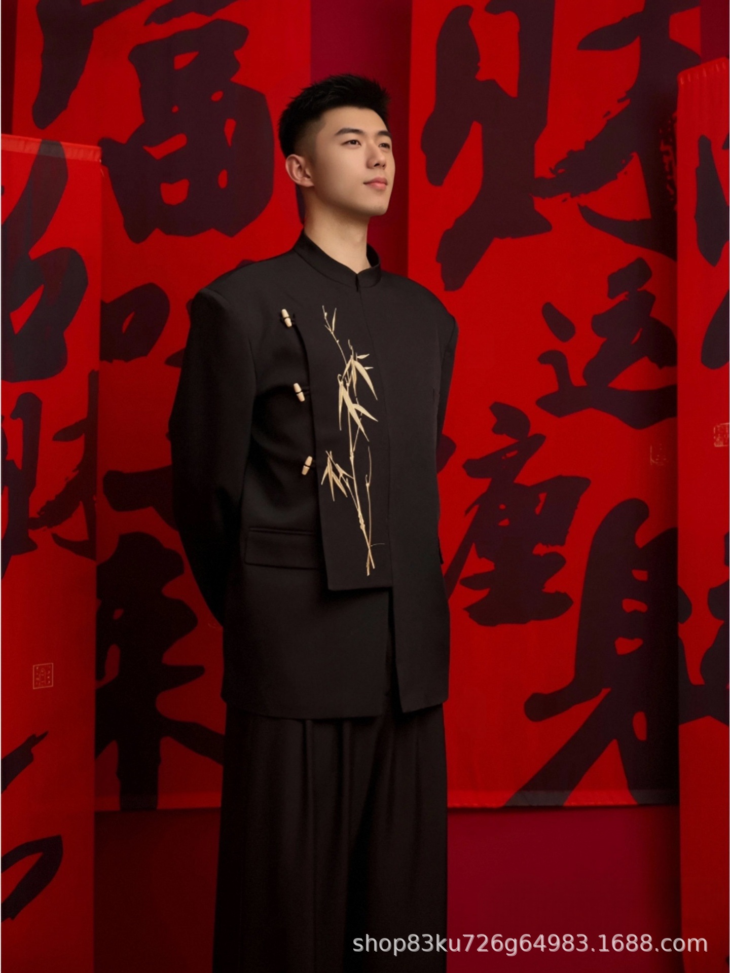 Летний костюм в китайском стиле с воротником-стойкой и золотой вышивкой бамбука, наряд для жениха на помолвку и свадьбу
