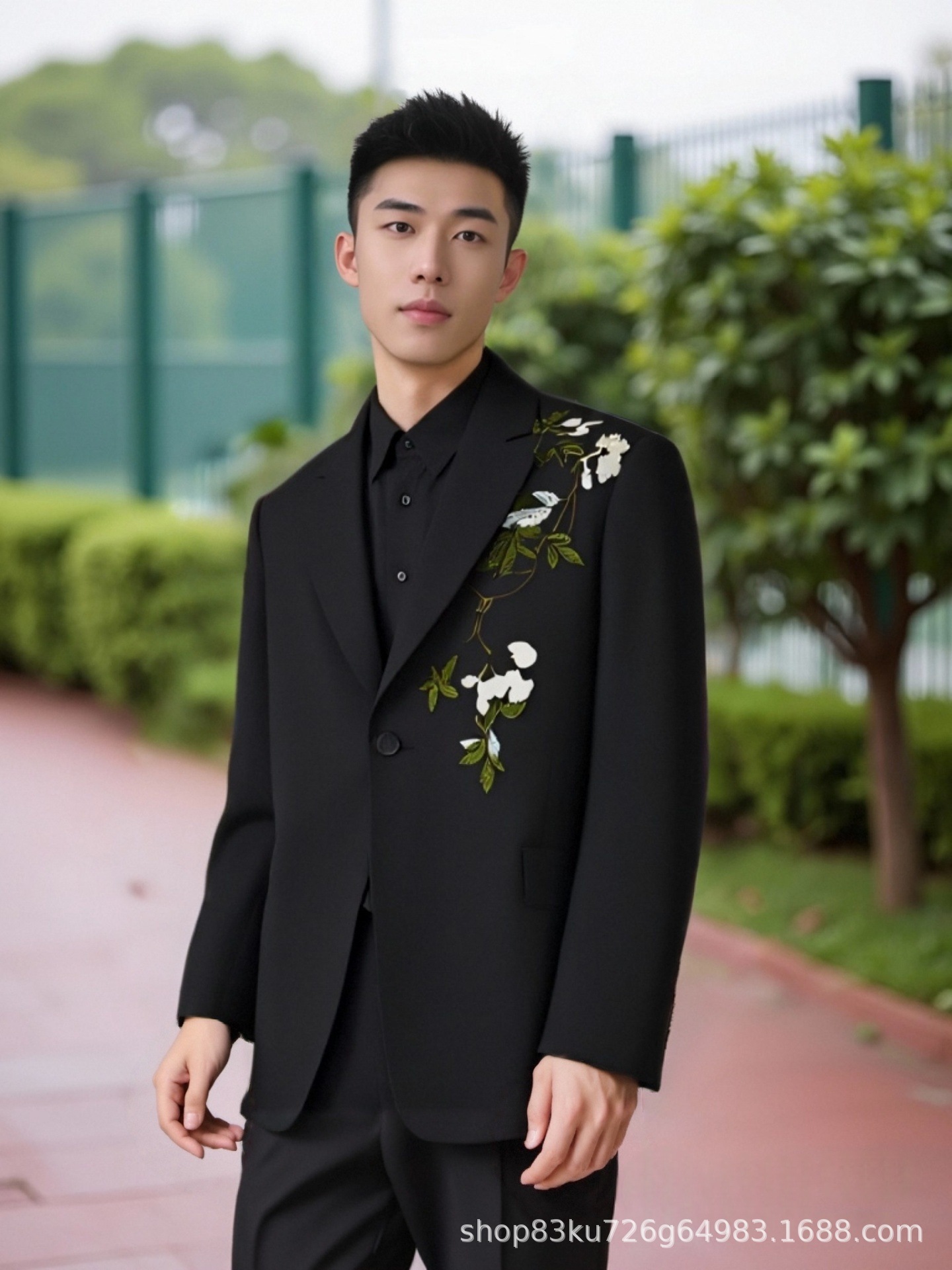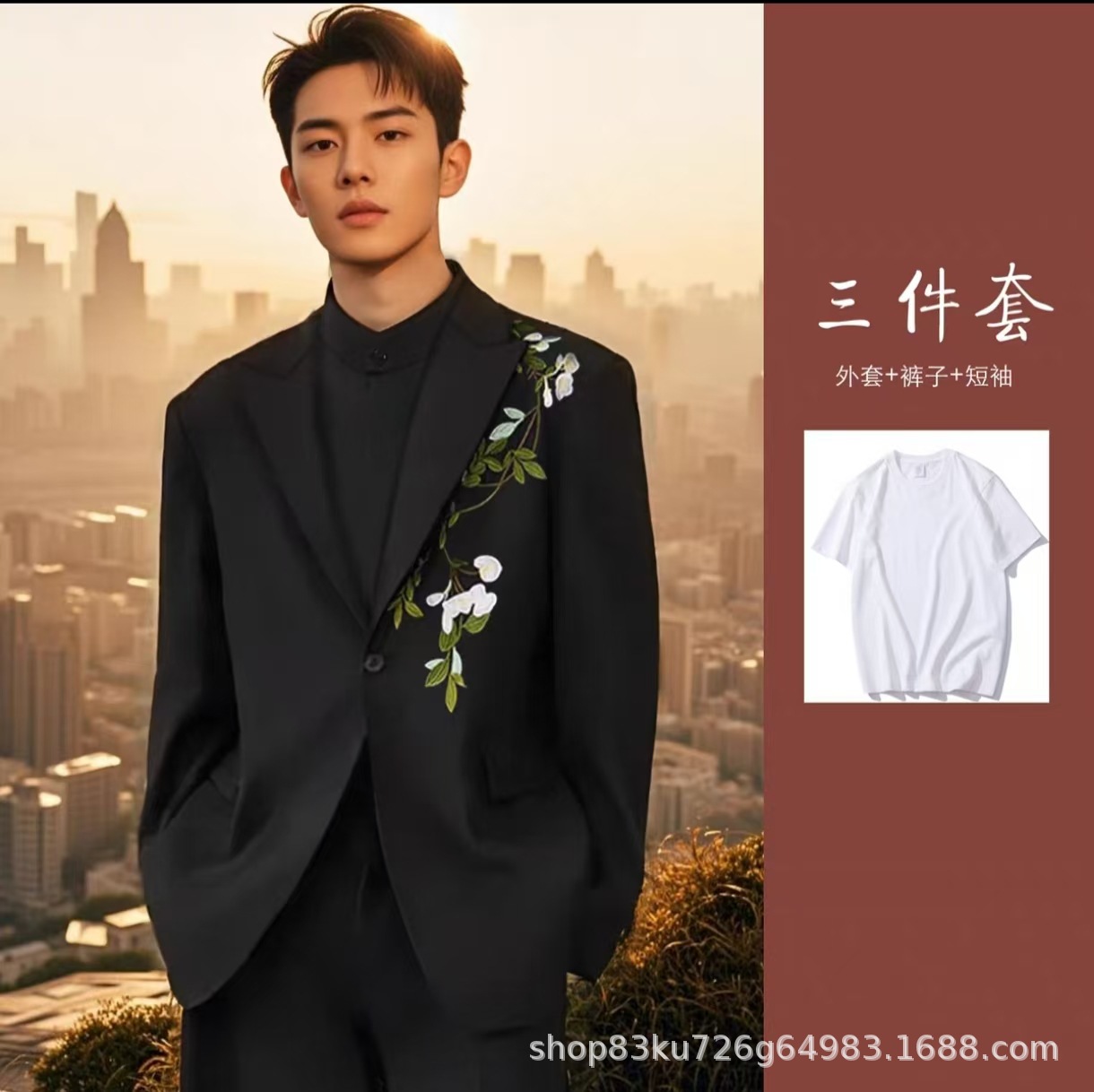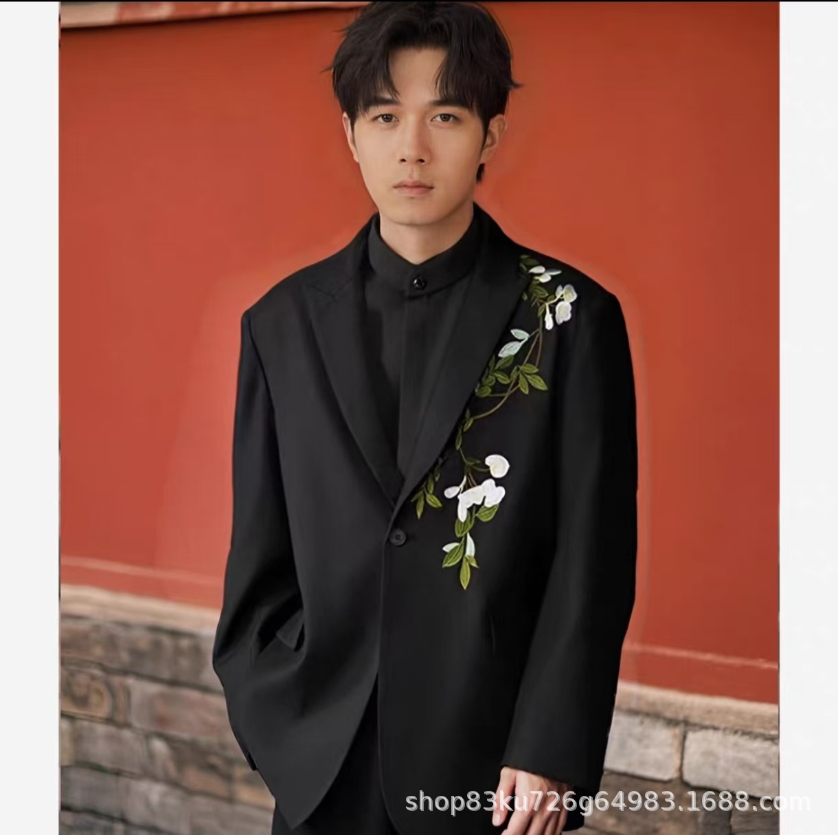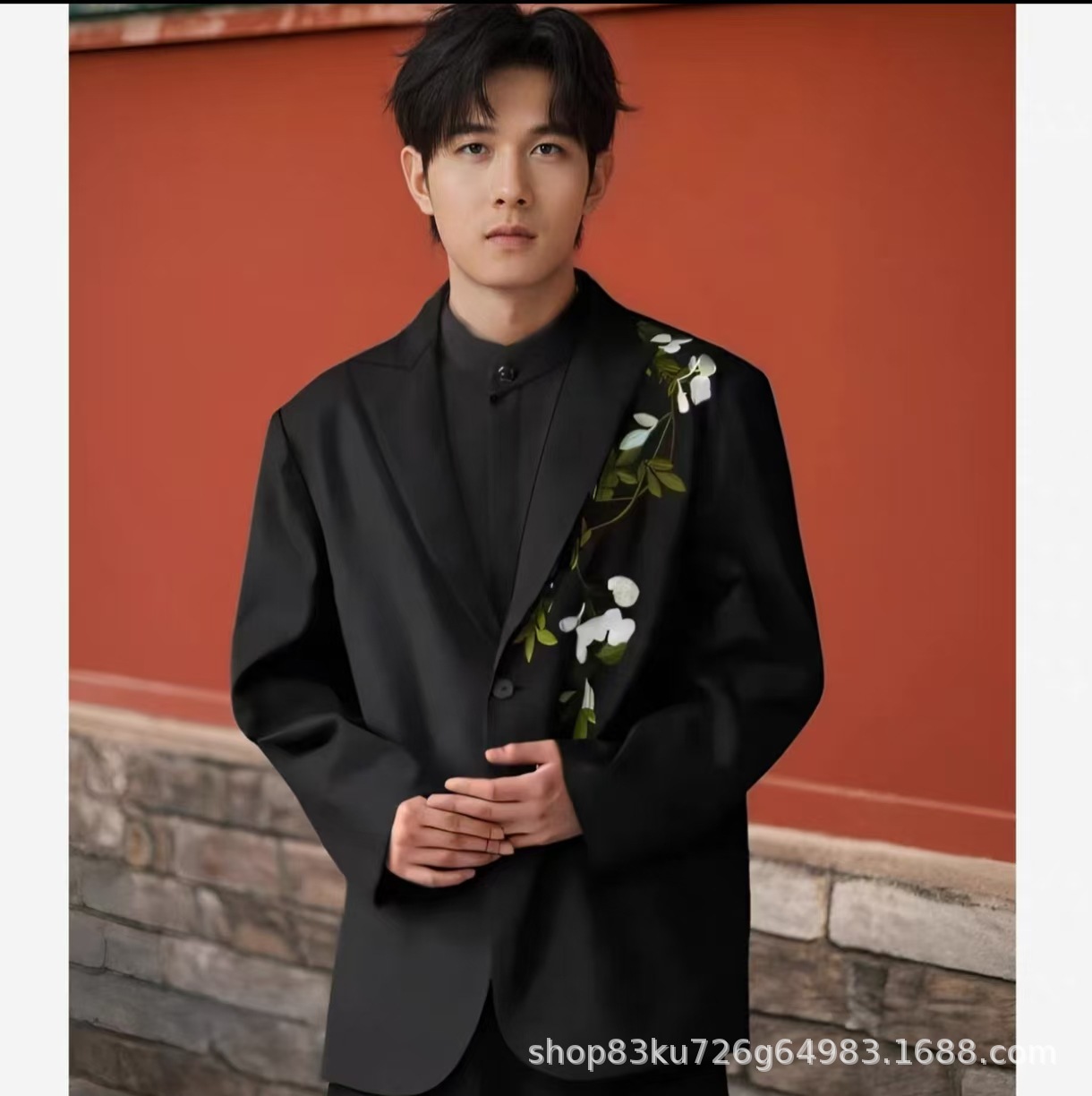 Новый костюм в китайском стиле 2025 года с вышивкой камелией, свободный мужской пиджак в традиционном китайском стиле, костюм Чжуншань для жениха на помолвку и свадьбу.