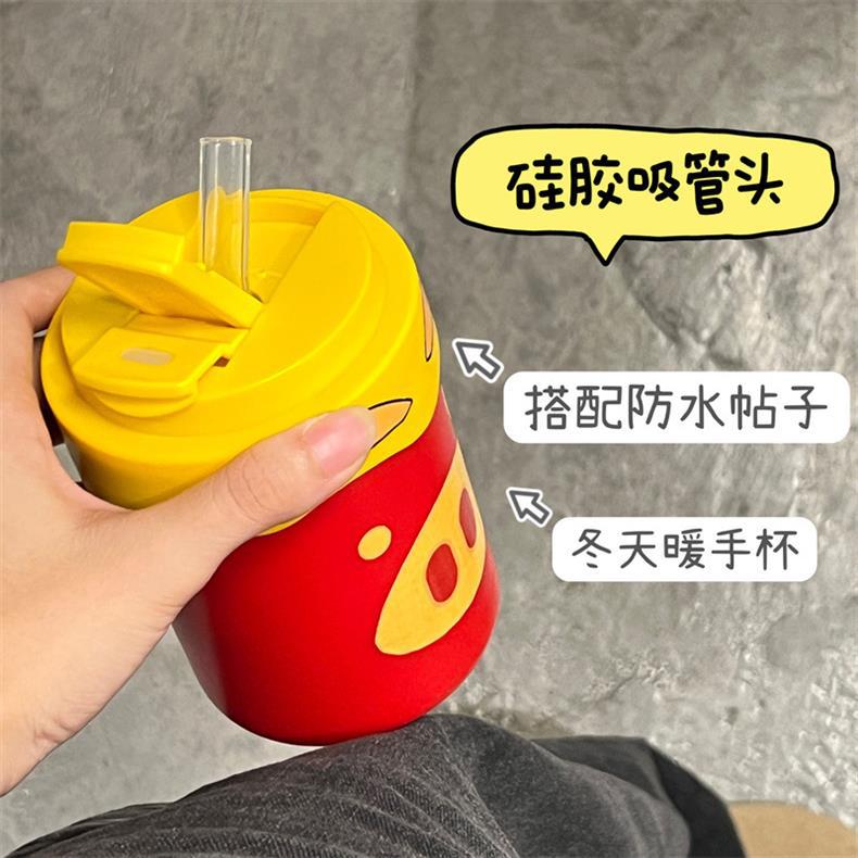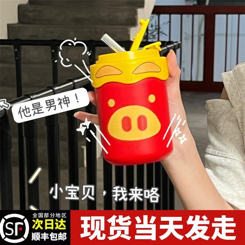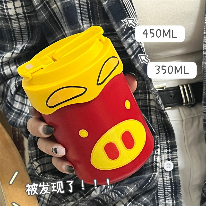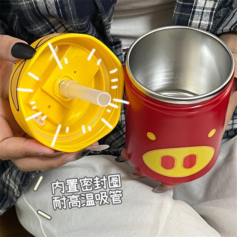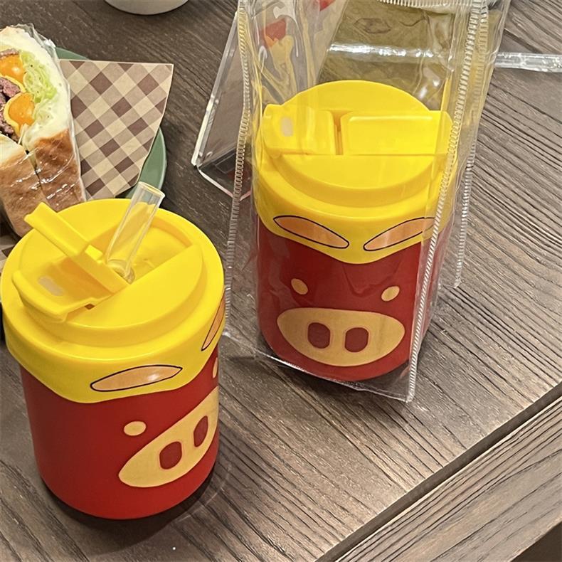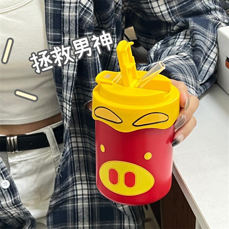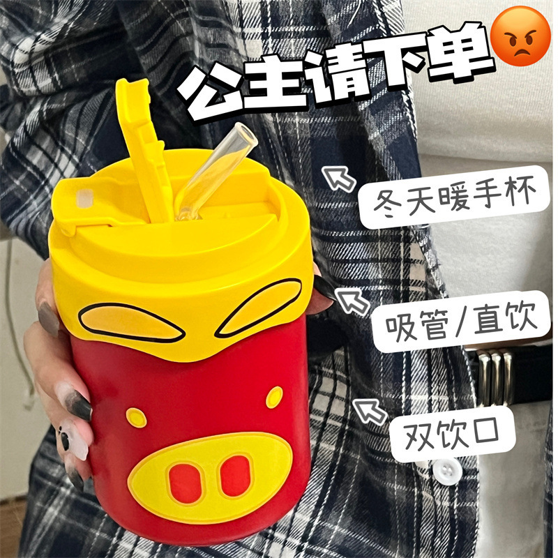 Новая милая чашка GG Pigman с двойной соломинкой для питья, портативная чашка для кофе, студенческая женская чашка-термос большой емкости