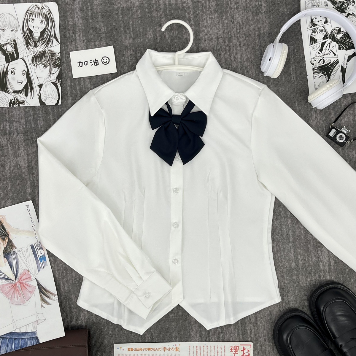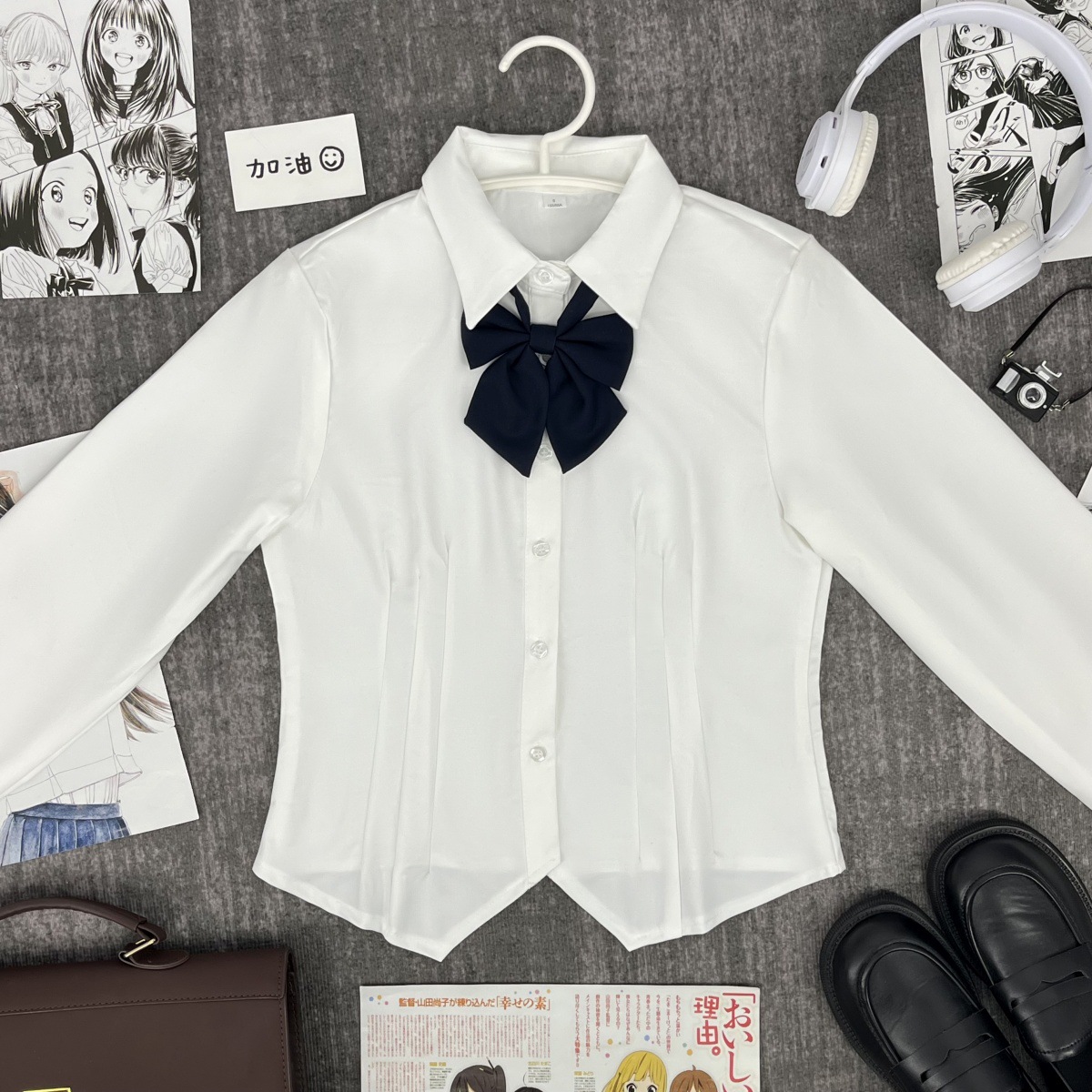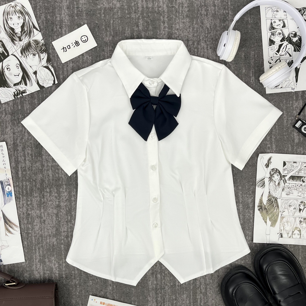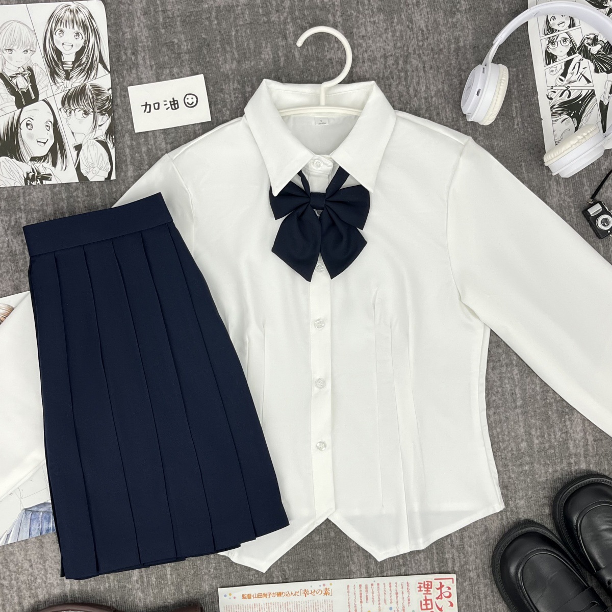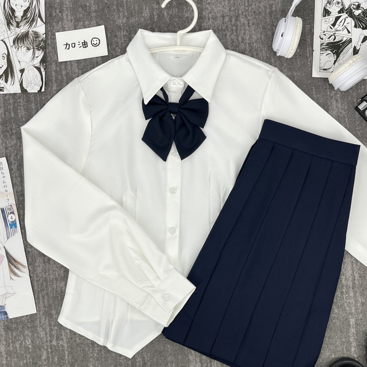 Белая рубашка с короткими рукавами на талии + голубой галстук-бабочка + голубая юбка А-силуэта.; Белая рубашка с талией и длинными рукавами + голубой галстук-бабочка + голубая юбка А-силуэта.; Белая рубашка с короткими рукавами и талией + голубой галстук.; Белая рубашка с талией и длинными рукавами + голубой галстук-бабочка; Синяя юбка А-силуэта + носки