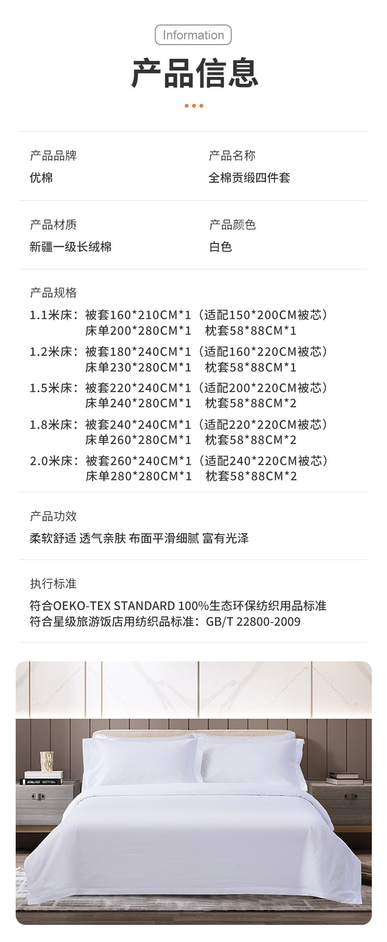1.2m кровать (только пододеяльник 180*240, простыни 200*280, наволочки 58*88*1); 1.5m кровать (одеяло 220*240, простыни 240*280, наволочки 58*88*2 шт.); 1.8m кровать (квиховик 240*240 простыней 270*280 наволочки 58*88*2 шт.); 1.8m кровать очень большая (одеяло 260*240, простыни 280*280, наволочки 58*88*2 шт.)