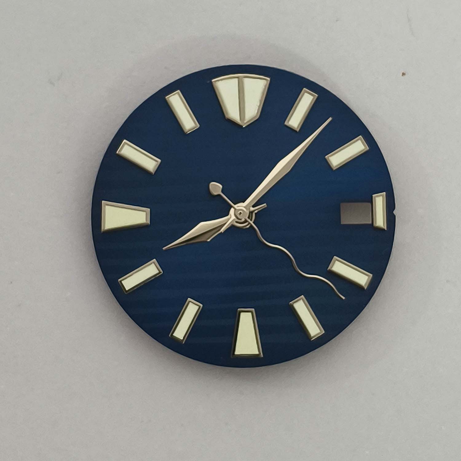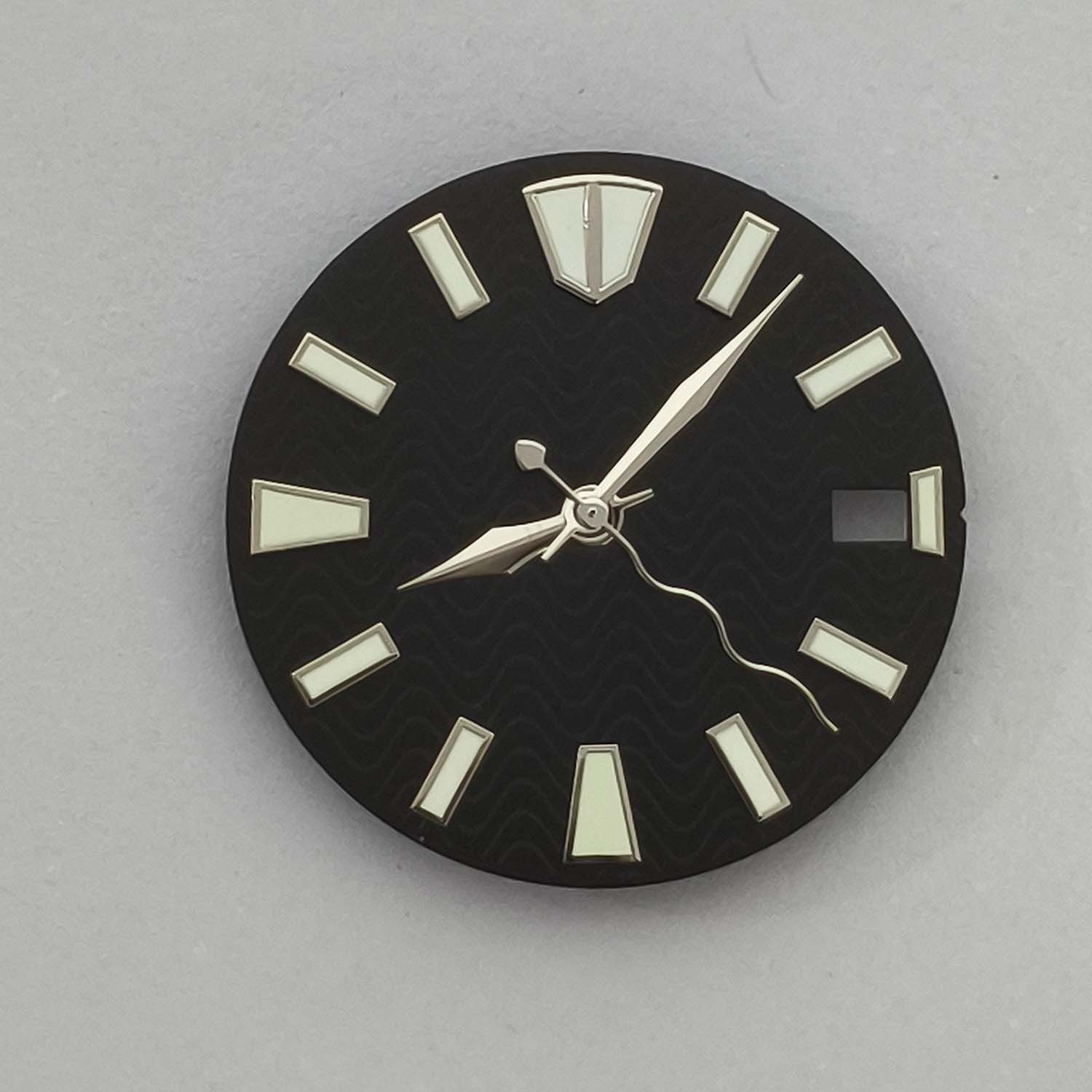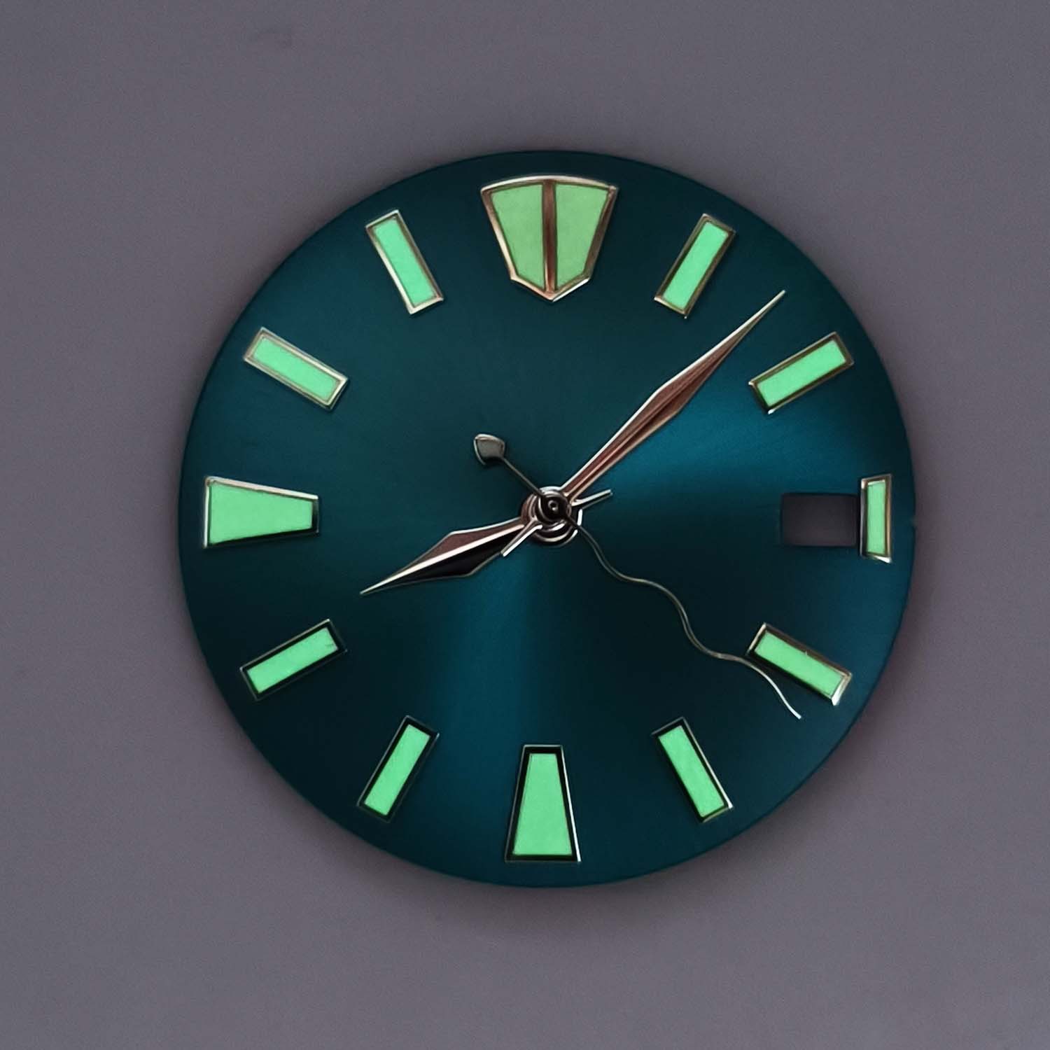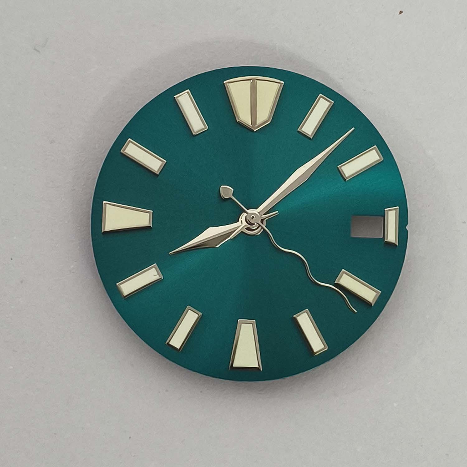 28,5 мм солнечный узор, буквальный зеленый светящийся металлический циферблат + стрелки, подходящие для механизма NH35/36/7S