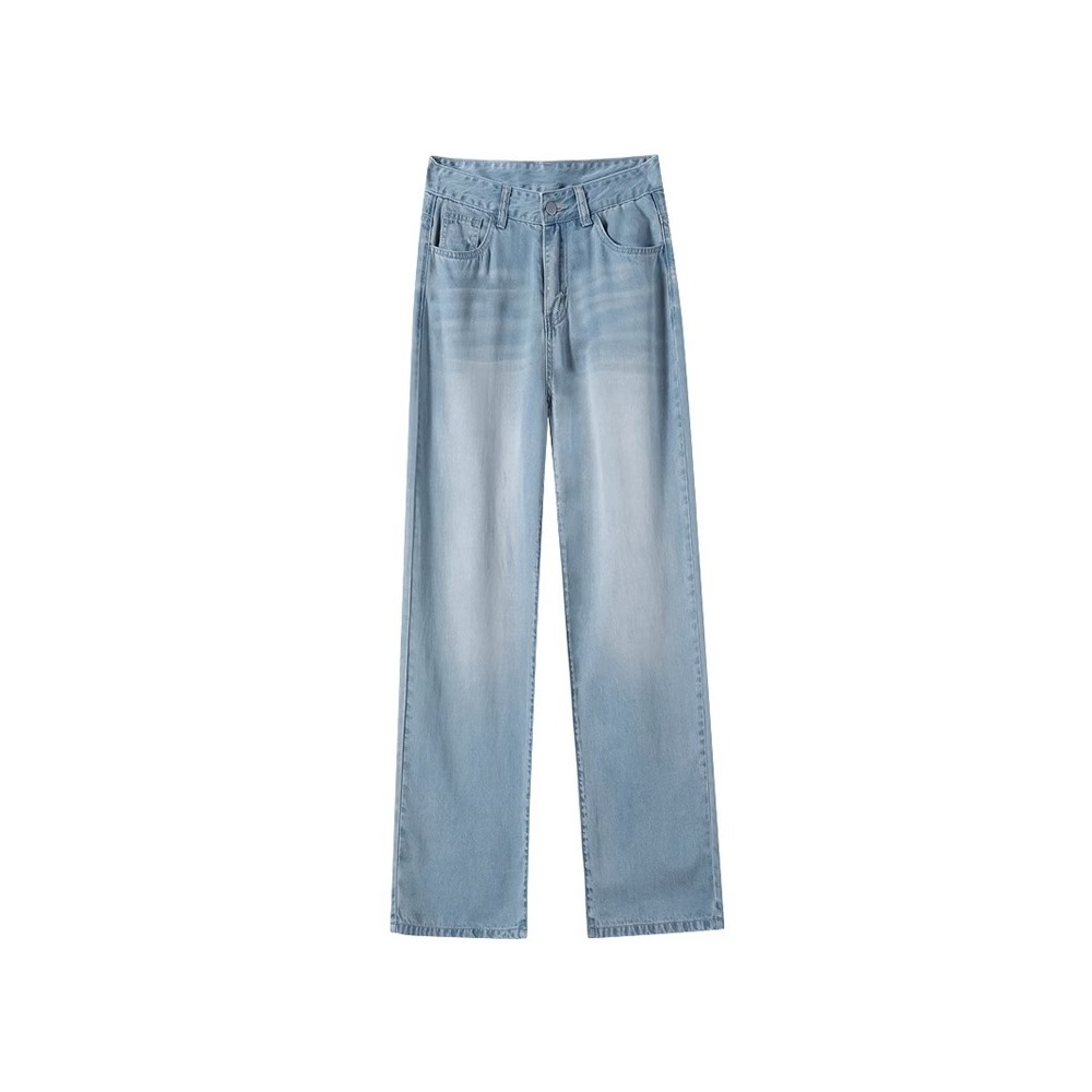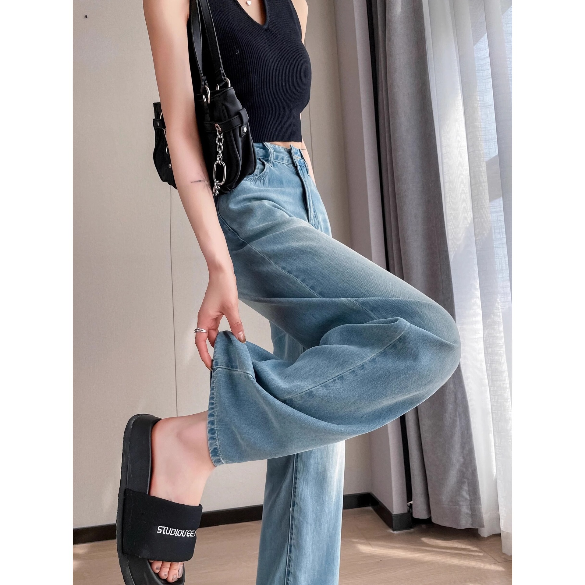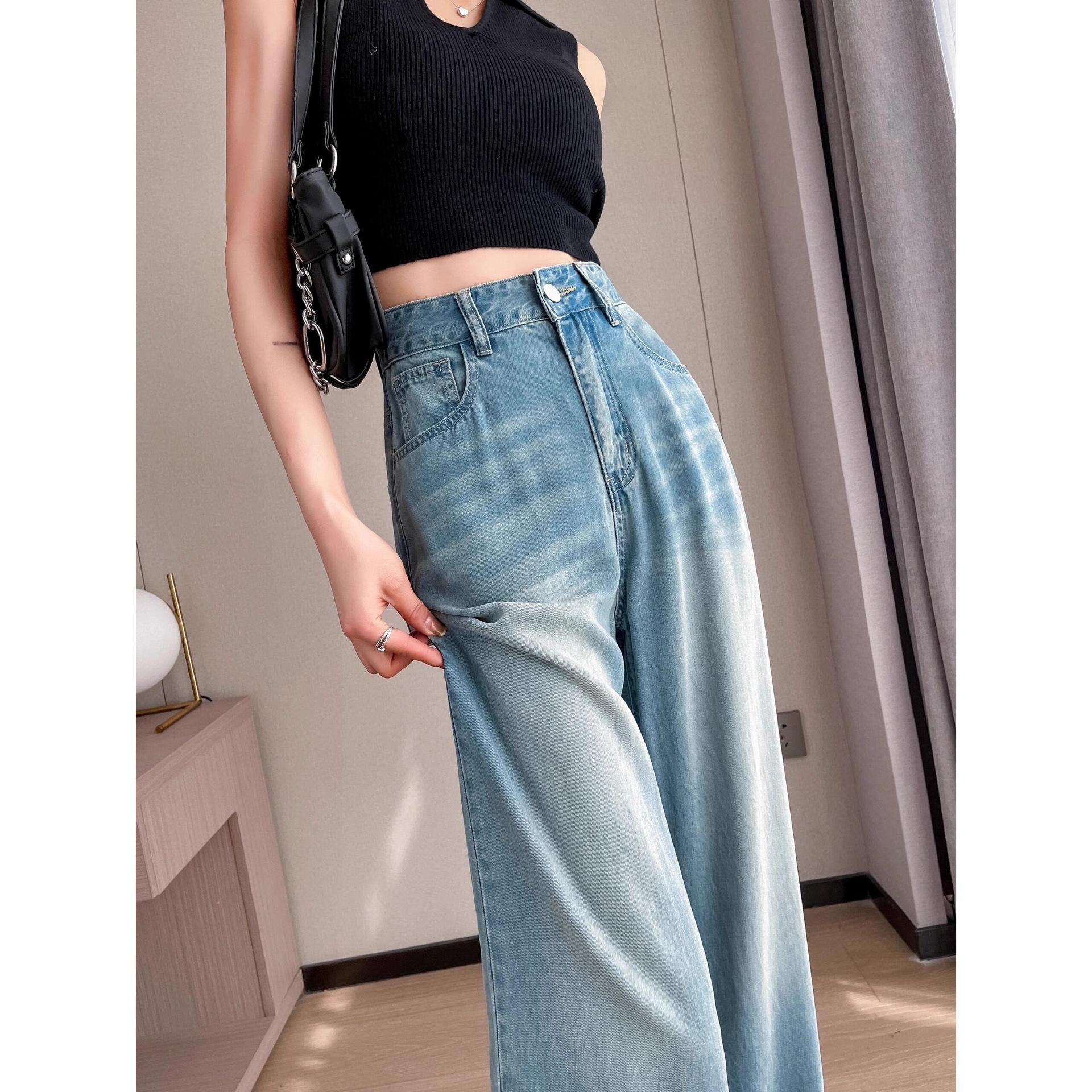 Светло-голубые женские джинсы из тенселя, летний тонкий стиль, фигура груши больших размеров, завышенная талия, свободная драпировка, широкие брюки из ледяного шелка.