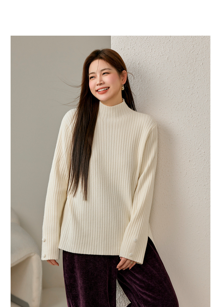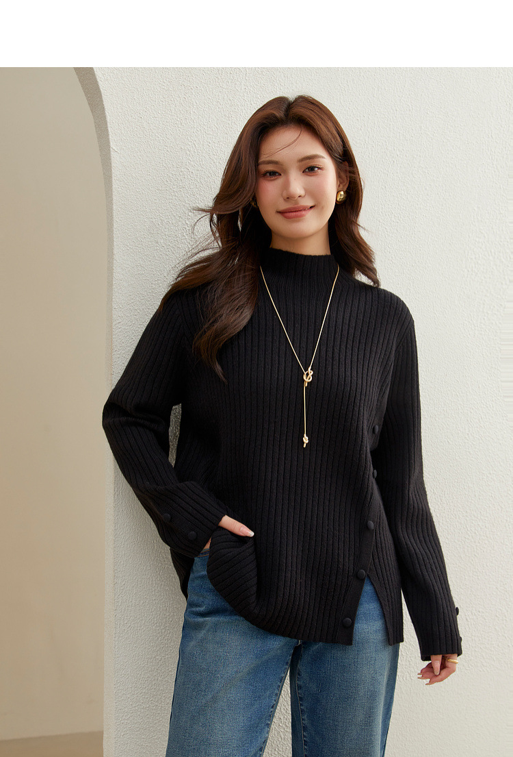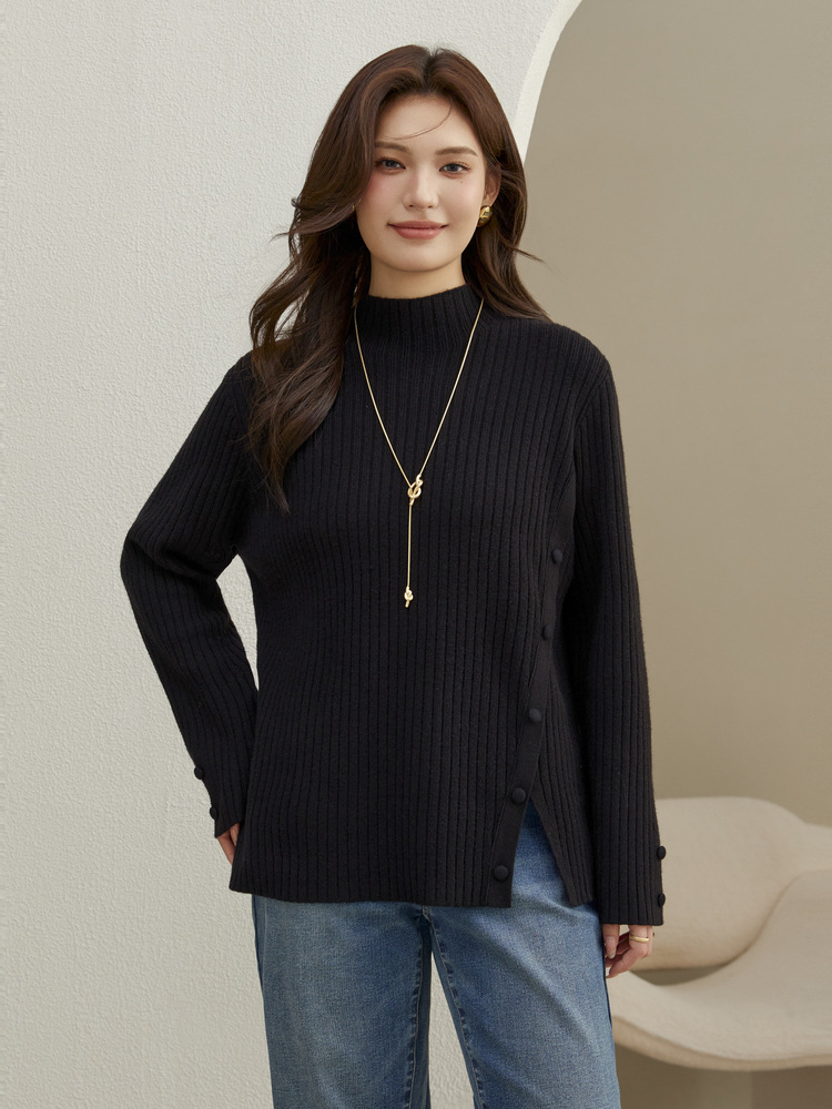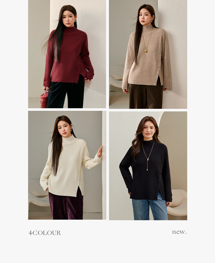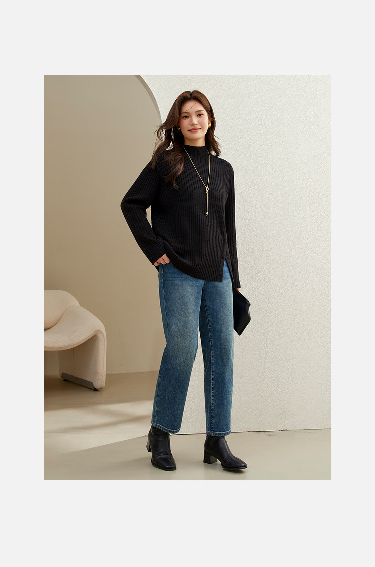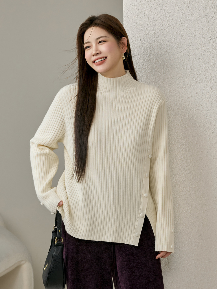 Женский модный свитер больших размеров в корейском стиле с высоким воротником и разрезом по подолу, универсальный и теплый, для полных женщин, новая модель зимы 2024 года.