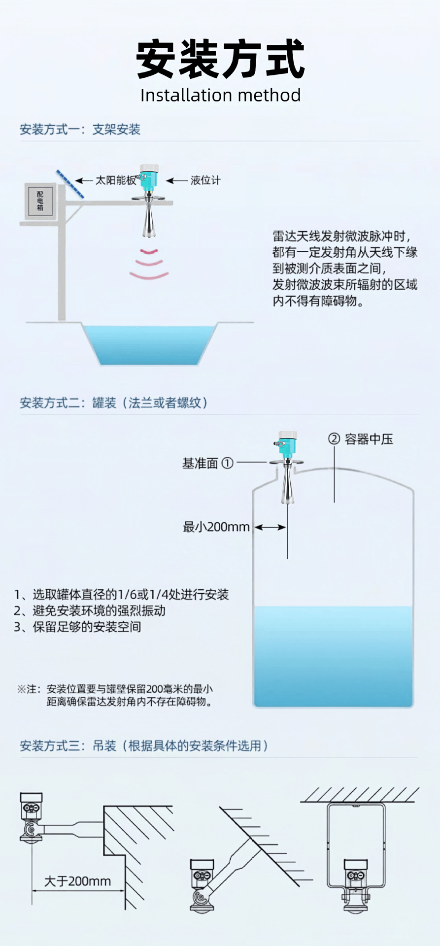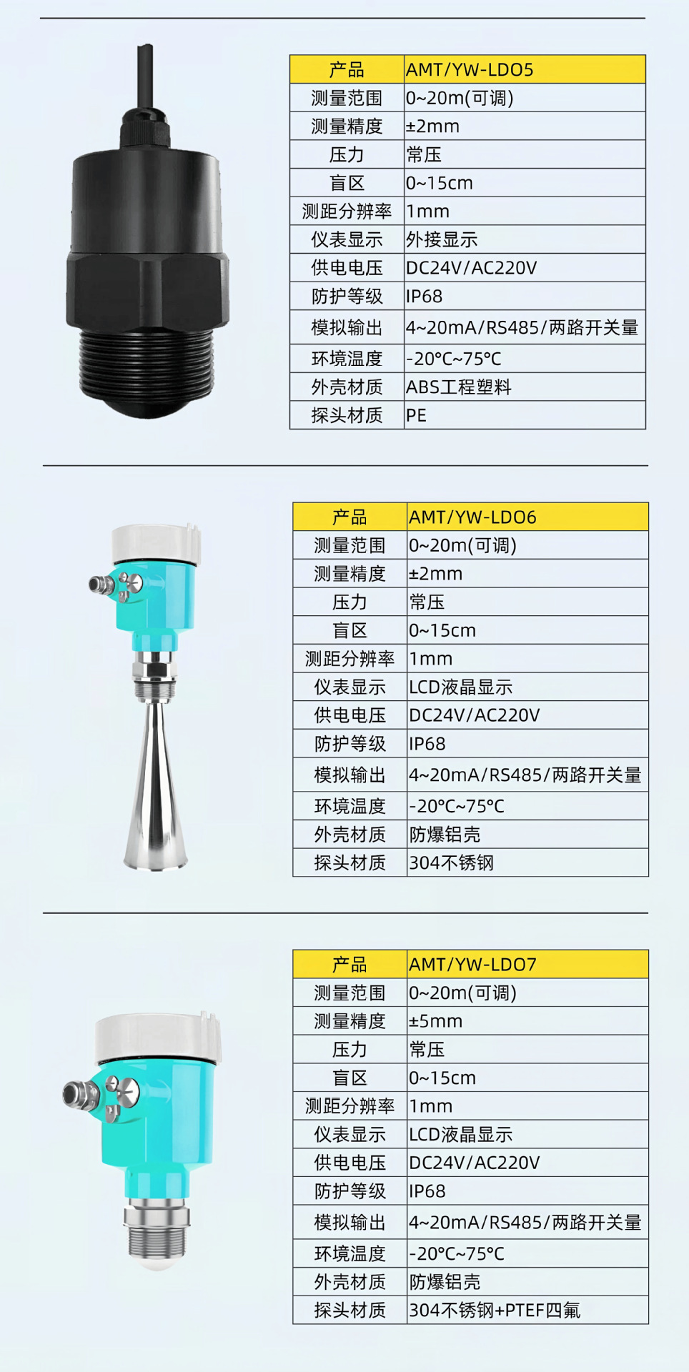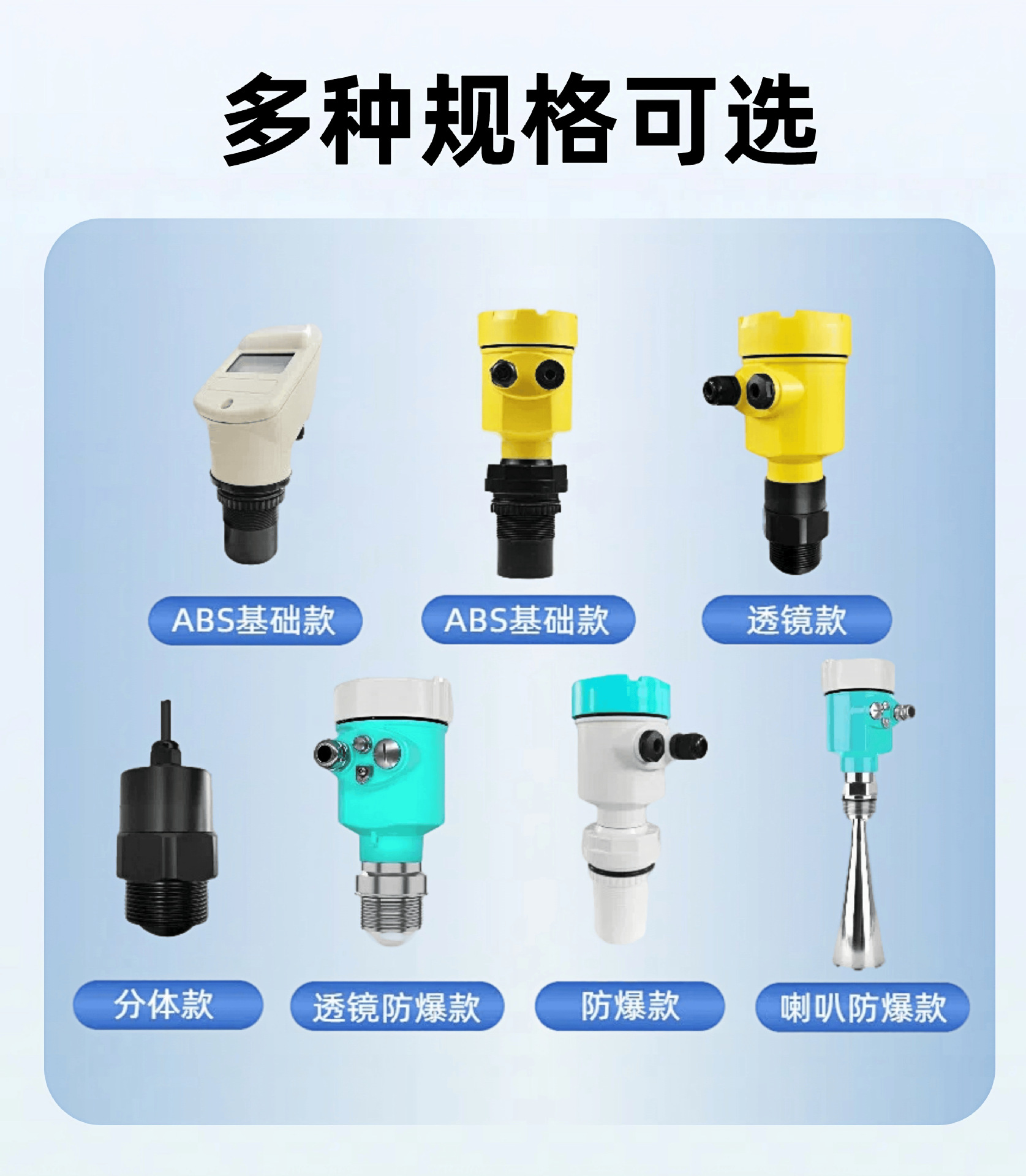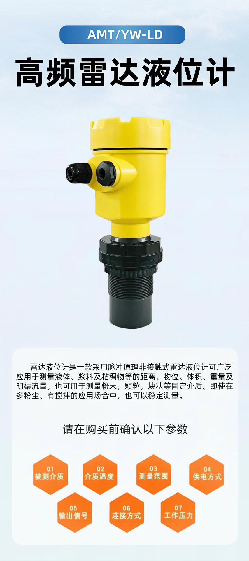 Базовый радарный уровнемер (0-10 м); Базовый радарный уровнемер (0-15 м); Радарный измеритель уровня жидкости из ПТФЭ (0-20 м); Радарный измеритель уровня жидкости с линзой (0-20 м); Радарный уровнемер с разделенной линзой (0–20 м); Взрывозащищенный звуковой радарный уровнемер (0-20 м); Взрывозащищенный линзовый радарный измеритель уровня жидкости (0-20 м); Консультация по нестандартной настройке радара уровня жидкости