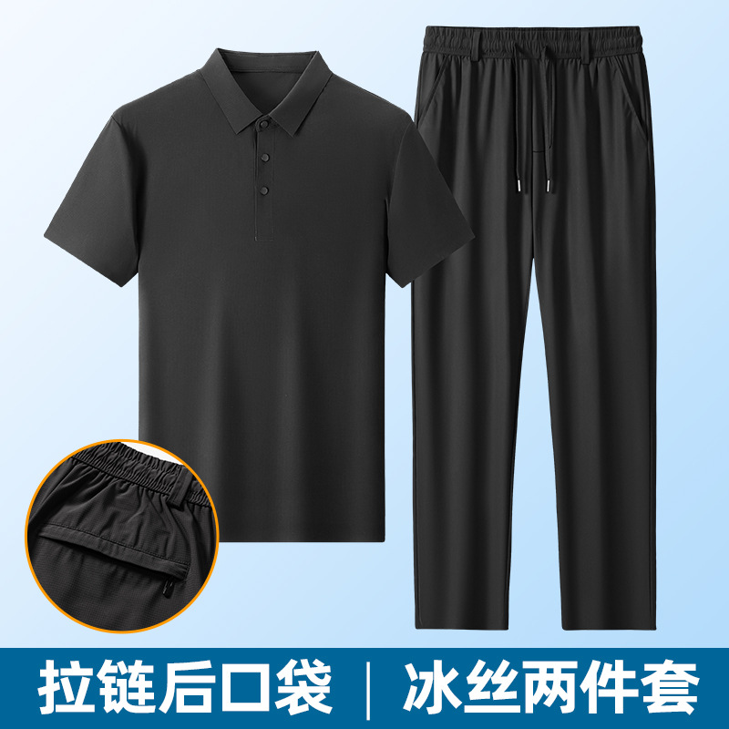 Летний бесшовный костюм из ледяного шелка, мужская футболка с короткими рукавами, мужская рубашка-поло, повседневные брюки, костюм для среднего и пожилого возраста, костюм для папы
